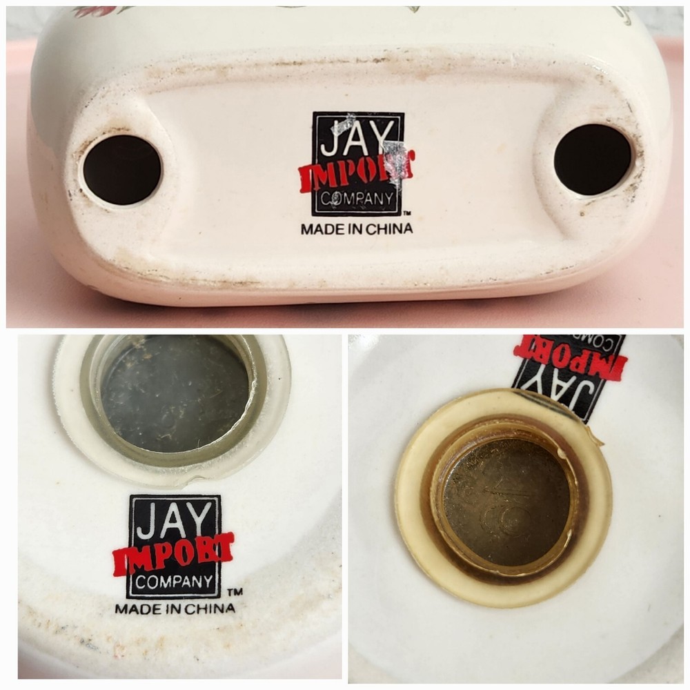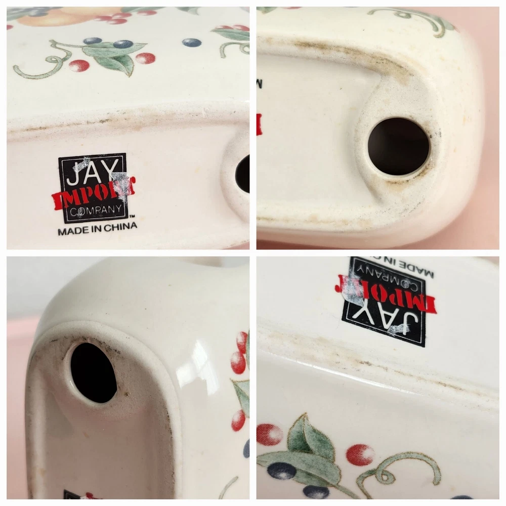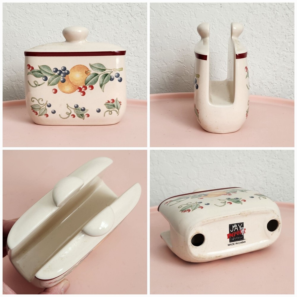 Set Of 3 Vintage Jay Imports Ceramic Napkin Holder and Salt And Pepper Shakers Fruit Pattern Color: White Dimension: Napkin Holder: approx 4.5" x 4.75" x 2.25" Salt and Pepper Shakers: approx 3.5" tall, 2.25" diameter Pre-owned, clean and in good condition. No chips, no cracks. Yellow discoloration on plastic stopper of pepper shaker, to be expected from use. Please see photos for your reference as they are also part of the description. This is the actual item that you will receive. I take great care in packing my items for shipping so they will reach you safely. Please check out my other listings. I offer combined shipping for multiple purchases. Buyer may choose between economy and expedited shipping options. Contact me for your questions. Thank you! 25-231228-T7HNS