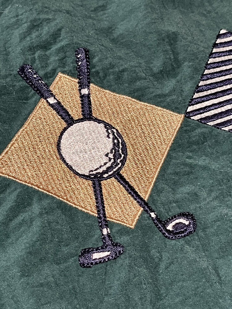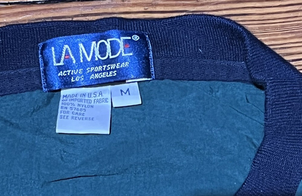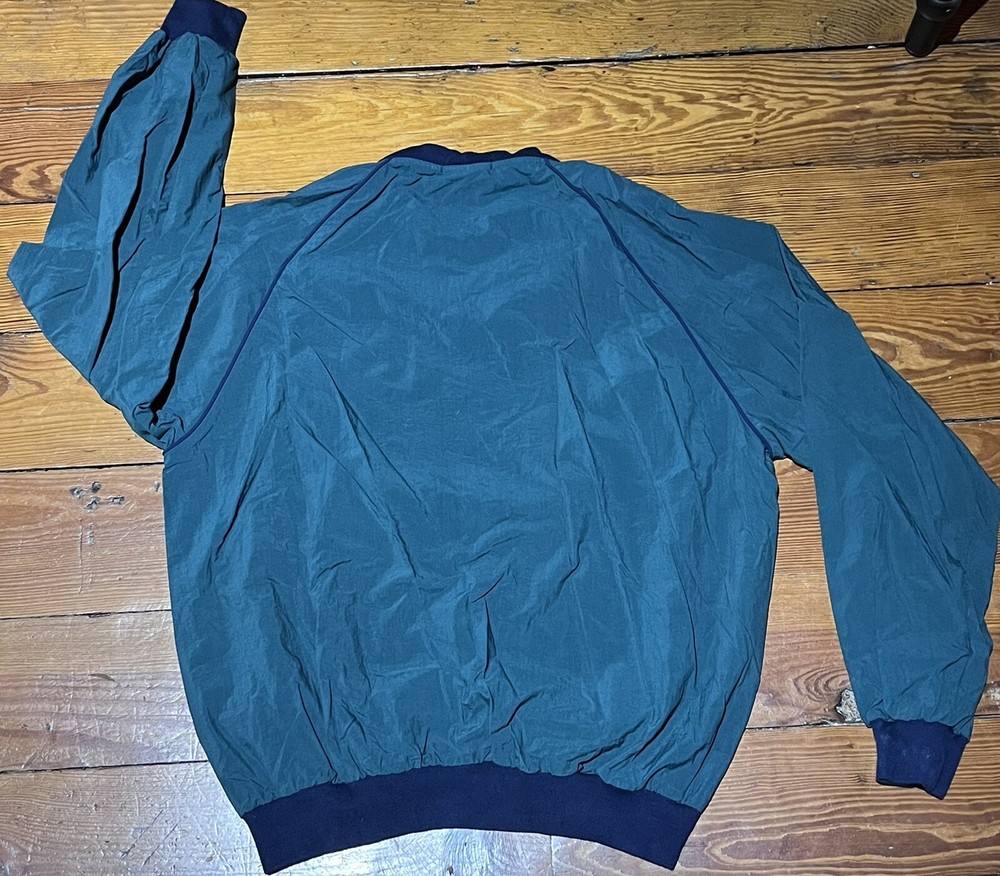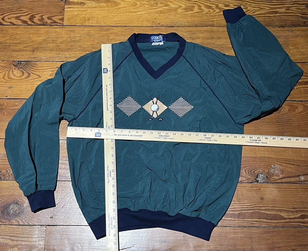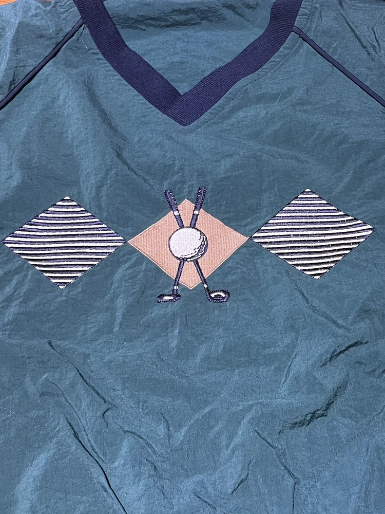 Vintage La Mode Acrive Sportswear Pullover/Wind Breaker Embroidered Golf Clubs and Ball design on front V Neck Banded waist and wrists *Green with blue trim - 1st and 2nd photos best represent the green color* Made in the USA Pre-owned. No issues to note! Please take a look at pictures and ask any questions prior to purchase Thank you for looking!