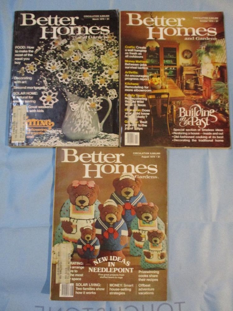 Vtg Lot of 3 1979 Better Homes and Gardens Magazines Crafts Recipes Food Decor Vtg Lot of 3 1979 Better Homes and Gardens Magazines Crafts Recipes Food Decor Description If purchased at the lowest possible price currently available on eBay these would cost you more than $40! Buy here and save HUGE or re-sell and make money! All pages are clean, complete, securely attached to spine. These have a slight old-paper smell. Some minor cover wear and address labels on front cover. Includes: March 1979 August 1979 October 1979 Pictures should tell the story, but please ask if you have questions. No fine print here! We are just honest, hard-working folks trying to make a living. We take excellent care of our customers because we truly appreciate your business! Click image to enlarge Pictures sell! Auctiva offers Free Image Hosting and Editing. 300+ Listing Templates! Auctiva gets you noticed! The complete eBay Selling Solution. Track Page Views With Auctiva's Counter
