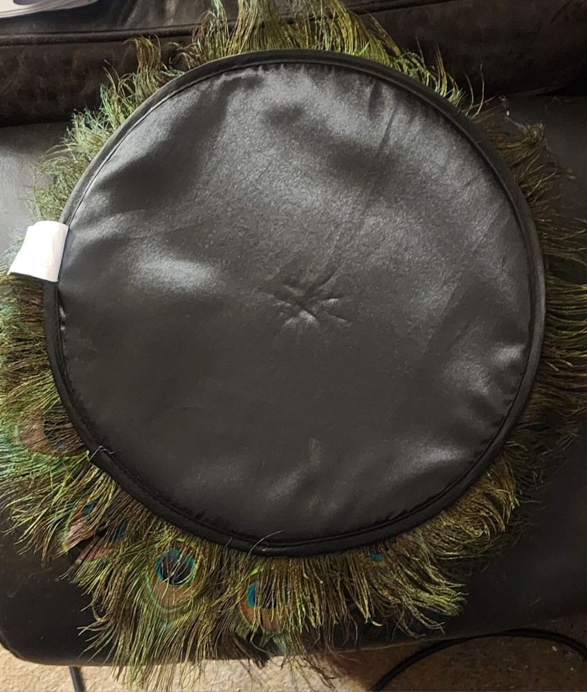 Add a touch of elegance to your dining table with this Pier 1 peacock feather counterpiece placemat set of 6. The round placemats have a diameter of 15 inches per label ( black part measures 13 1/4") and feature a stunning peacock feather design in a multicolor theme. Made of high-quality feather material, these placemats are perfect for any occasion, whether it's a formal dinner or a casual gathering with friends and family. The back of these placemats has polyester linining. The set is manufactured in China and is suitable for multipurpose use. Please view pics for details.