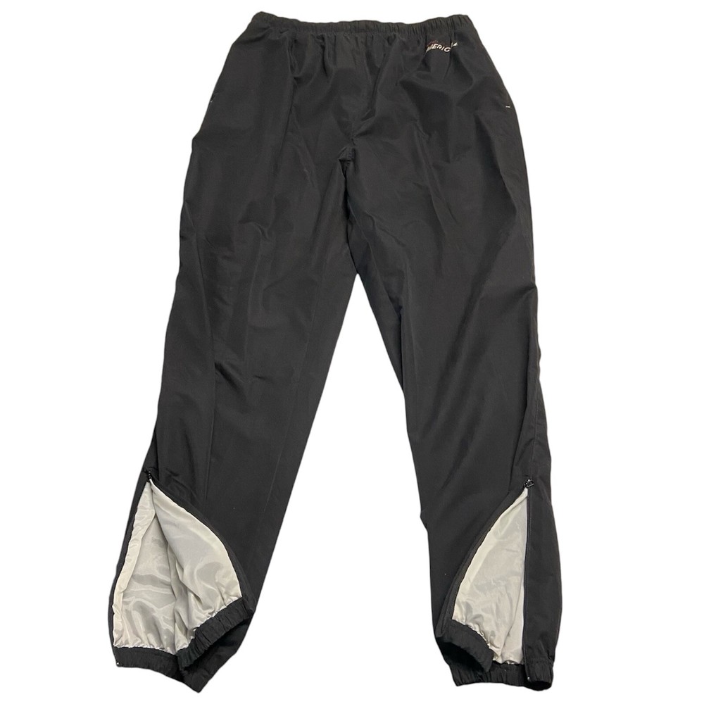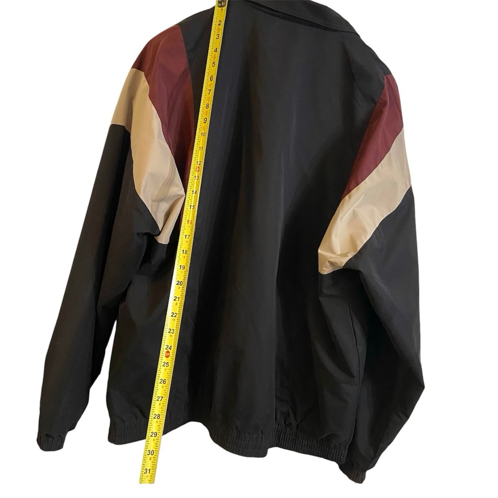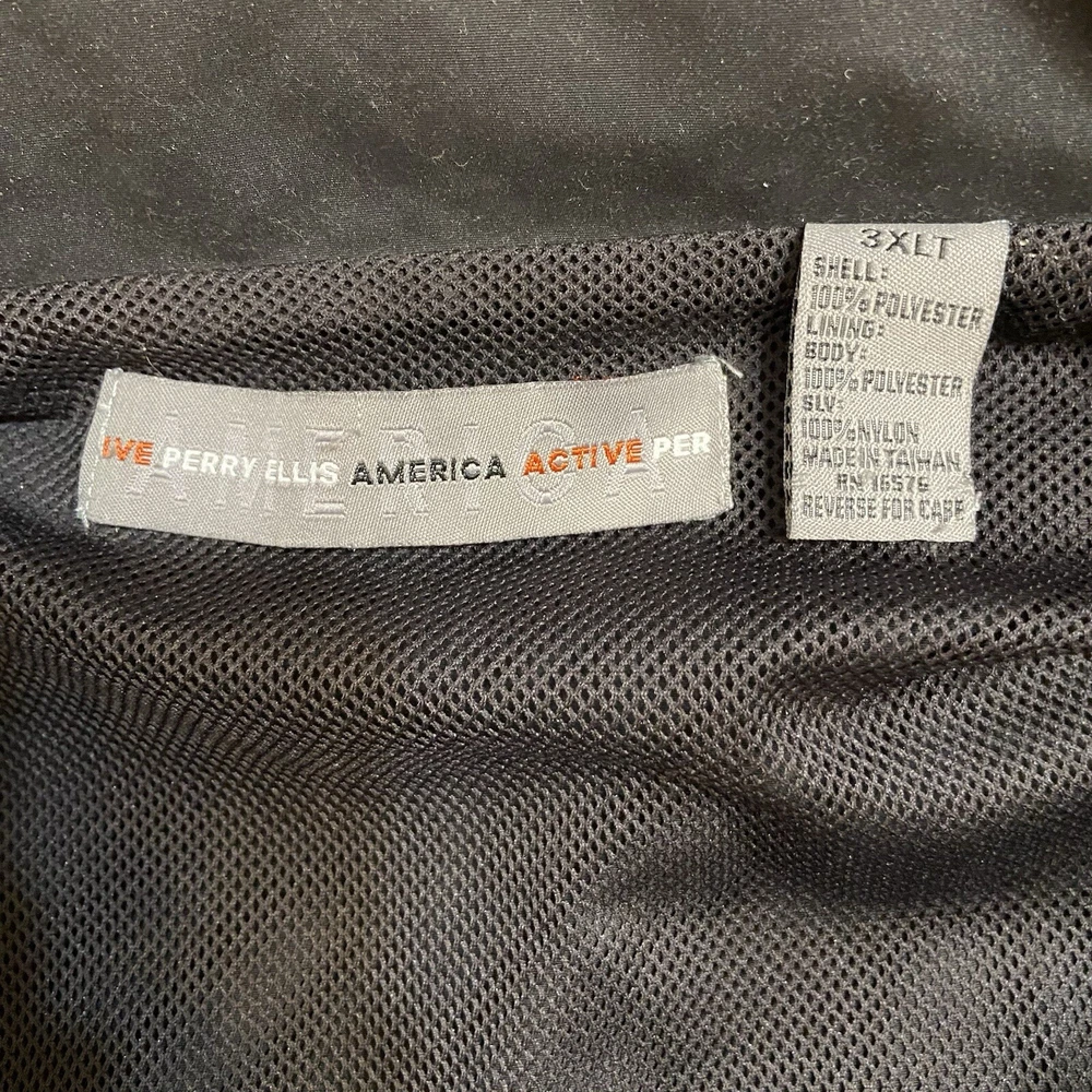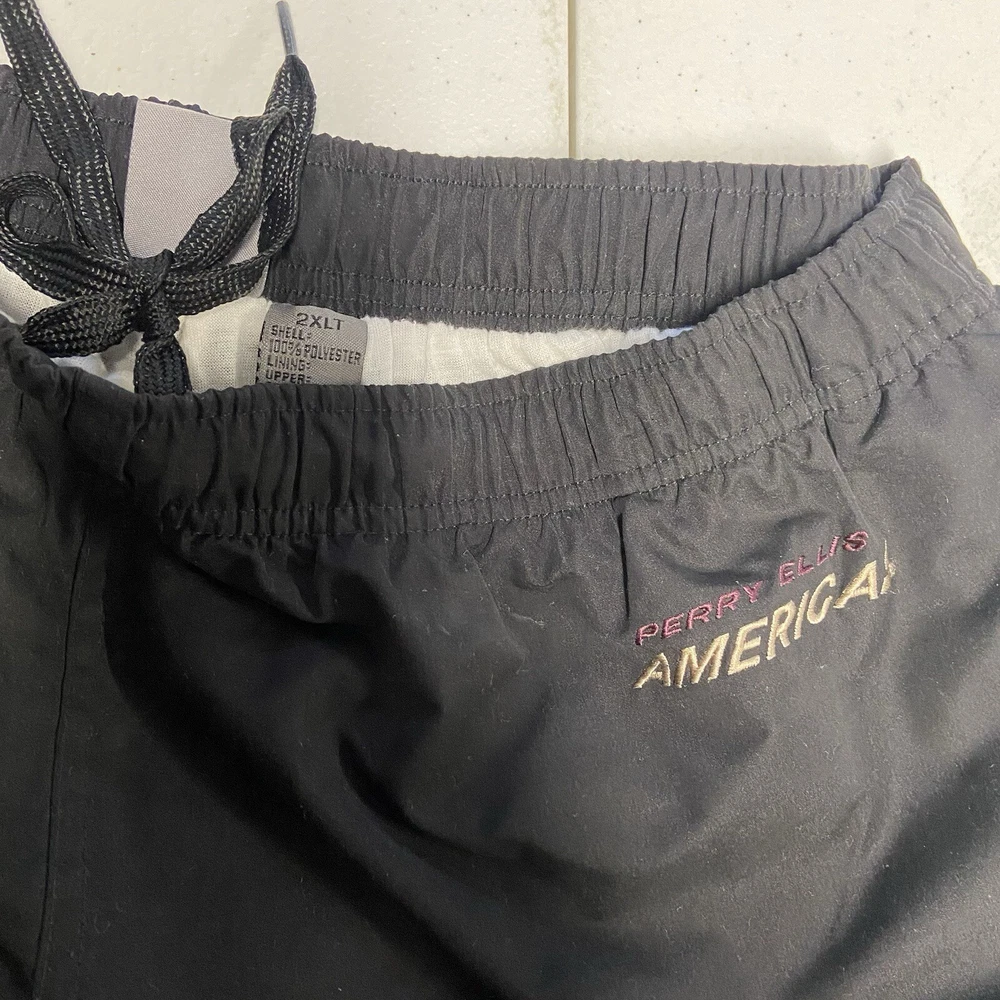 This vintage Perry Ellis America 3X windbreaker jacket is with 2X pants making a tracksuit set that is the perfect addition to any wardrobe. The black nylon outer shell material and block color pattern give it a unique and stylish look. The jacket features a full zip closure and elastic waist for a comfortable fit, while the pants have a regular size fit. With pockets on each side and zip pocket on the back right leg. Excellent used condition no holes, tears or stains The set is made of lightweight polyester fabric and is water and wind-resistant, making it suitable for all seasons. It also includes zipped pockets and a Perry Ellis logo accent. This jacket and tracksuit set is a great find for any vintage clothing enthusiast and is sure to make a statement and be comfortable.