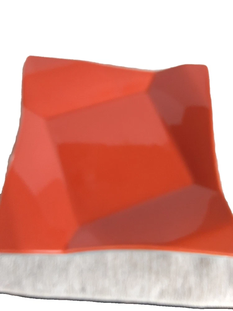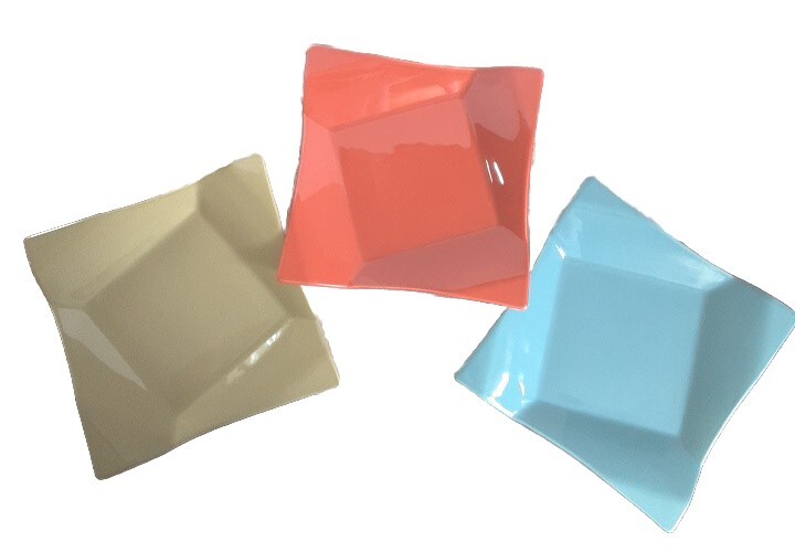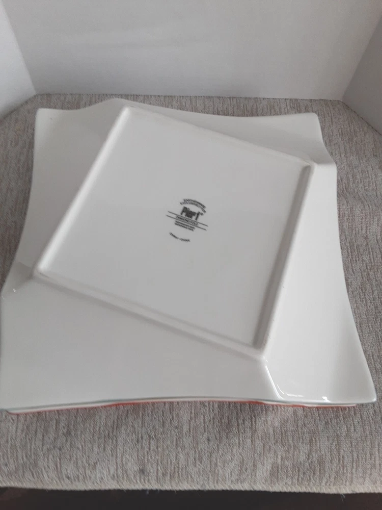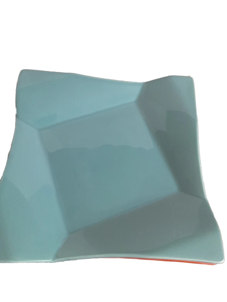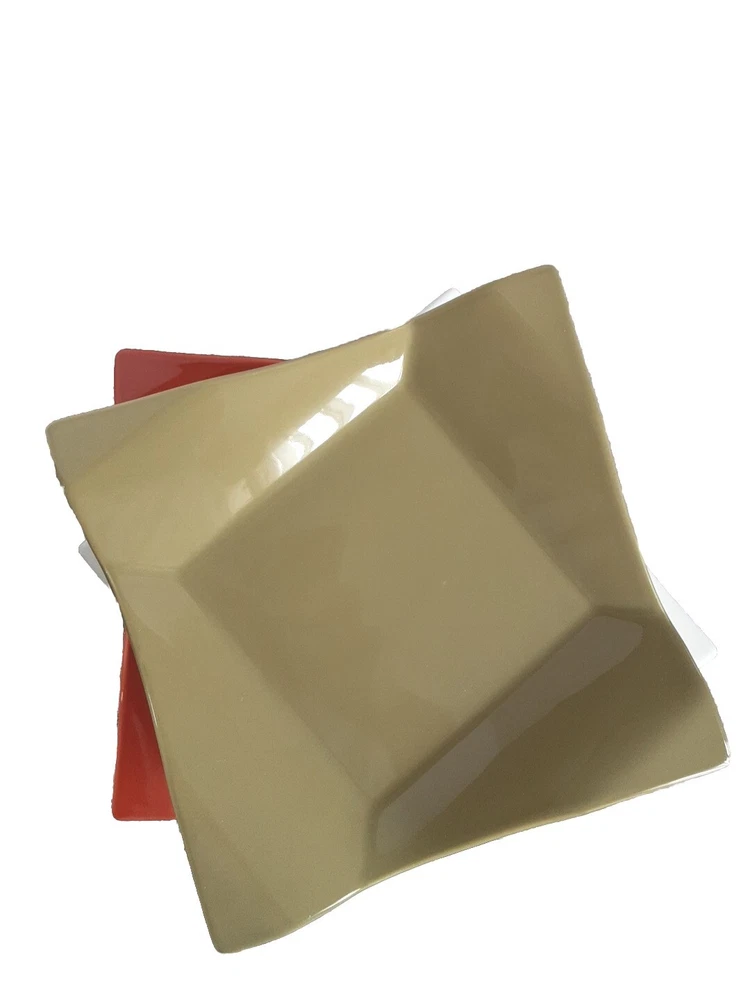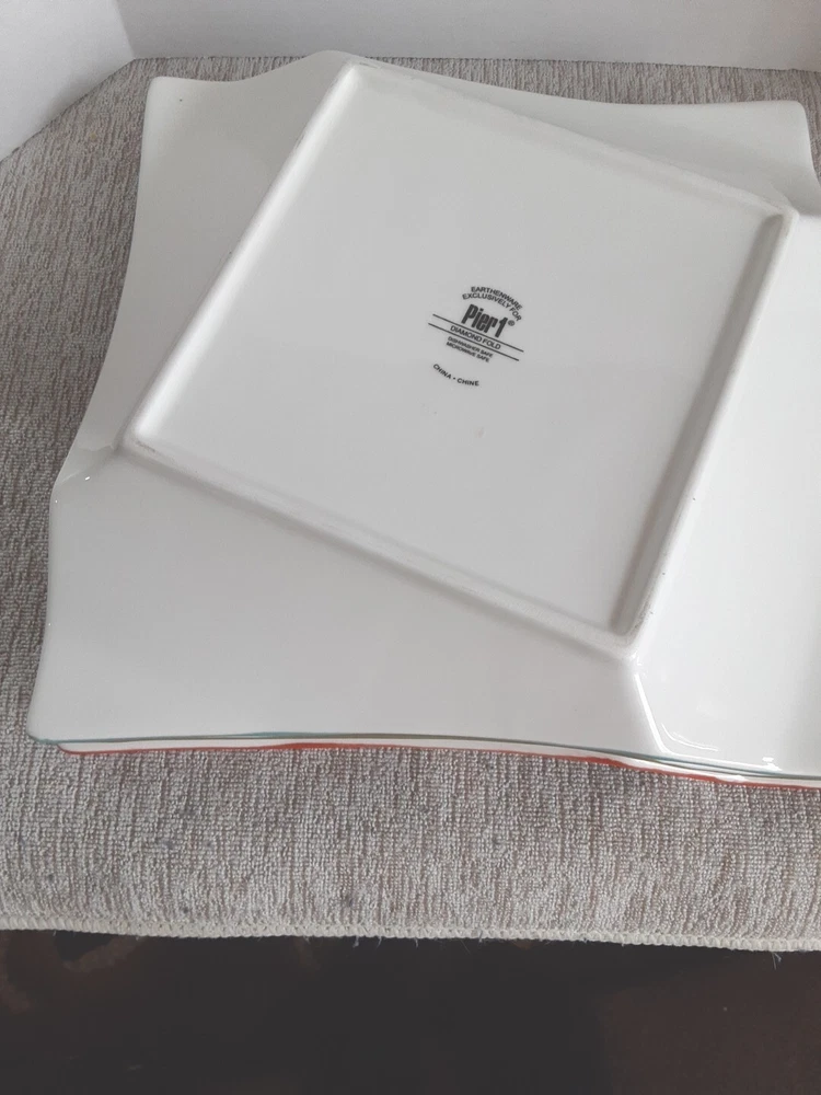 This is a set of three new salad plates from Pier 1's Banquet product line. The plates are made of glossy stoneware with a diamond fold solid pattern in green, blue, and orange colors. They are square-shaped and have a retro style, suitable for all occasions. The plates are dishwasher and microwave safe, and are produced using earthenware pottery techniques in China. The backstamp is printed, and the plates are part of a boho retro kitchen theme.