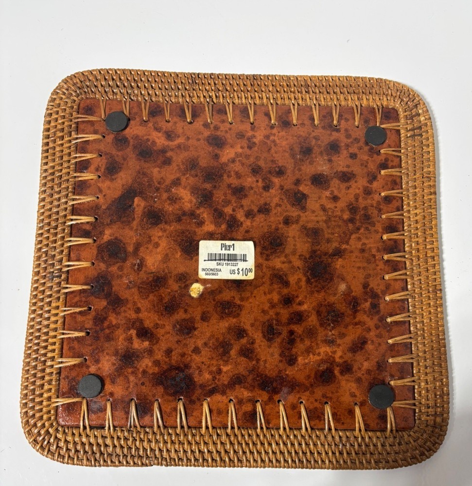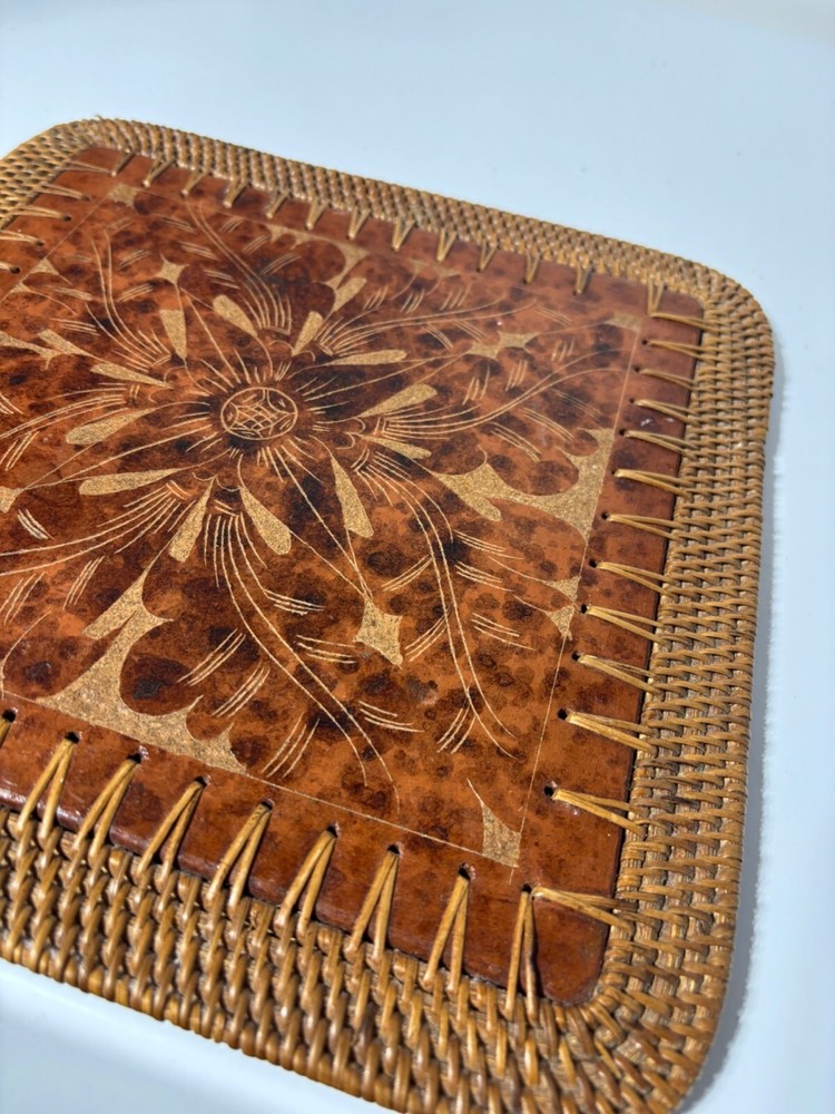 Handcrafted trivet featuring tile center with detailed floral design, surrounded by woven rattan border. • Natural rattan woven border • Decorative whipstitching detail • Rubber feet protectors • Square shape Light wear from use, nice preowned condition. SHIPPING DISCOUNT: Take advantage of our combined shipping offer on 2 or more clothing items from our store: add two or more items to your cart, and the discount will be applied automatically during checkout!