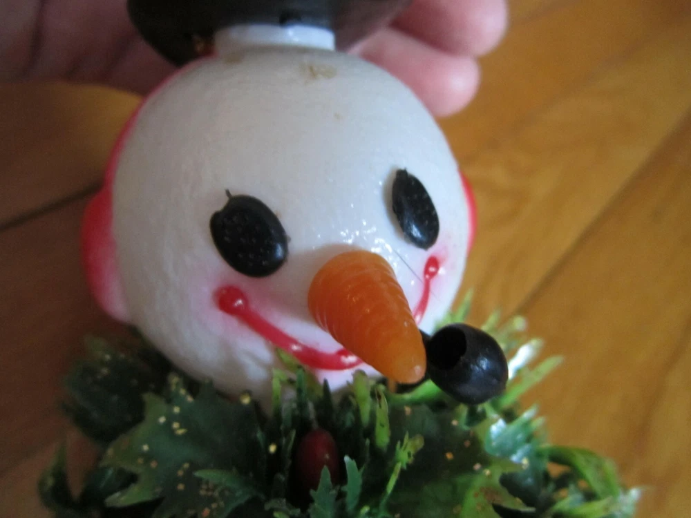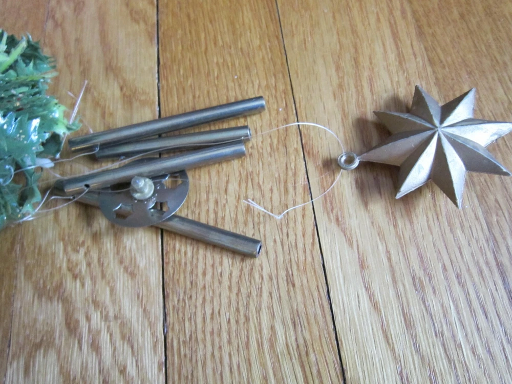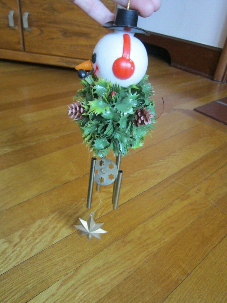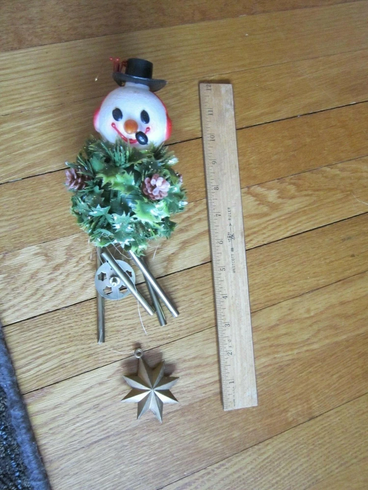 PLEASE NOTE: This is a used item. Please fully read item description for complete details of condition. Thank you! Really cute vintage decoration! Windchimes with hollow plastic Snowman head, plastic pine cones & holly ball and gold colored metal rods with hollow plastic star. It measures approximately 14 inches from top of hanging cord to bottom of star. Possibly missing part of holly berries on hat and throughout the plastic leaves on ball, but still makes a nice presentation. I do not clean collectibles, but leave that to new owner/expert. Could use a light cleaning. But remains overall clean and in good shape. Happy little face with pipe is very cute! US shipping will be FREE first class and includes delivery confirmation. Please message me with any questions. Lots more great items listed!! Thanks for looking!