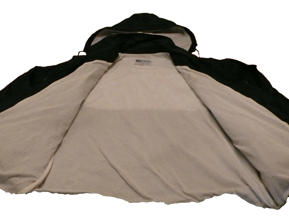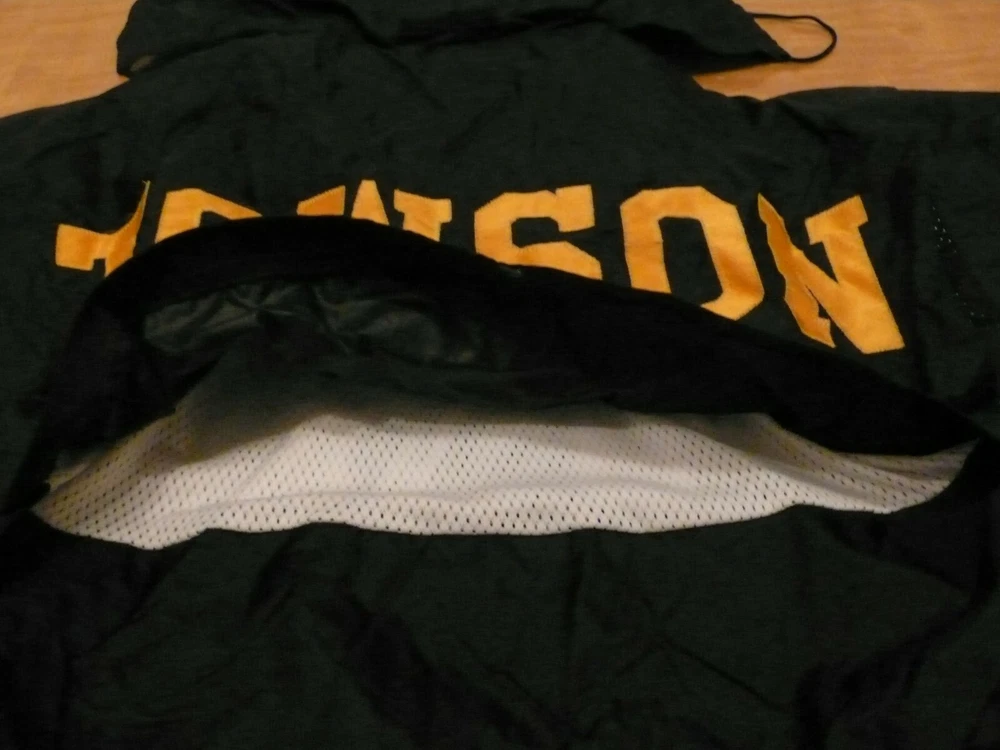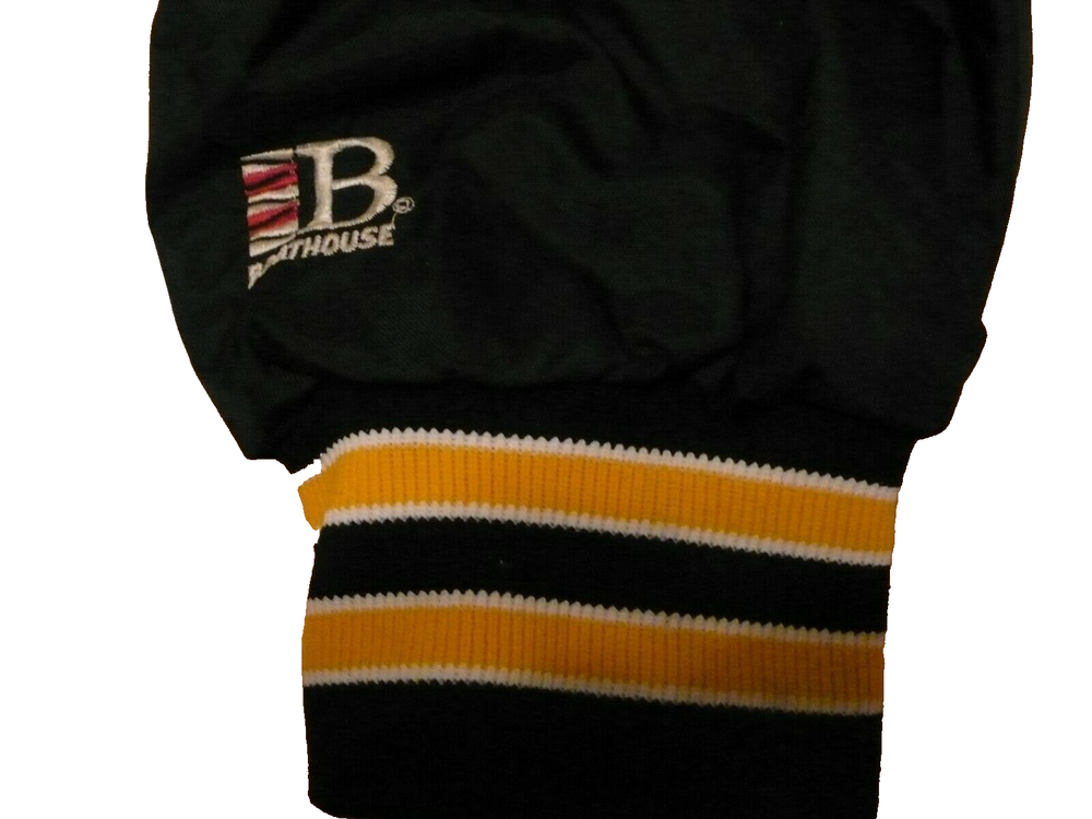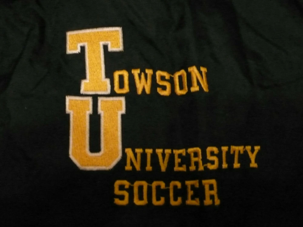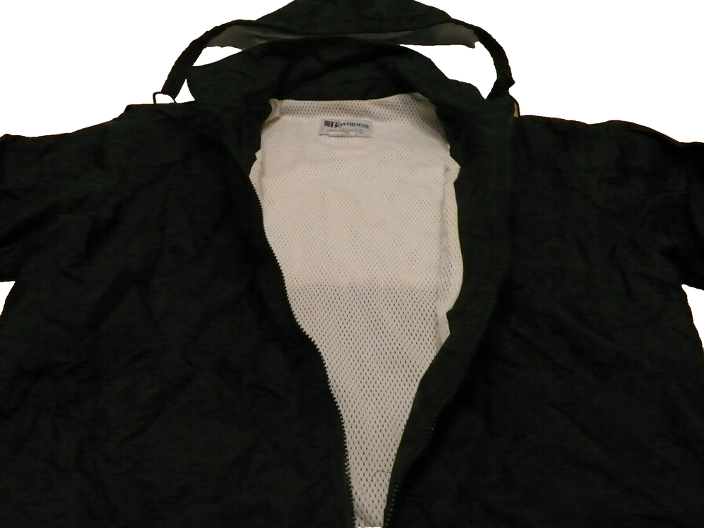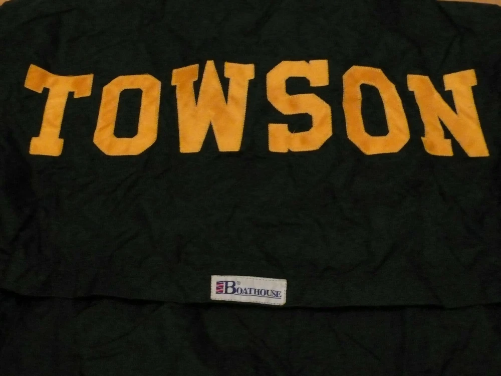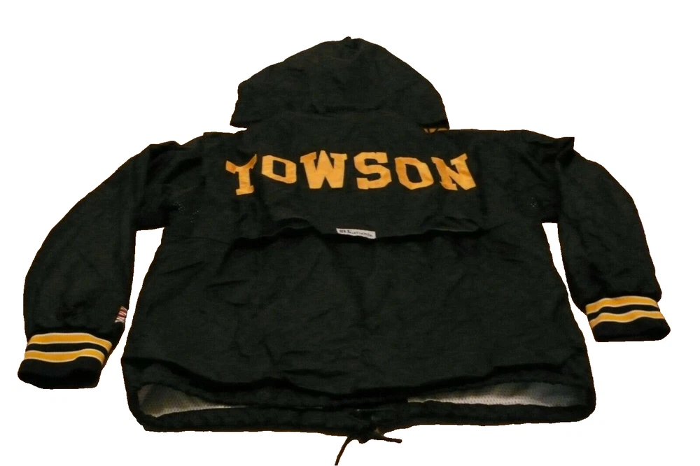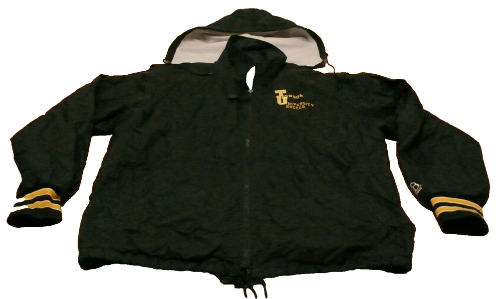 A vtg. TOWSON UNIVERSITY Soccer Large Black Wind Breaker Light Jacket w/ Hood. It is Made in the USA of Shell -100% Nylon Lining - 100% Polyester Approx. measures Jacket laid flat on the table * Chest (armpit-armpit) 26.5" * Shoulder (shoulder-shoulder) 22.5" * Sleeve (shoulder-cuff) 25.5" * Length (collar-bottom seam) 29" A pre- owned item w/normal wear. Feel free to ask questions. Thanks for checking it out.