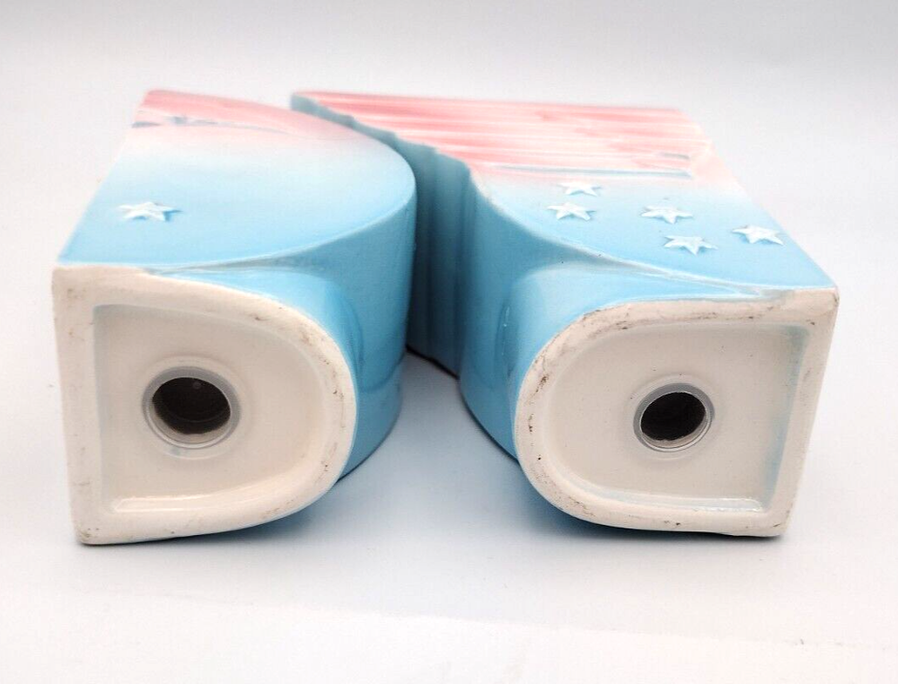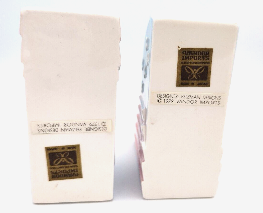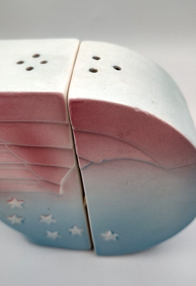 These super fun and unique salt and pepper shakers measure approximately 3.5" in height, 4.5" in length when placed together and 1.5" in width. They have their plastic stoppers in the bottom as well as their original stickers. Please see all photographs as they are art of the description. Shipped with USPS Ground Mail.