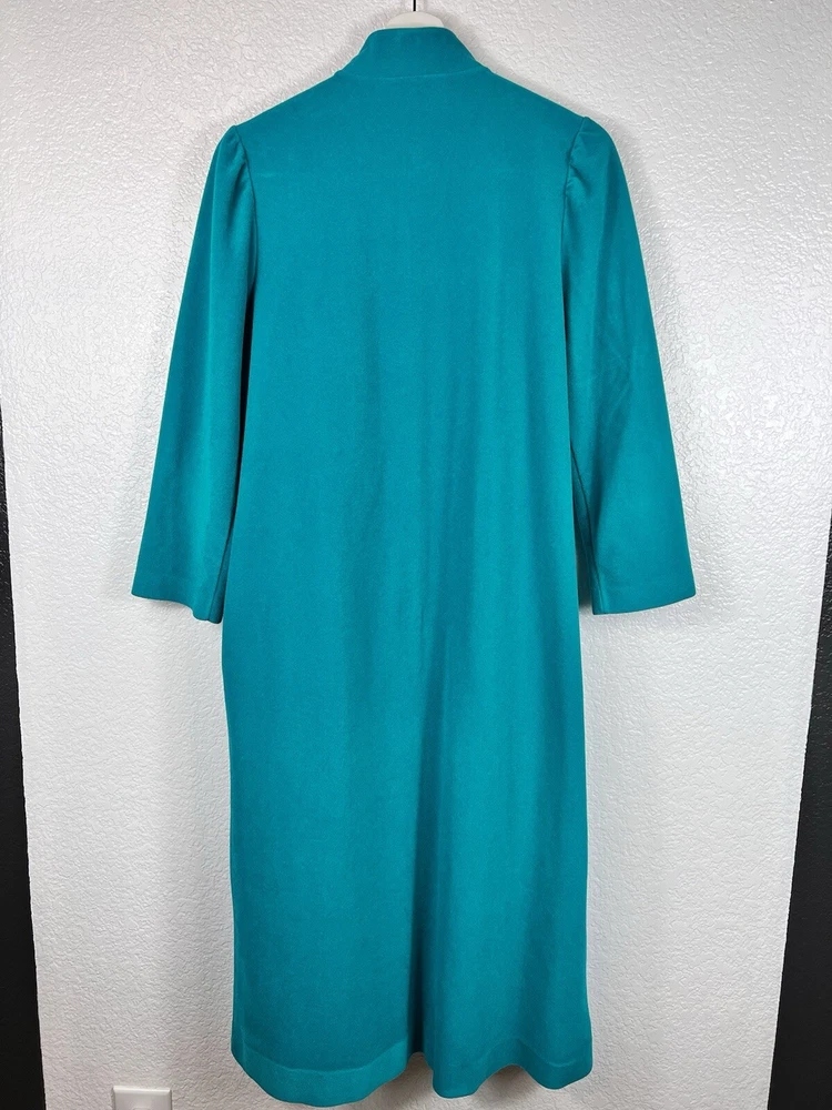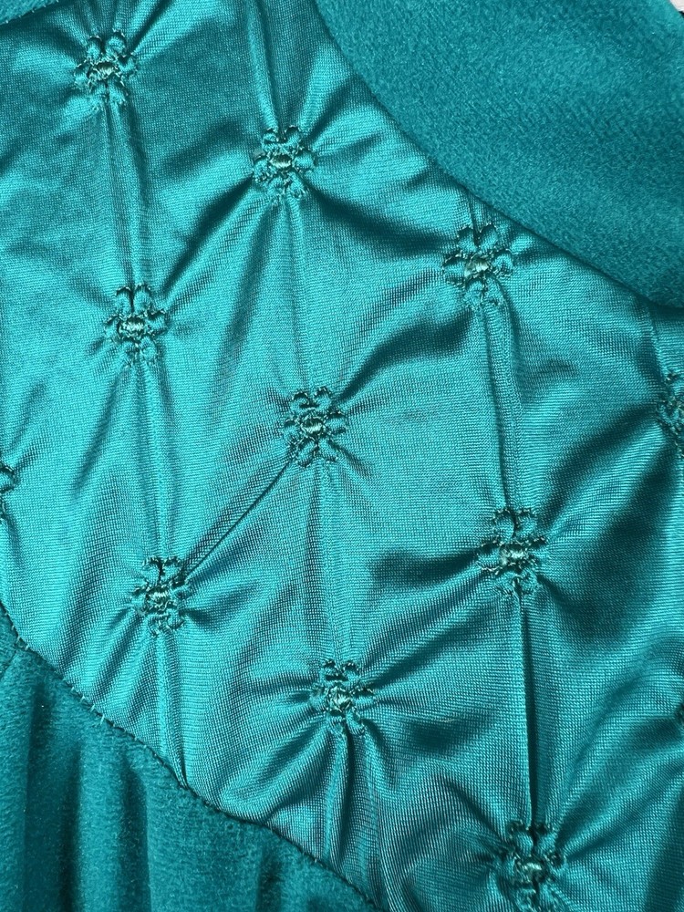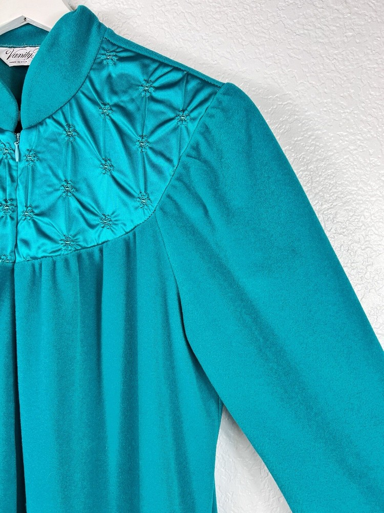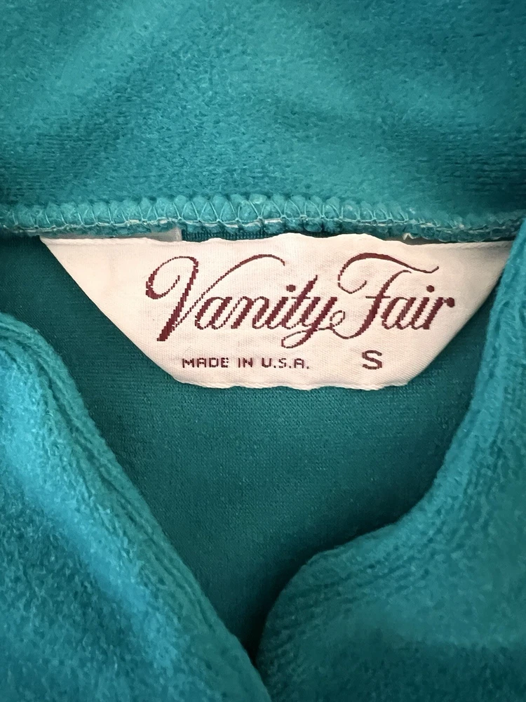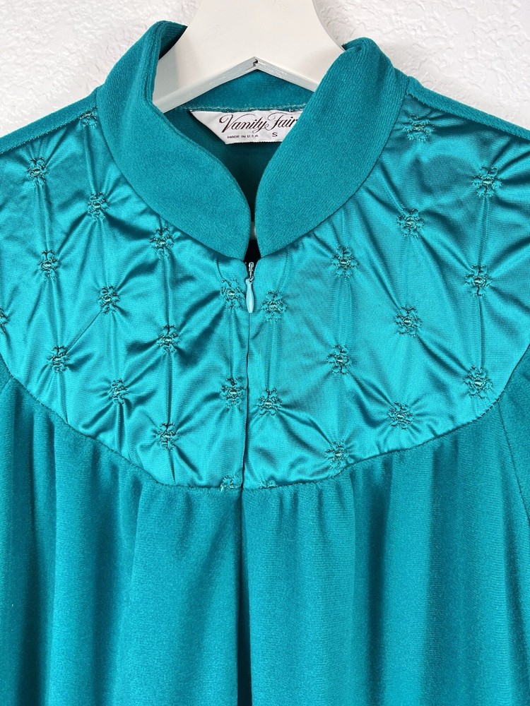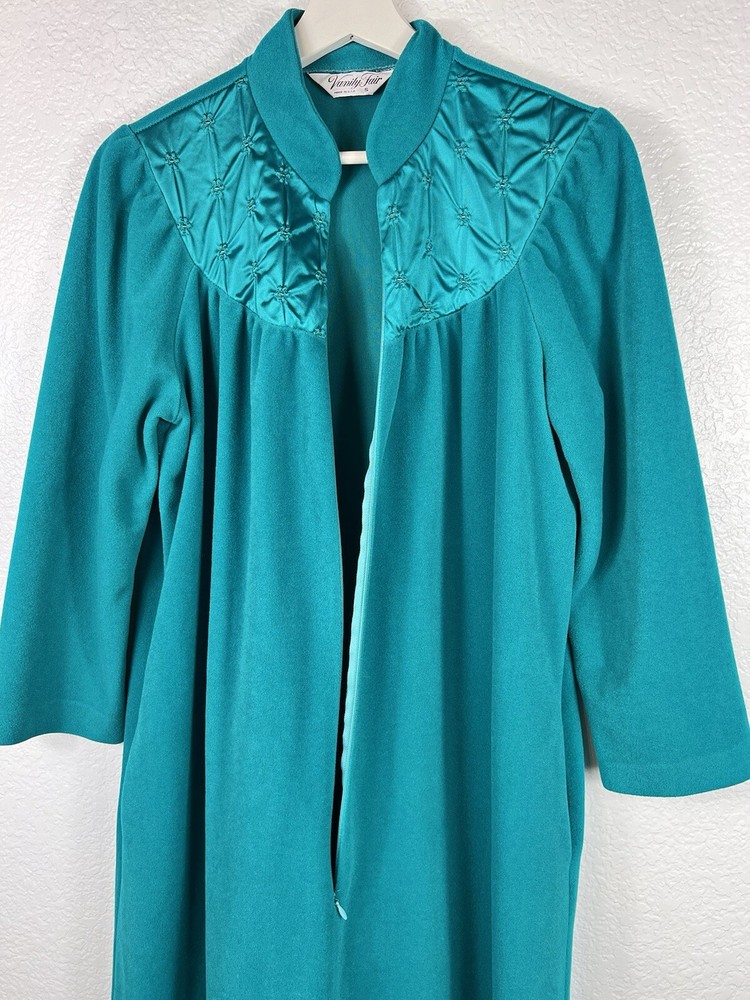 Vintage Vanity Fair Sz Small Fleece Peacock Green Full Zip Robe with Pockets and Satin Neckline. In good condition.