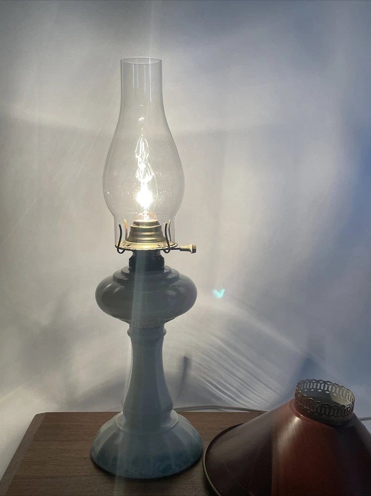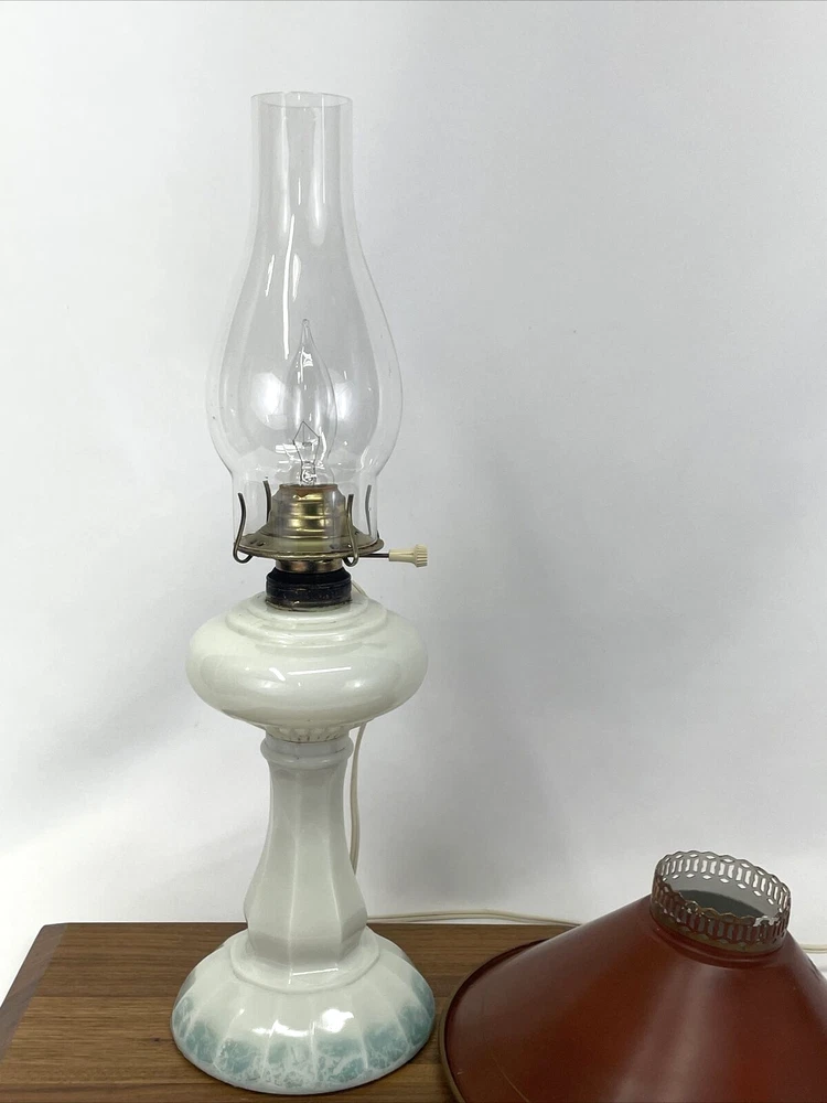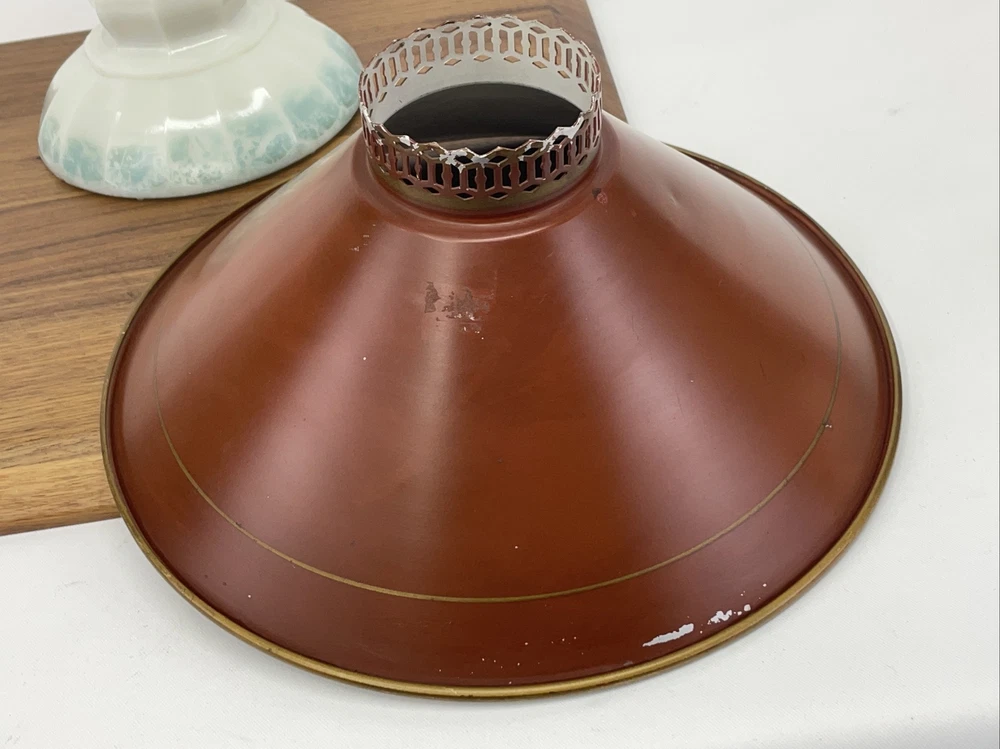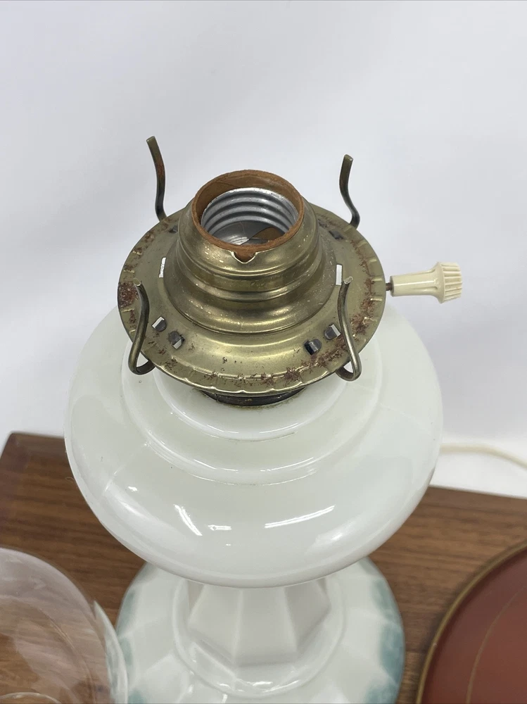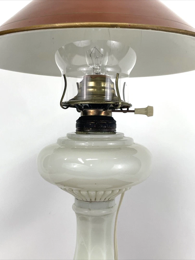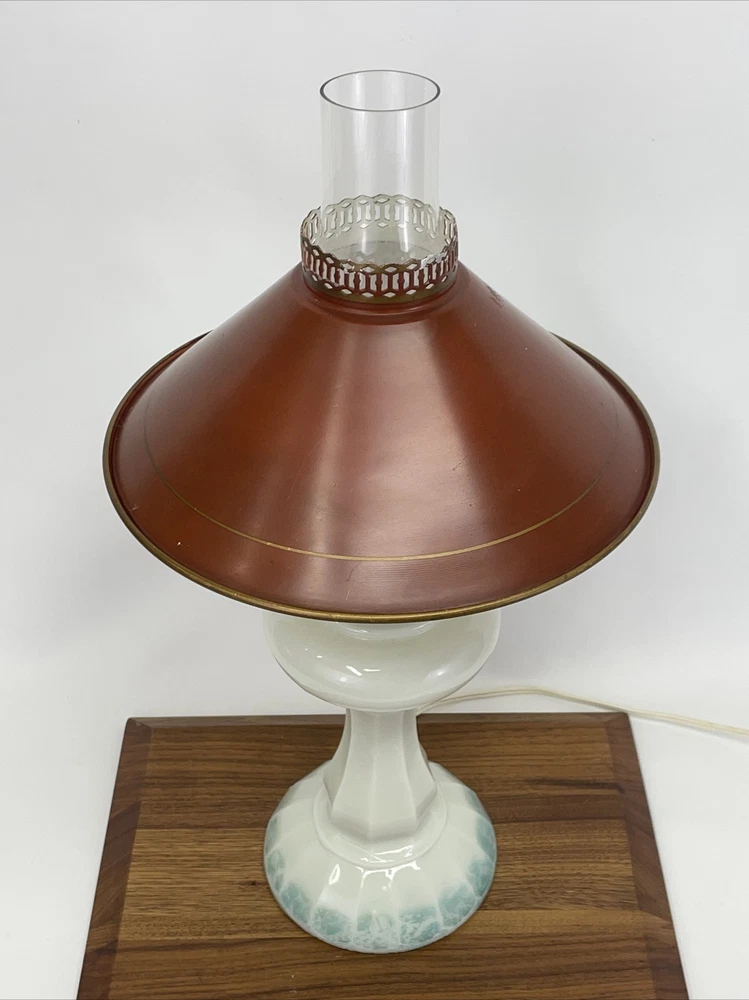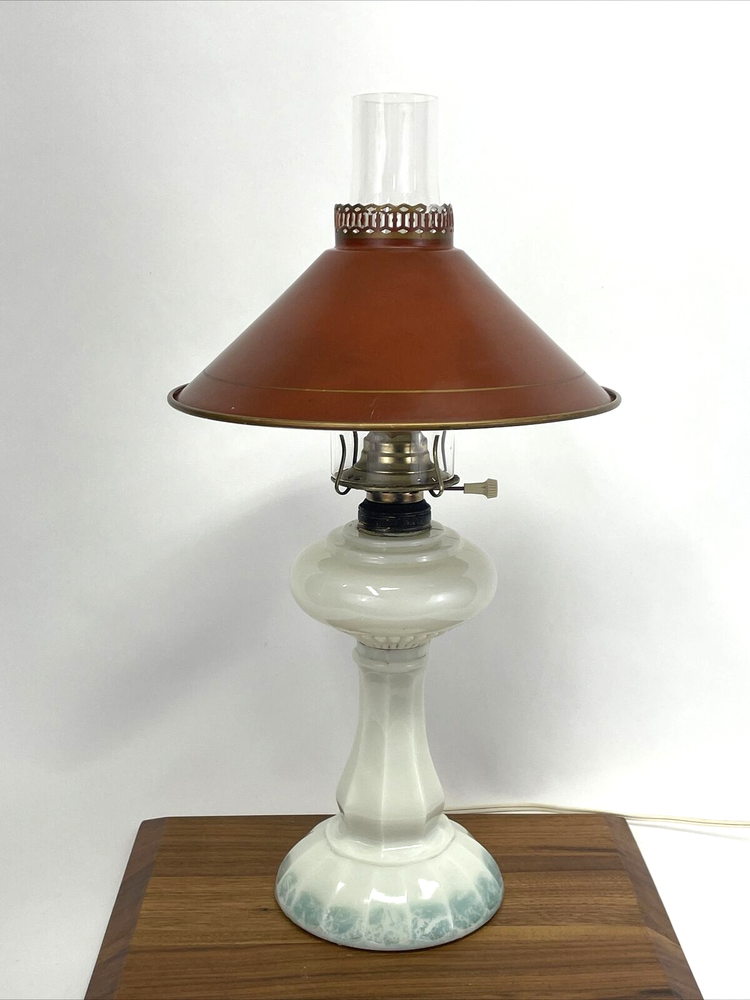 Beautiful lamp! A beautiful vintage or antique oil lamp Milk glass with painted seafoam green / turquoise details on the base Clear glass chimney Metal toleware shade in rusty red and gold Lovely antique eye-catcher! Working well. This oil lamp has been electrified at some point in its history, and the toleware shade has been added. You could use it as an oil lamp again by using a screw-in burner with a 1-1/8 inch thread diameter. The milk glass base is in great condition with only a tiny nick at the base (see closeup) and some loss to the seafoam green / turquoise paint at the bottom. The metal shade has some light wear and small marks, but nothing that takes away from the beauty of the lamp. The clear glass chimney has no chips or cracks. The lamp uses one standard base light bulb up to 60 watts or use an LED bulb for any brightness you like, as they use low wattage for bright light. Light bulb not included. The cord and plug are in great condition and working well. Measurements: Total height: 19" Base width / diameter: 5 3/4" Width of metal shade: 10 1/2" **We have many antique and vintage lamps, shades and collectibles - see our eBay store** ~ Please see all photos for detailed description ~ * We ship the NEXT DAY after you pay * Shipping includes tracking & insurance * We ship either FedEx, UPS or USPS, whichever is more economical to your zip code Willing to ship International ~ Contact us for shipping quote if the eBay shipping calculator isn't working for you. If you need a guaranteed delivery date, please contact us for information and a quote Ask Any Questions! We are very diligent about making our customers HAPPY and hope to maintain our high seller rating! Please contact us before leaving feedback if there is ANY issue so we can make you pleased to give us positive feedback! :) Thank you...