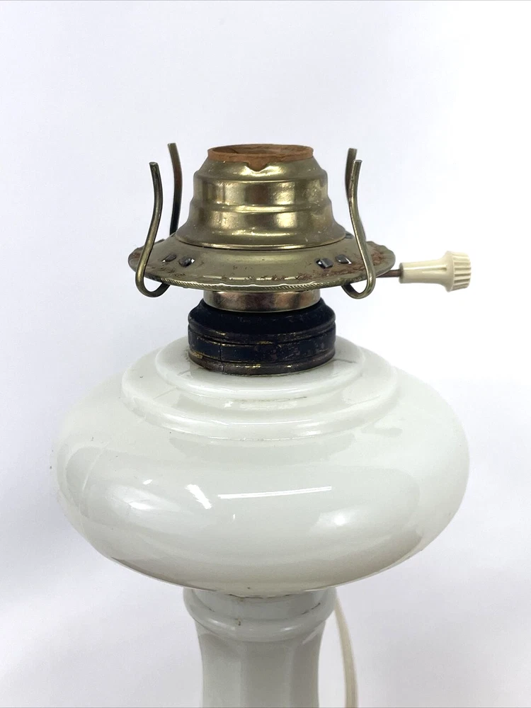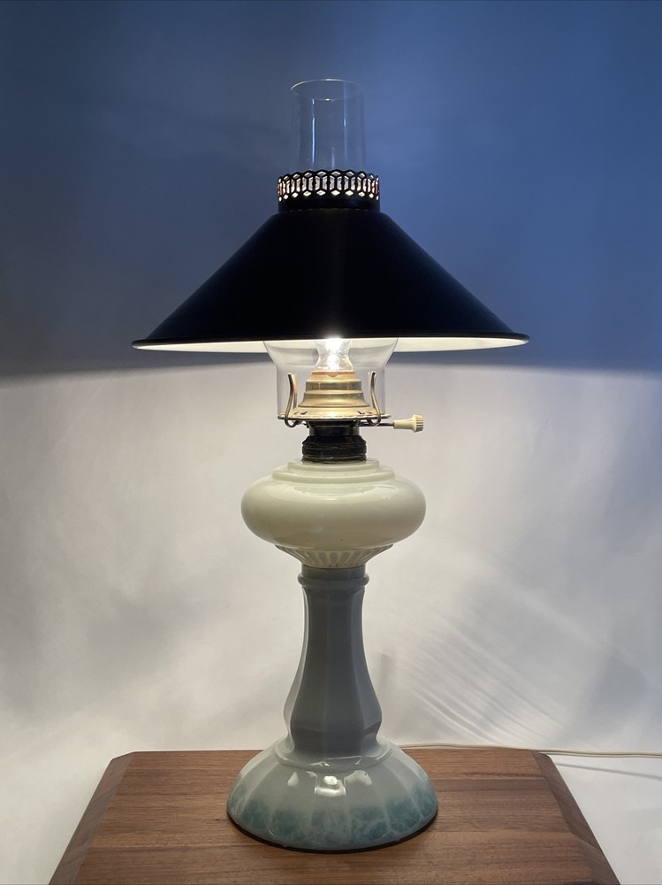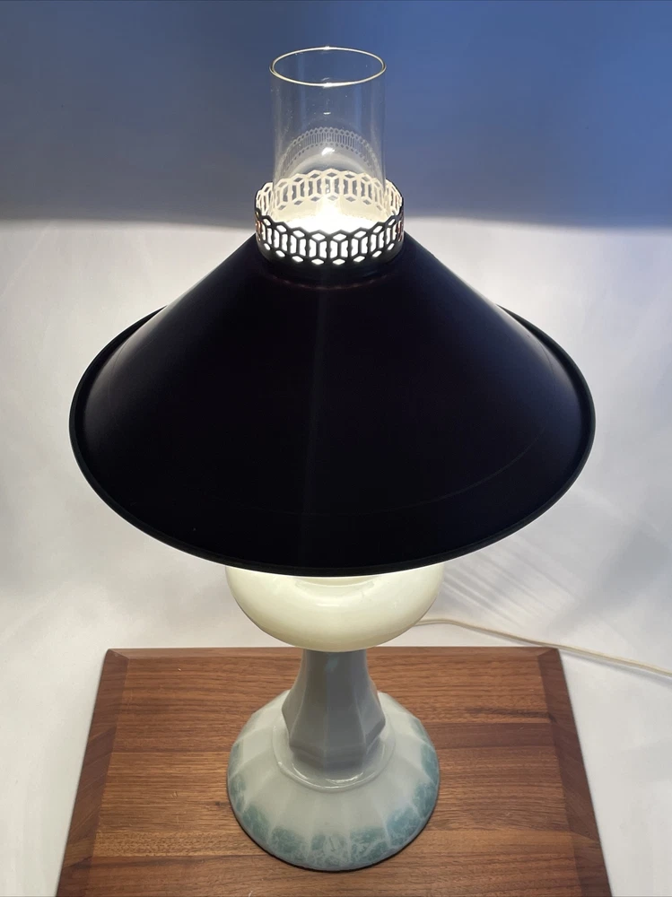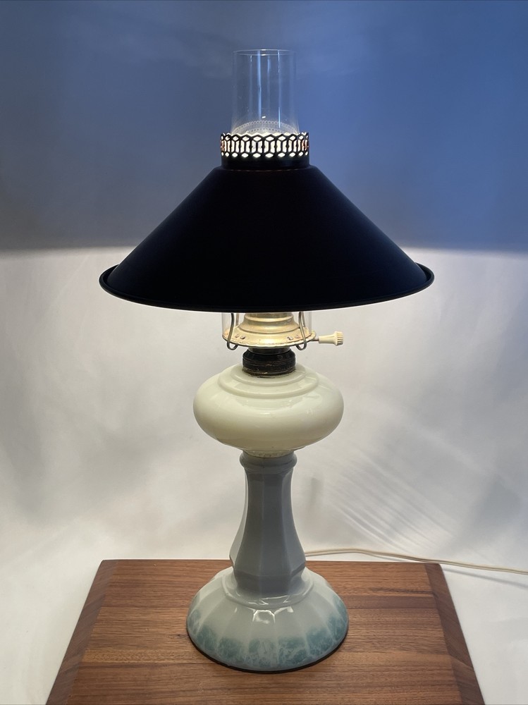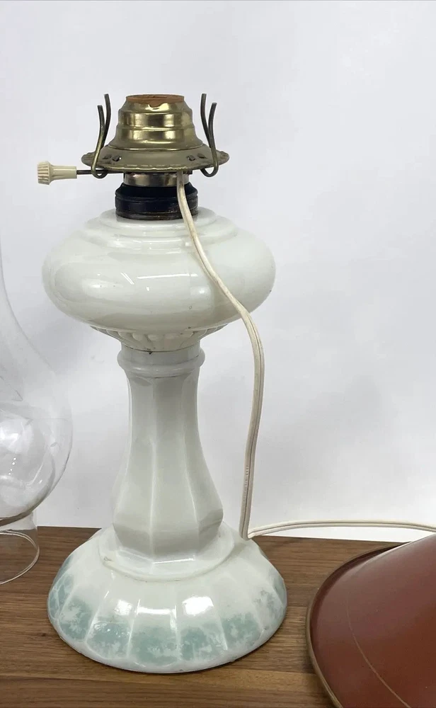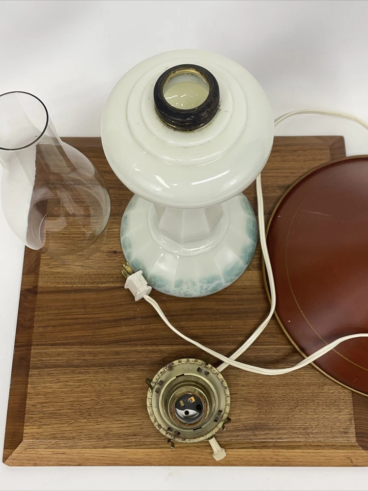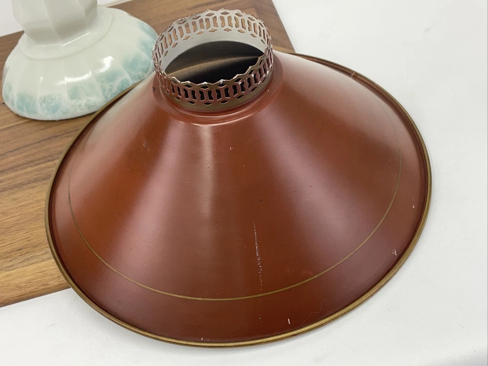 Beautiful lamp! A beautiful vintage or antique oil lamp Milk glass with painted seafoam green / turquoise details on the base Clear glass chimney Metal toleware shade in rusty red and gold Lovely antique eye-catcher! Working well. This oil lamp has been electrified at some point in its history, and the toleware shade has been added. You could use it as an oil lamp again by using a screw-in burner with a 1-1/8 inch thread diameter. The milk glass base is in great condition with only a tiny nick at the base (see closeup) and some loss to the seafoam green / turquoise paint at the bottom. The metal shade has some light wear and small marks, but nothing that takes away from the beauty of the lamp. The clear glass chimney has no chips or cracks. The lamp uses one standard base light bulb up to 60 watts or use an LED bulb for any brightness you like, as they use low wattage for bright light. Light bulb not included. The cord and plug are in great condition and working well. Measurements: Total height: 19" Base width / diameter: 5 3/4" Width of metal shade: 10 1/2" **We have many antique and vintage lamps, shades and collectibles - see our eBay store** ~ Please see all photos for detailed description ~ * We ship the NEXT DAY after you pay * Shipping includes tracking & insurance * We ship either FedEx, UPS or USPS, whichever is more economical to your zip code Willing to ship International ~ Contact us for shipping quote if the eBay shipping calculator isn't working for you. If you need a guaranteed delivery date, please contact us for information and a quote Ask Any Questions! We are very diligent about making our customers HAPPY and hope to maintain our high seller rating! Please contact us before leaving feedback if there is ANY issue so we can make you pleased to give us positive feedback! :) Thank you...