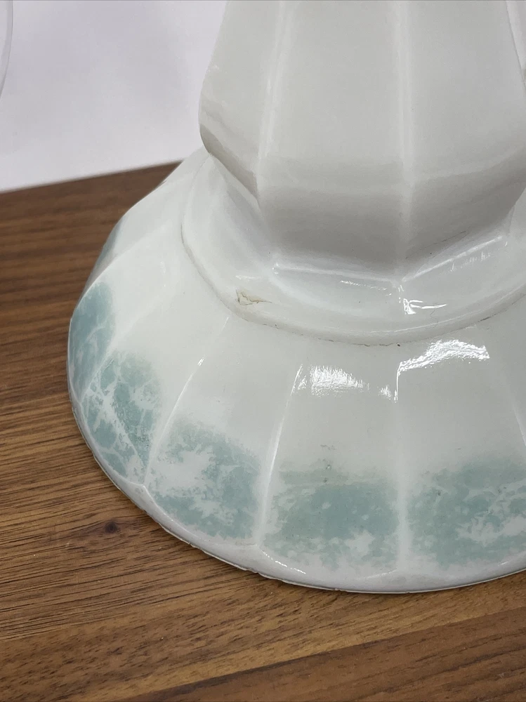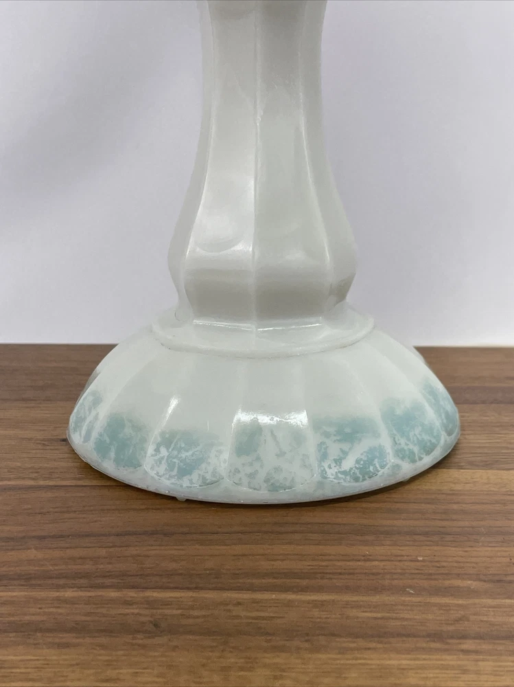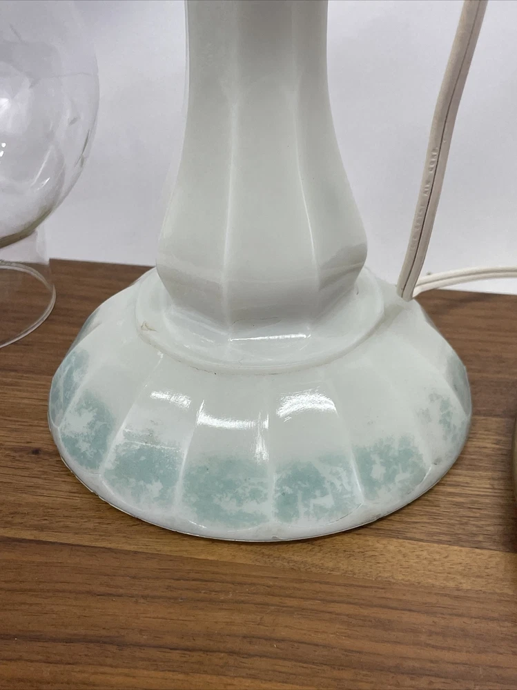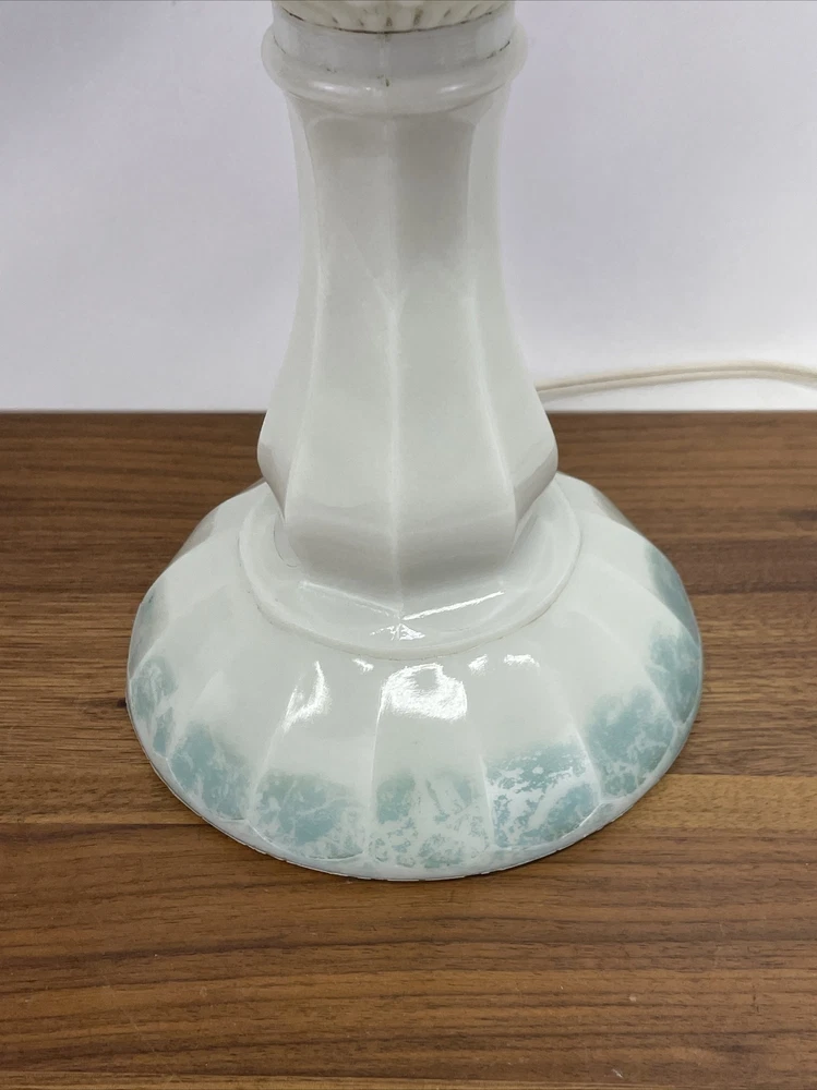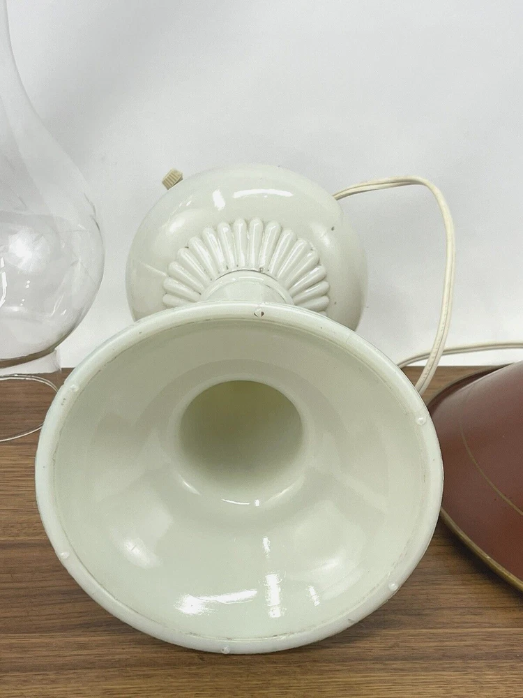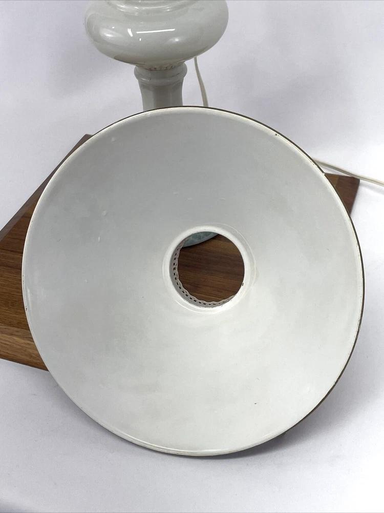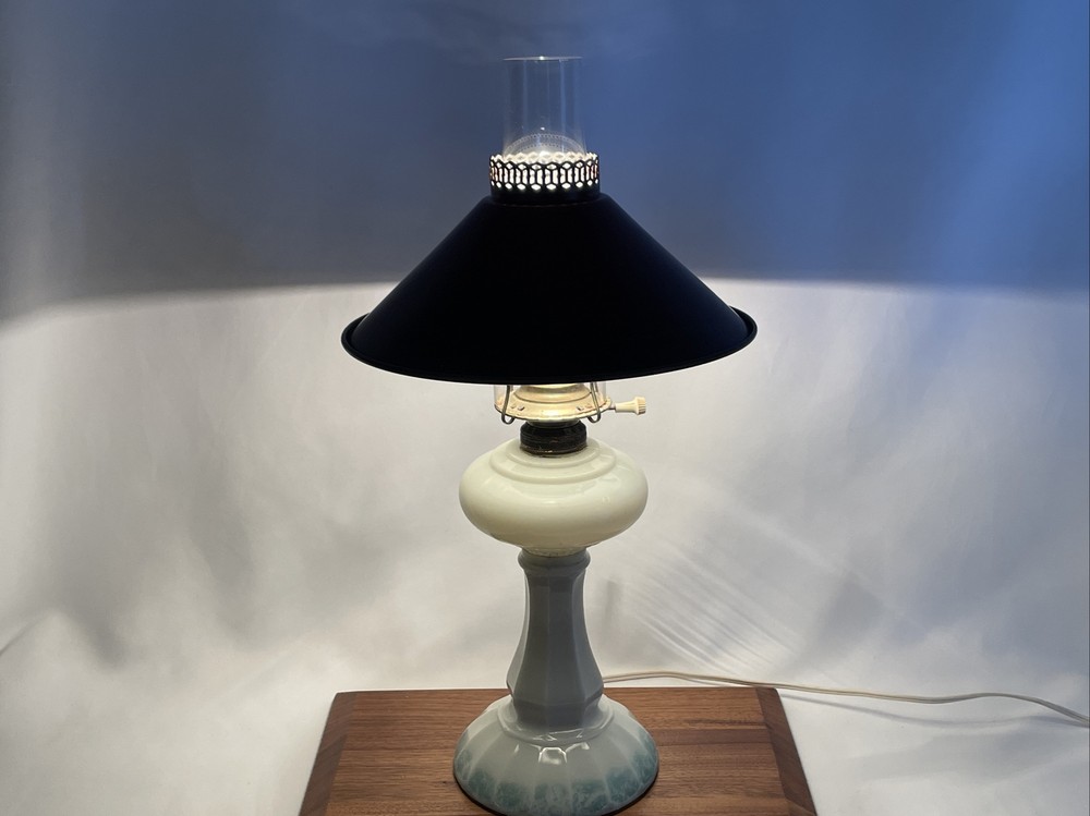Beautiful lamp! A beautiful vintage or antique oil lamp Milk glass with painted seafoam green / turquoise details on the base Clear glass chimney Metal toleware shade in rusty red and gold Lovely antique eye-catcher! Working well. This oil lamp has been electrified at some point in its history, and the toleware shade has been added. You could use it as an oil lamp again by using a screw-in burner with a 1-1/8 inch thread diameter. The milk glass base is in great condition with only a tiny nick at the base (see closeup) and some loss to the seafoam green / turquoise paint at the bottom. The metal shade has some light wear and small marks, but nothing that takes away from the beauty of the lamp. The clear glass chimney has no chips or cracks. The lamp uses one standard base light bulb up to 60 watts or use an LED bulb for any brightness you like, as they use low wattage for bright light. Light bulb not included. The cord and plug are in great condition and working well. Measurements: Total height: 19" Base width / diameter: 5 3/4" Width of metal shade: 10 1/2" **We have many antique and vintage lamps, shades and collectibles - see our eBay store** ~ Please see all photos for detailed description ~ * We ship the NEXT DAY after you pay * Shipping includes tracking & insurance * We ship either FedEx, UPS or USPS, whichever is more economical to your zip code Willing to ship International ~ Contact us for shipping quote if the eBay shipping calculator isn't working for you. If you need a guaranteed delivery date, please contact us for information and a quote Ask Any Questions! We are very diligent about making our customers HAPPY and hope to maintain our high seller rating! Please contact us before leaving feedback if there is ANY issue so we can make you pleased to give us positive feedback! :) Thank you...