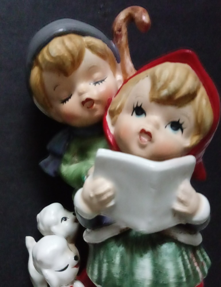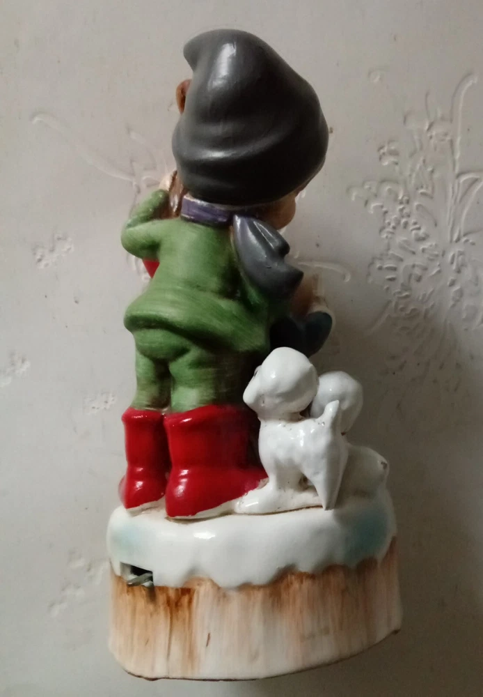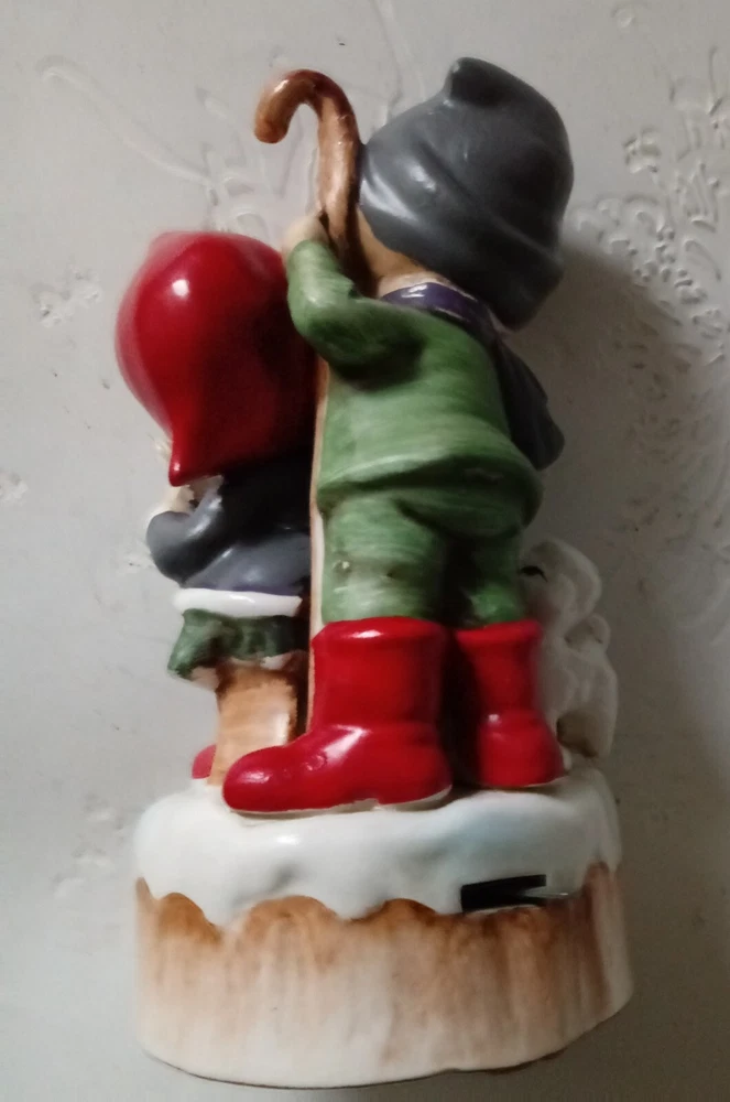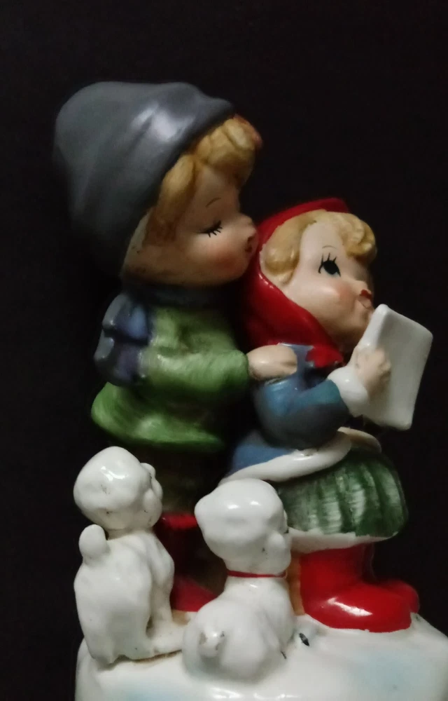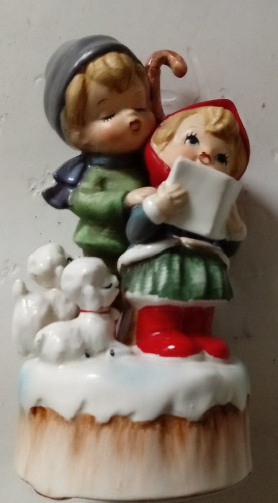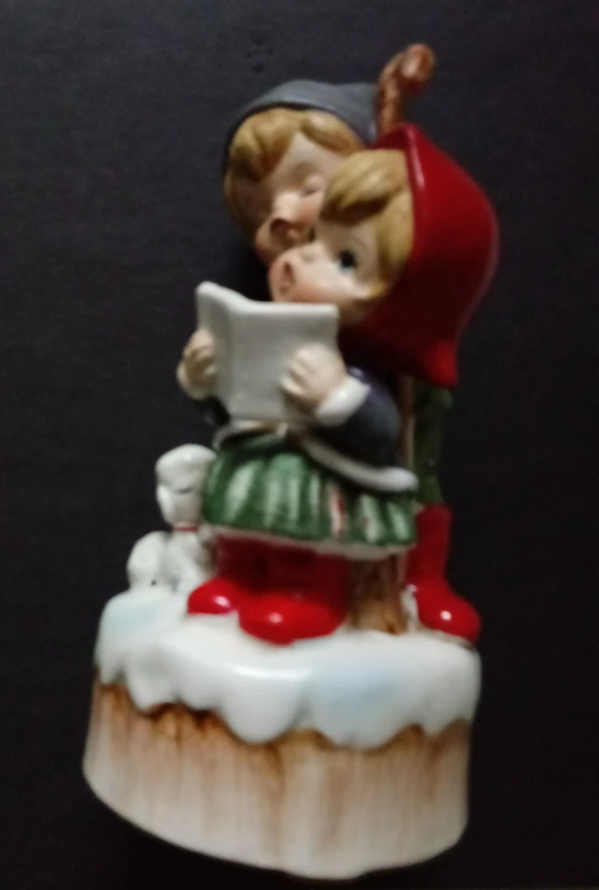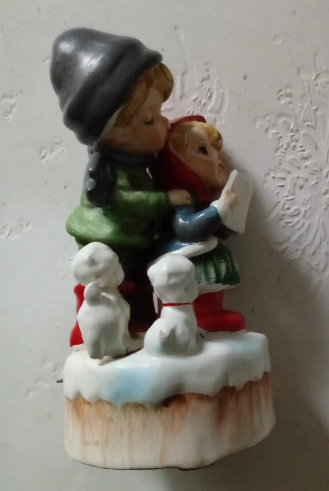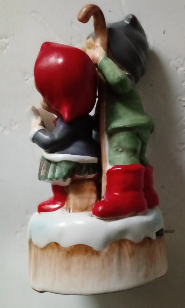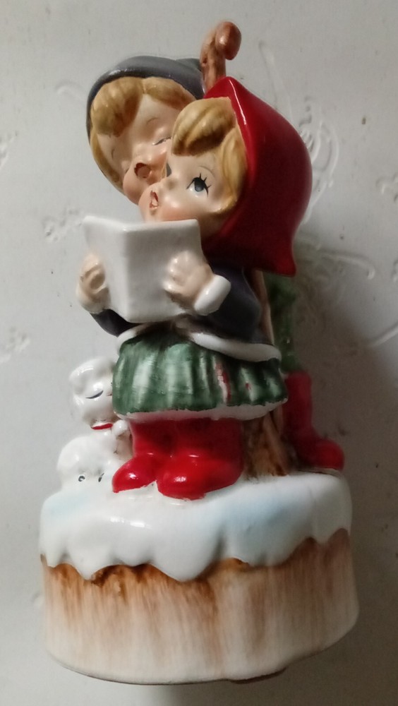 Extremaly Rare Vtg Xmas Wind Up Porcelain Music Box SILENT NIGHT Christmas Boy & Girl MADE in JAPAN, Early 1950s Condition: Very Good Used Condition, There are no chips, cracks or repairs. Very rare and nice Christmas music box . The base plays "Silent Night"... An adorable set of carolers that are bundled up against the cold winter. Their cute lambs are sitting at boy's and girl's feet and look to be singing too! The boy is dressed in an outfit of grayish sweater and pants, and Iris cap , and red high boots. The boy is holding a cane. The girl is dressed in a greenish skirt, grayish jacket, and red kerchief and red high boots, and is holding a music book. Their lambs are white. Their faces are painted with detail right down to their rosy cheeks and lips. * The base winds up and plays SILENT NIGHT. * The entire music box stands 7 ½ inches tall, and the base diameter is 3½ inches. * There are no chips, cracks or repairs. * This music box is made in Japan. The characters on this music box are unmistakably Hummel-like and adorable. * The weight is 1 Lb 4 OZs <<>><<>><<>><<>> Comes from smoke free home.