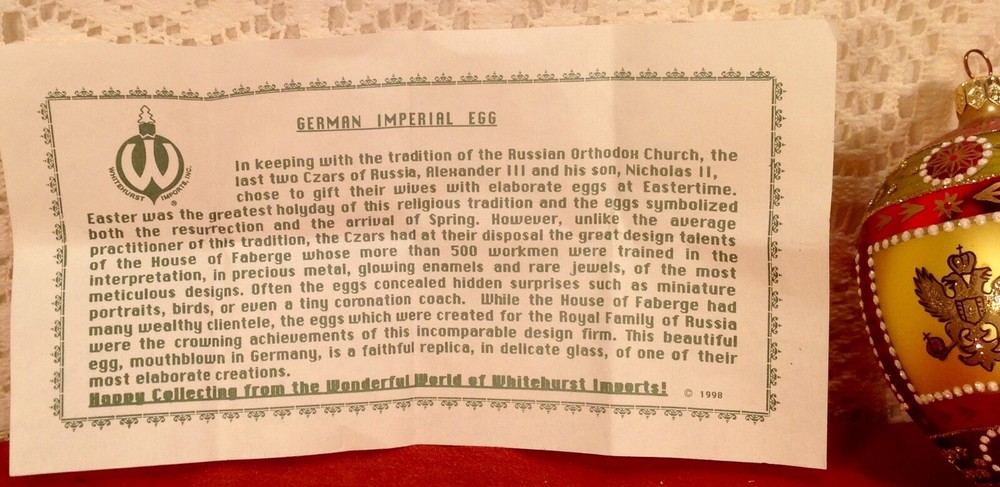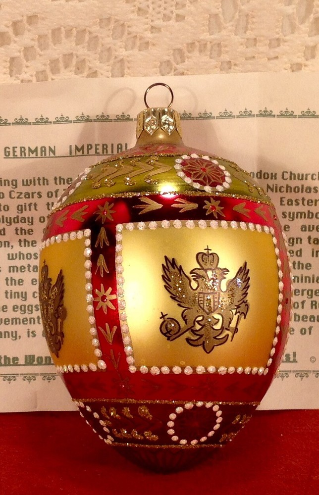 This is a wonderful WHITEHURST IMPORTS German Imperial Egg replica, mouth blown, Easter or Christmas Ornament, glass handcrafted holiday Christmas ornament in MINT condition. Handcrafted, this is a beautiful holiday tree ornament. Compare and SAVE, SAVE, SAVE with AAAGIFTS. We have a great price and no additional taxes (unless required by eBay) or shipping fees. Buy quality! Buy with confidence from AAGIFTS; we fully endorse the EBay return policy for items purchased that are misdescribed or received broken. AAGIFTS makes every effort to both describe our listed products accurately, and to ship only items determined to be in the condition described. Additionally, AAGIFTS does NOT make its customers spend a minimum of $25.00 to receive FREE SHIPPING, as does some popular shopping sites. Thank you for shopping with AAGIFTS. Very limited supply available. SAVE, SAVE, SAVE, with AAGIFTS! AAGIFTS has FREE SHIPPING. B032A