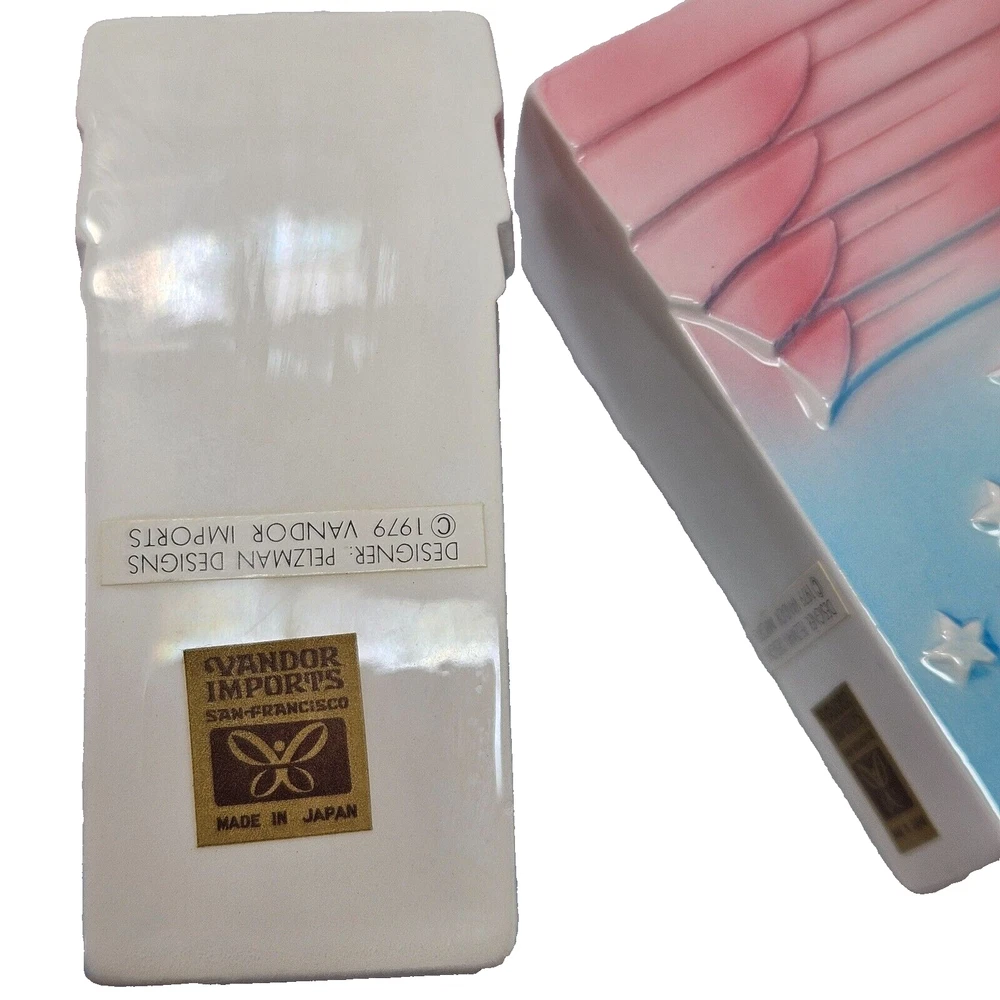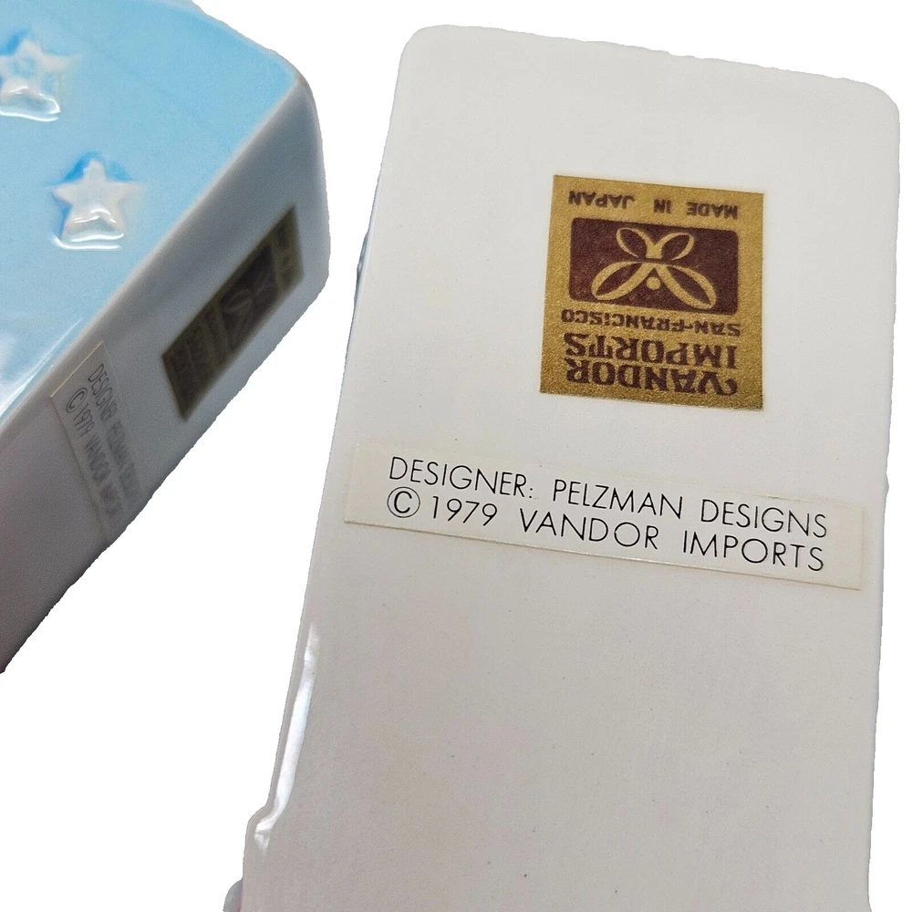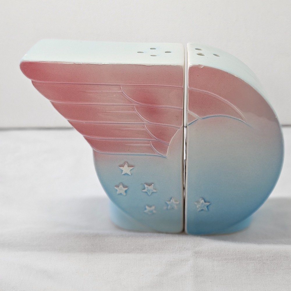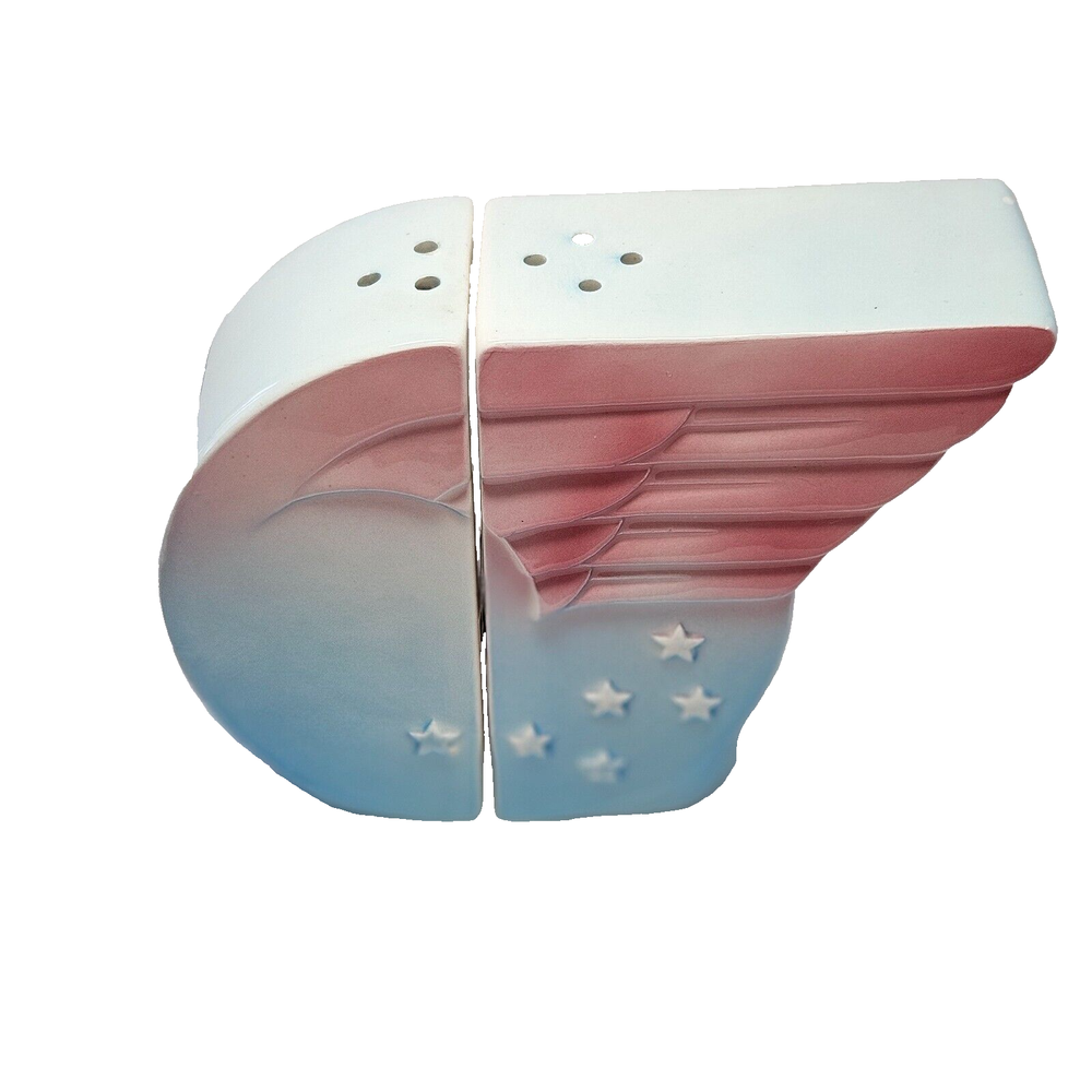 1979 Vandor Imports Pelzman Design WINGS & STARS Salt & Pepper Shakers VINTAGE Has been stored in with my salt and pepper shaker collection for years! Comes from a smoke free home. In great Vintage condition. They measure approximately 3.5" in height, 4.5" in length when placed together and 1.5" in width. They have their plastic stoppers in the bottom as well as their original stickers. See last two photos for small imperfections. If you purchase I will leave Feedback once you leave me Feedback - so I know you received the item. Thanks for looking!