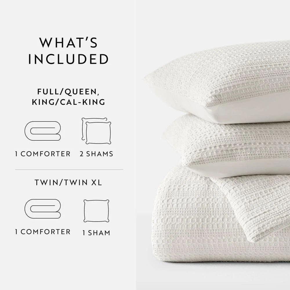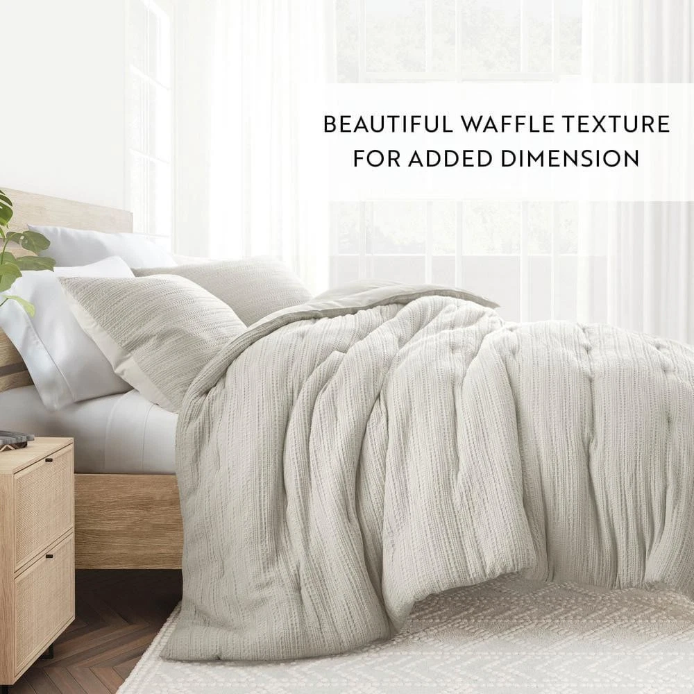 Waffle Textured 3 Piece All Season Down-Alternative King Comforter Set in Dune Oversized dimensions for extra deep mattresses Soft pre-wash finish and double brushed fabric add luxury touch. Polyester fill ensures dreamy sleep experience Indulge in the epitome of comfort with our exquisite 3-piece Waffle Textured Comforter set. Its polyester fill ensures a dreamy sleep experience, while the Soft Pre-Wash Finish and Double-Brushed fabric provide a luxurious touch. Plus, its oversized dimensions are perfect for extra deep mattresses. Elevate your sleep sanctuary today and embrace the ultimate in cozy sophistication. Bedding Material: Polyester Care Instructions: Machine Wash Color: Dune Color Family: Beige Decor Type: Bedroom Linen Decorative Accents: Textured Features: Hypoallergenic,Soft,Textured Fill Material: Polyester Lifestage: Adult Linen Type: Comforter Set Material Family: Microfiber Number of Pieces: 3 Pattern Type: Solid Color Returnable: 90-Day Set : Comforter,Pillowcases Size: King Style: Contemporary Thread Count: 0 Certifications and Listings: OEKO-TEX Standard 100 Comforter Length (in.): 16.54 in Comforter Width (in.): 12.60 in Sham Length (in.): 20 in Sham Width (in.): 36 in