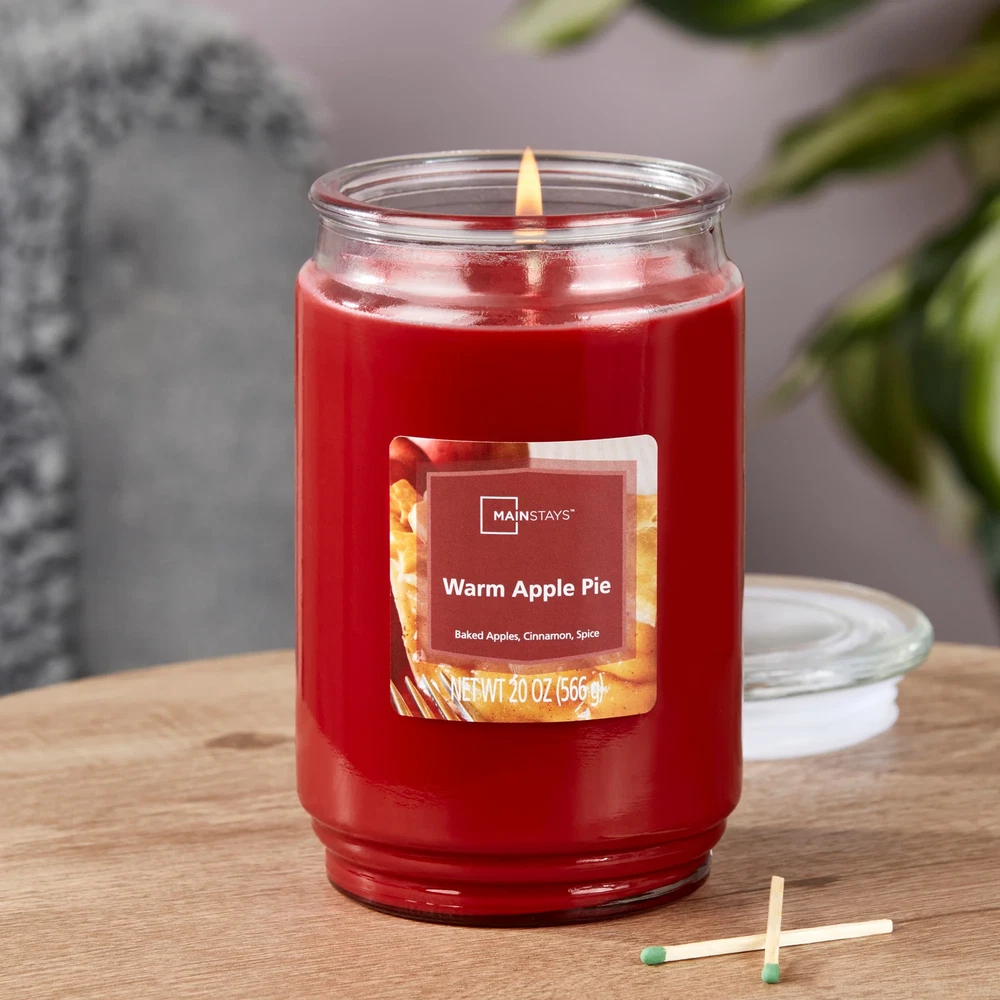 Introduce a soothing aroma into your living space with the Mainstays Warm Apple Pie Scented Single-Wick Jar Candle. Mainstays scented candles are highly fragranced and provide a clean and even burn that will fill your home with beautiful and enticing seasonal aromas. Place this candle in the kitchen, living room or dining room where you can enjoy it when entertaining guests or anytime you want to relax. Trim the wick periodically to promote even burning. Mainstays offers a wide selection of candle scents to explore and enjoy. Shop all of our Mainstays scents online and in-store. Treat yourself to the enticing scent of the Mainstays Warm Apple Pie Scented Single-Wick Jar Candle. Mainstays Warm Apple Pie Scented Single-Wick Large Glass Jar Candle, 20 oz Orchard apples, red pear, and orange zest are embraced at the heart with cranberry, nutmeg, clove, and allspice. Cinnamon stick, graham cracker crust, and vanilla add a touch of decadence at the bottom Complements virtually any room decor 20 oz. single-wick candle burns for approximately 100-120 hours Features a decorative beveled edge glass vessel Mainstays single-wick scented candles are highly fragranced, and provide a clean and even burn that will fill your home with beautiful and enticing aromas Our candles are made from high quality, non-toxic, clean-burning wax that is specifically developed to hold optimal fragrance loads Our Mainstays 20oz candle is available in a variety of scents