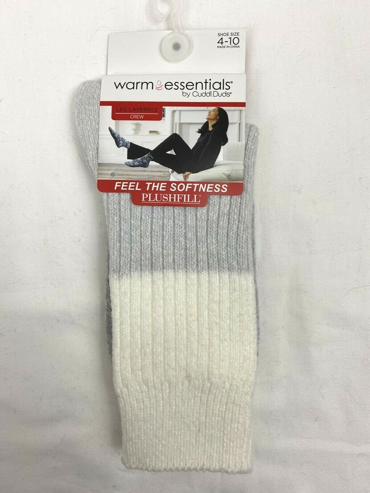 Warm Essentials by Cuddl Duds Leg Layering Crew Socks Ribbed Colorblock 4-10 Ivory NEW on hang card 1 Pair Super soft feel with PLUSFILL yarn. 99% Polyester 1% Spandex Machine wash and dry Color : Ivo...