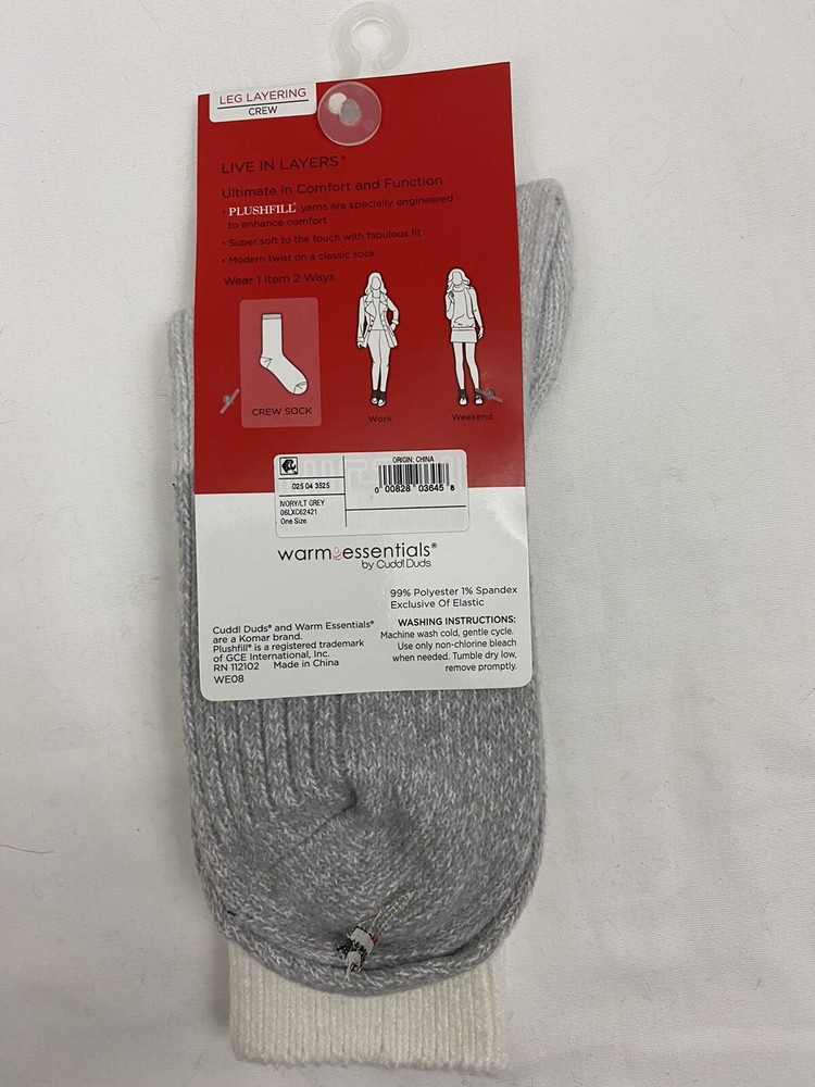 Warm Essentials by Cuddl Duds Leg Layering Crew Socks Ribbed Colorblock 4-10 Ivory NEW on hang card 1 Pair Super soft feel with PLUSFILL yarn. 99% Polyester 1% Spandex Machine wash and dry Color : Ivory and light gray Stock # SK-22