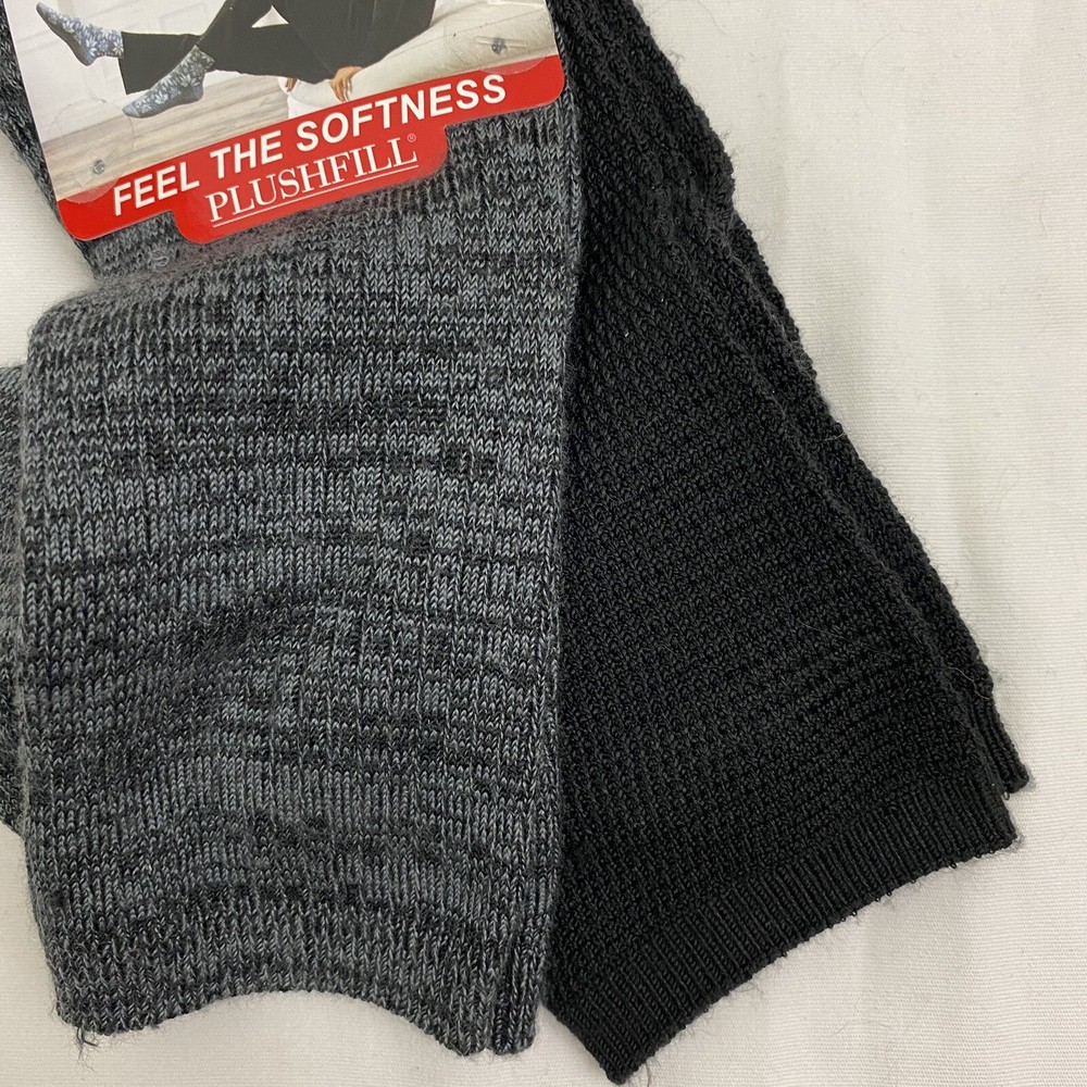 Warm Essentials by Cuddl Duds Leg Layering Crew Socks 2 pair Shoe Size 4-10 NEW on hang card Super soft feel with PLUSFILL yarn. 99% Polyester 1% Spandex Machine wash and dry Color : 1 pair black, 1 pair gray with black Stock # SK-15