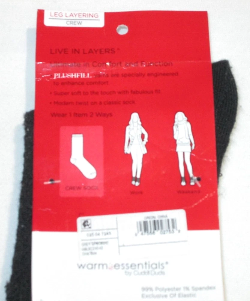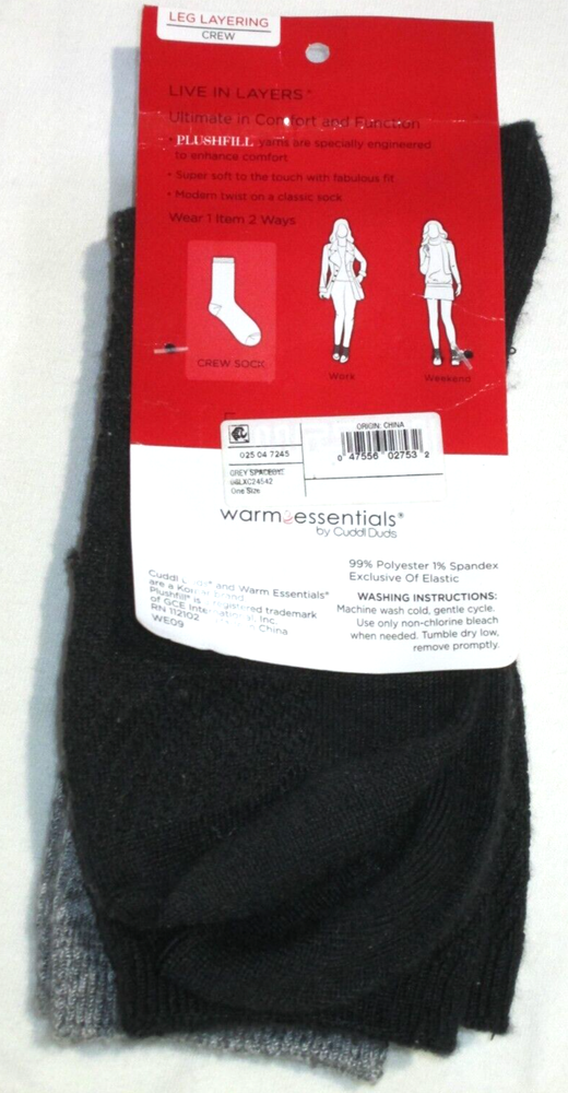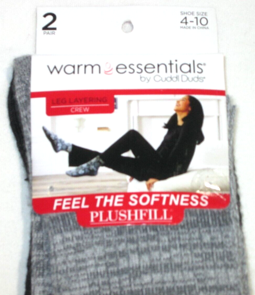 Warn Essentials by Cuddl Duds ladies' leg layering crew socks- 2 pair- new and packaged 2 pairs plushfill softness fits shoe size 4-10 heather gray and solid black cable knit supersoft to touch with fabulous fit Polyester/Spandex Nonsmoking Home I DO COMBINE SHIPPING.