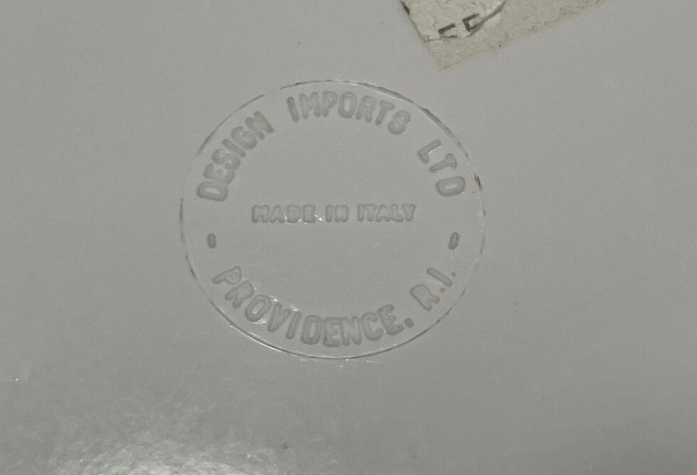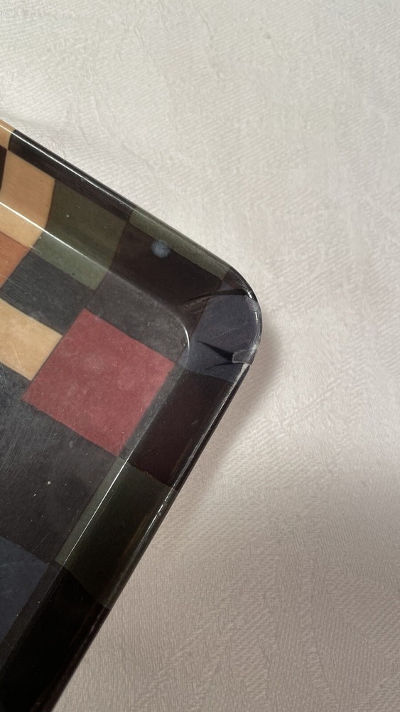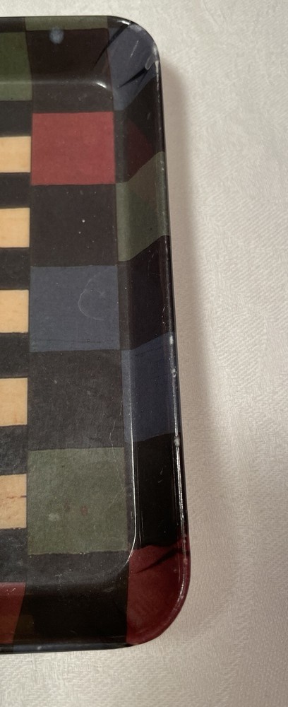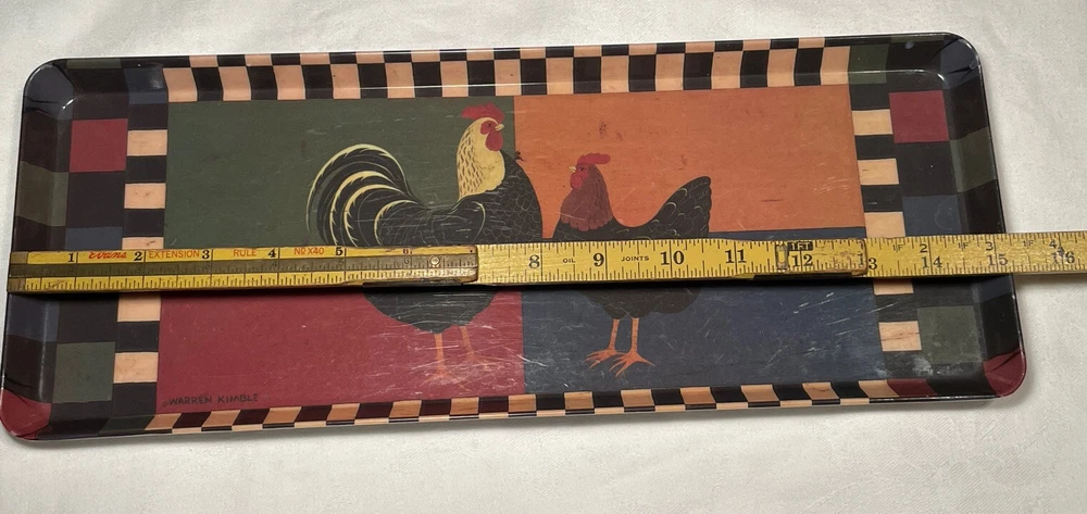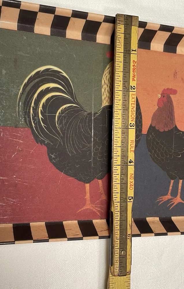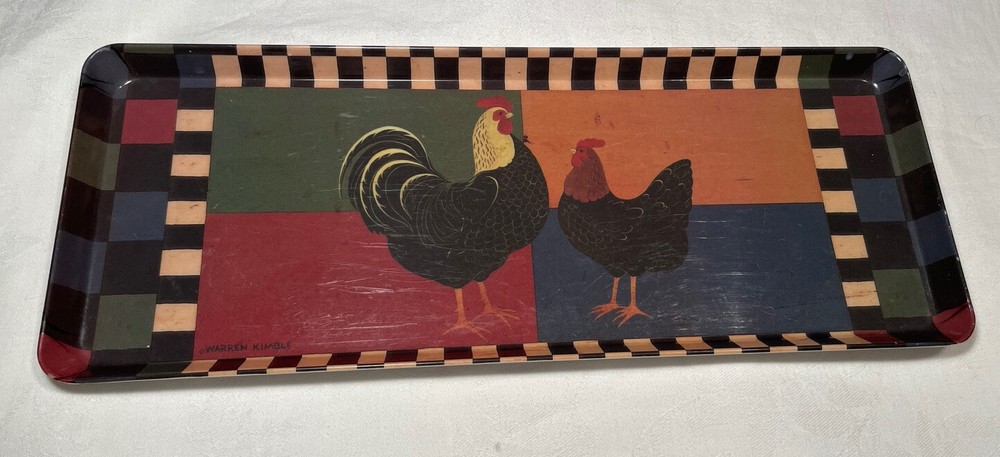 Melamine Warren Kimble Rooster & chicken serving tray by Design Imports, made in Italy. Titled “Rooster Game”. Haven’t seen this size tray before so could be quite a rarity. Iconic folk artist from Vermont featuring his famous folk art barn animals. Checkerboard & multicolored pattern on edge & surface of tray. These match and can coordinate with his other Sakura dinnerware patterns. Not perfect, some scratches. One small ding in tray near corner. Doesn’t take away from function of tray. See pictures for condition. All sales final no returns.