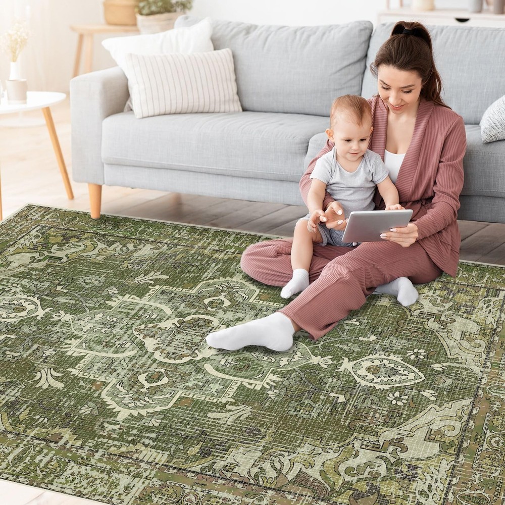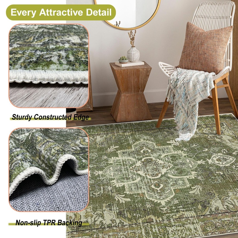Washable Boho Vintage Area Rugs 3×5 Non-Slip Traditional Olive Green Small Carpet for Living Room Bedroom Dining Room Product Details Color: Olive Green Size: 3'×5' Brand: Season wind MPN: Does not apply UPC: Does not apply EAN: Does not apply Brand: Season wind Size: 3'×5' Material: Microfiber Weave Type: Knitted Item Weight: 4.5 Pounds Brand: Season wind Size: 3'×5' Material: Microfiber Weave Type: Knitted Item Weight: 4.5 Pounds Pile Height: Low Pile Construction Type: Machine Made Back Material Type: Thermoplastic Rubber (TPR) Color: Olive Green Indoor/Outdoor Usage: Indoor Is Stain Resistant: Yes Product Care Instructions: Machine Wash Pattern: Printed Shape: Rectangular Product Dimensions: 60"L x 36"W Rug Form Type: Area Rug Style: Rustic Water Resistance Level: Water Resistant Item Weight: 4.5 pounds Manufacturer: AREARUGSW2 Country of Origin: China Date First Available: August 21, 2024 High-quality Material: Made of microfiber. Ultra soft, great choice for indoor use . Trendy Style: This Boho and vintage style area rug will add character to your home. With vintage distressed print design, it can complement any decor of your home , from the living room, dining room, bedroom, entryway, nursery, dorm room, study, home office, or kitchen, creating a colorful, gorgeous, romantic, cozy ambience. Product Note: Please unfold the rug when you receive it. There may be temporary creases at the beginning, please don't worry. Use your hand to gently smooth them out, flatten them on the floor and walk around, it will lie flat within a few days after rug is unrolled. Machine Washable Rug : Use vacuum cleaner or rag for daily cleaning, our rugs are stain resistant,generally 3-14 months for a deep cleaning. Superior Anti-Slip Backing: The rugs are Composed of durable upgrade TPR rubber backing. It's a safer and friendlier non-slip material. It's suitable for all kinds of floors. Also the edge woven tightly, you don't need to worry about it falling apart any more.