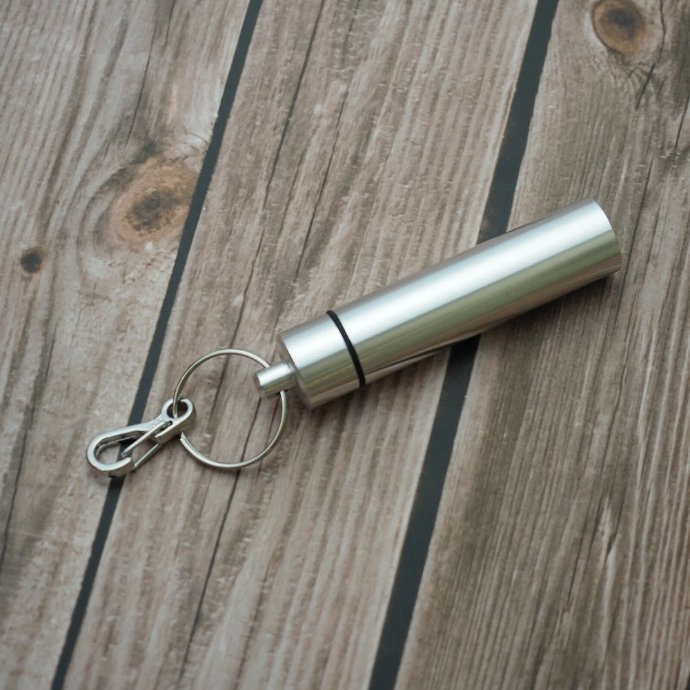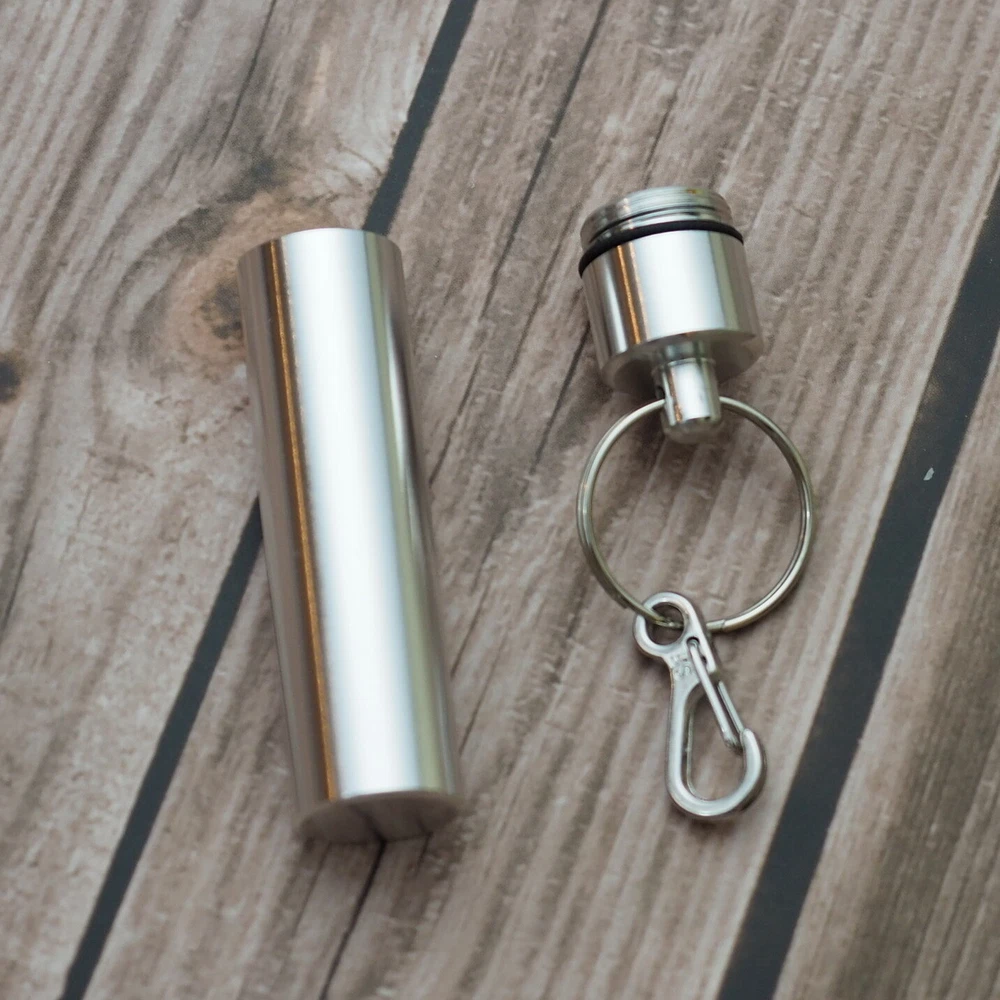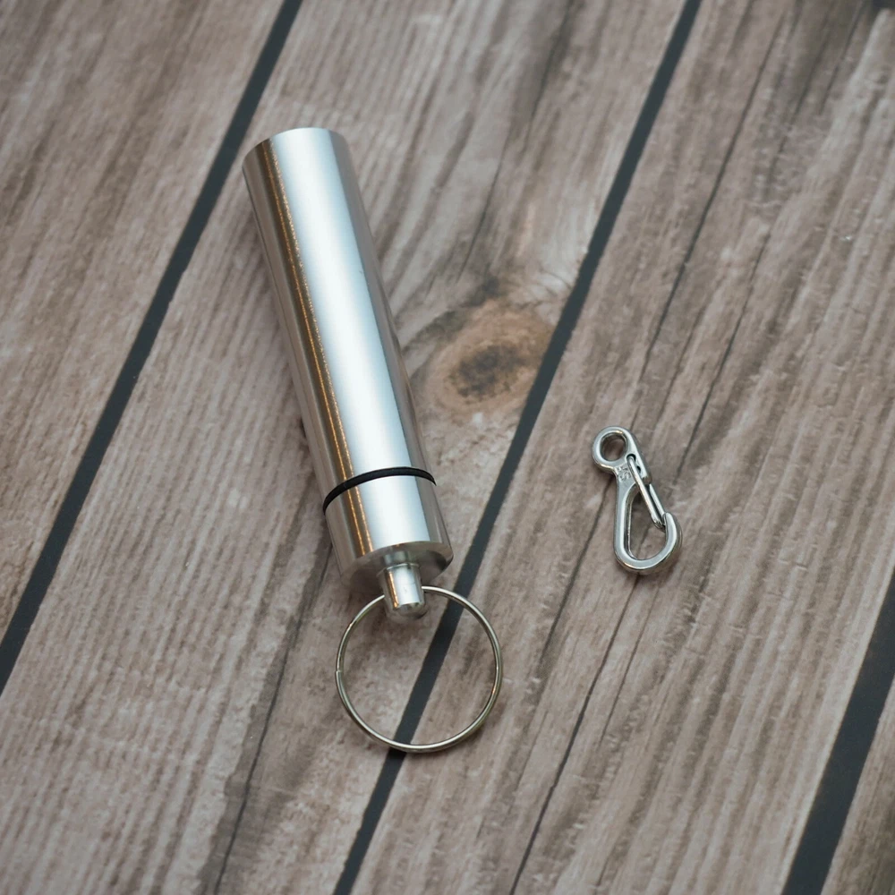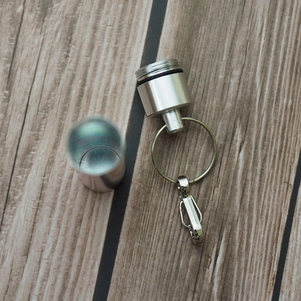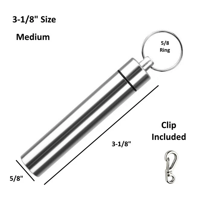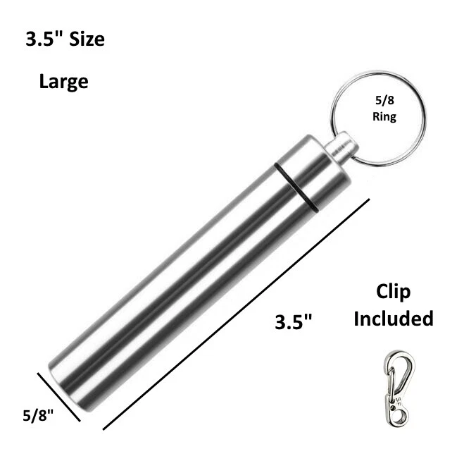 The pill holder cap has a rubber O-ring gasket making it airtight and watertight / waterproof enough to keeps your pills / items inside safe and dry. Convenient clip included. Clip to your backpack, keyring or inside suitcase when you are on vacation, trip, camping or any EDC survival outdoor gear. Package Includes: 1x Keychain Pill Holder with Clip - Choose Size from Drop Down Menu Color: Silver Size: Choose from Drop Down Menu Material: Aluminum Tube and Metal Ring --------------------------- Large Size Info: diameter: 21/32" inch Tube Length: 3.5" Keyring Size: 7/8" Material: Aluminum Alloy Product Weight: 16g / 0.6oz ---------------------------- Medium Size Info: diameter: 21/32" inch Tube Length: 3.1" Keyring Size: 7/8" Material: Aluminum Alloy Product Weight: 14g / 0.5oz See all our other Pill Cases Storage Items Visit our eBay Store!