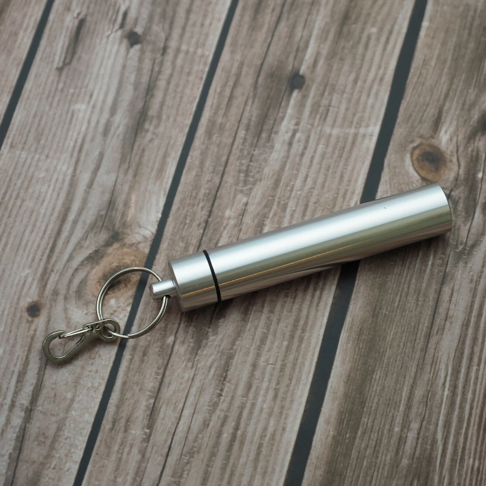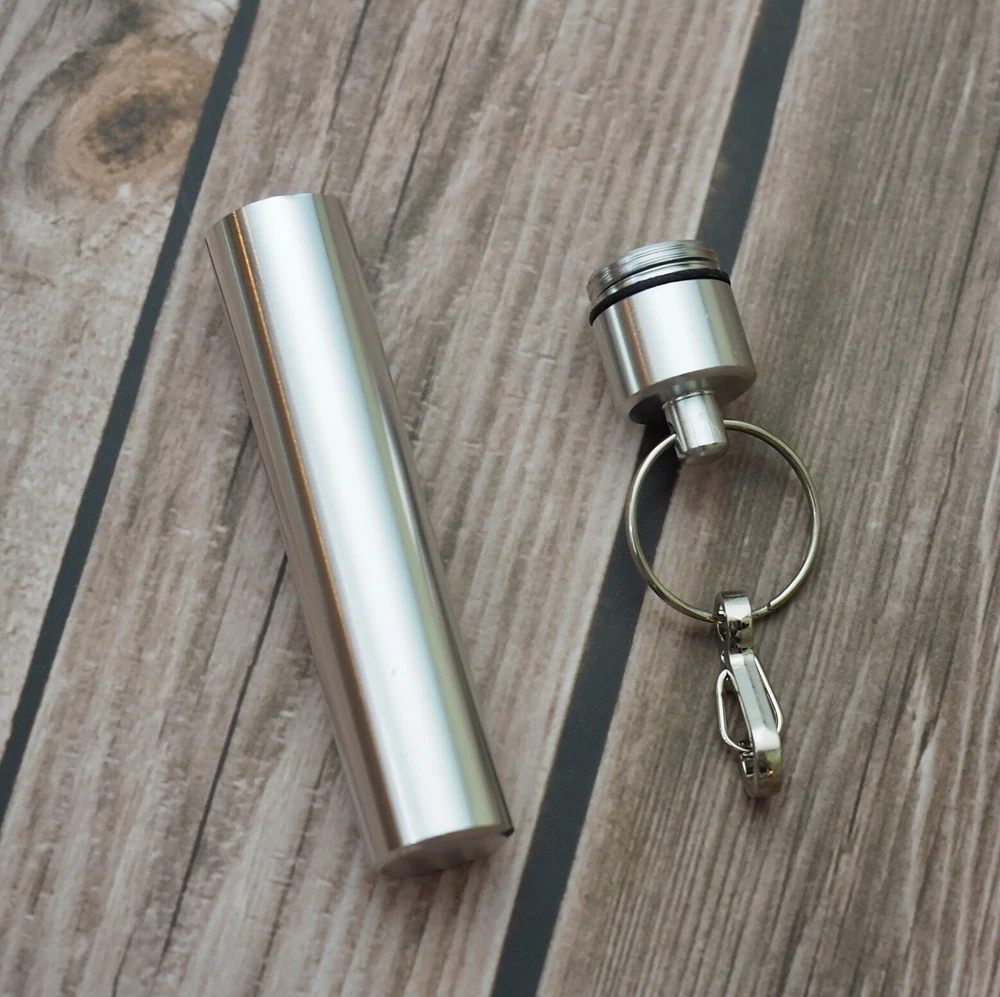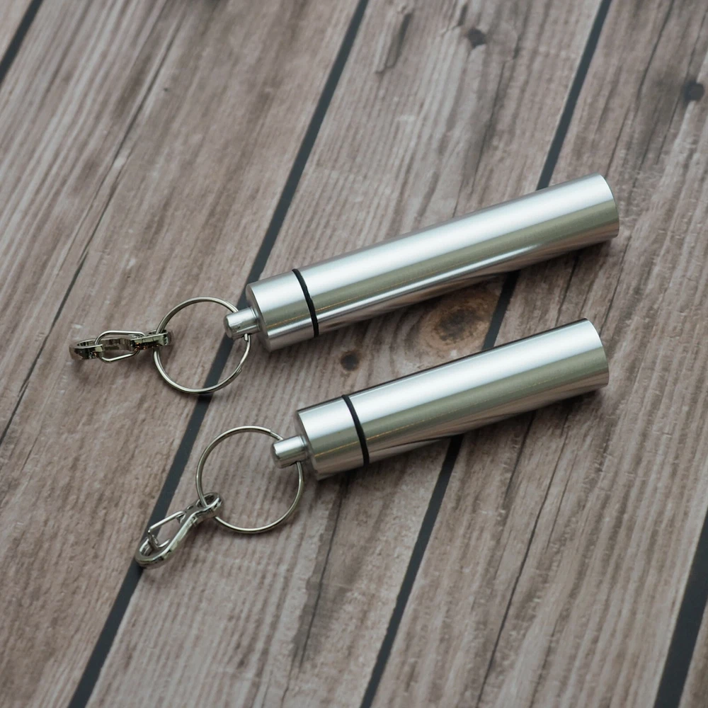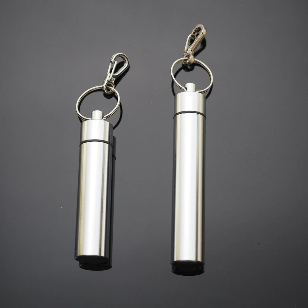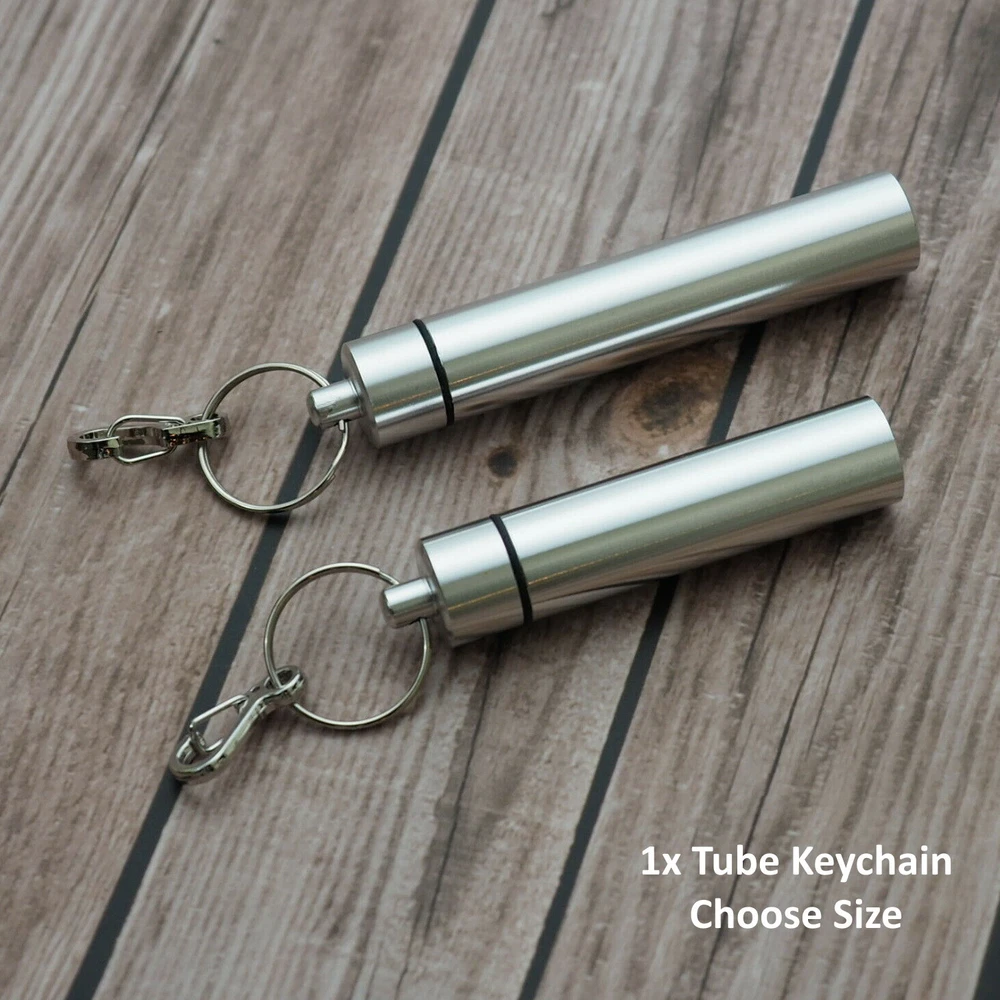 The pill holder cap has a rubber O-ring gasket making it airtight and watertight / waterproof enough to keeps your pills / items inside safe and dry. Convenient clip included. Clip to your backpack, keyring or inside suitcase when you are on vacation, trip, camping or any EDC survival outdoor gear. Package Includes: 1x Keychain Pill Holder with Clip - Choose Size from Drop Down Menu Color: Silver Size: Choose from Drop Down Menu Material: Aluminum Tube and Metal Ring --------------------------- Large Size Info: diameter: 21/32" inch Tube Length: 3.5" Keyring Size: 7/8" Material: Aluminum Alloy Product Weight: 16g / 0.6oz ---------------------------- Medium Size Info: diameter: 21/32" inch Tube Length: 3.1" Keyring Size: 7/8" Material: Aluminum Alloy Product Weight: 14g / 0.5oz See all our other Pill Cases Storage Items Visit our eBay Store!