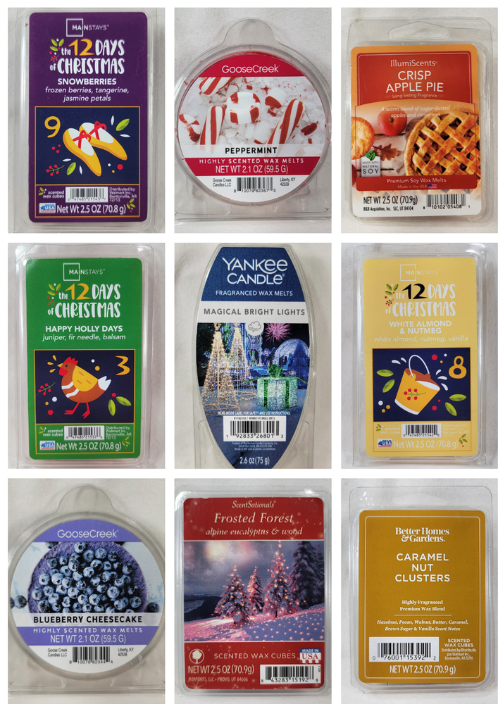 Wax Melts - Goose Creek, Yankee Candle, Illumiscents, ScentSationals, and more! Pay one shipping price no matter how many you order! $3.99 for 1 pack or 1000! Discounts for multiples to SAVE! Enhance the ambiance of your living space with these scented, flameless wax melts. Most packs include six bars of wax in a modern style, with a colorful multicolor design. These wickless tart/bars are perfect for creating a pleasant and inviting atmosphere in your home. The melts are made of high-quality wax and come with a variety of features, including a smokeless and flameless design, making them a great choice for those who want to enjoy scented fragrance without the hassle of traditional candles. Better Homes & Gardens (BHG) Caramel Nut Clusters - Hazelnut, Pecan, Walnut, Butter, Caramel, Brown Sugar & Vanilla Christmas Candy Shop - Berry, Mint, Anise, Cinnamon & Spice Cinnamon Sugar Frosting - Cinnamon, Orange, Clove, Buttercream, Spice, Vanilla & Whipped Cream Coconut Snow - Coconut, White Rum, Cinnamon, Vanilla & Spice Cranberry Apple - Apple, Cranberry, Currant, Green, Fruit & Berry Gilded Spice - Citrus, Pepper, Incense, Cedarwood, Cinnamon, Saffron, Leather, Spice, Amber, Wood & Vanilla Holiday Spice Cupcakes - Citrus, Ginger, Orange, Cinnamon, Clove, Allspice, Cake Batter, Vanilla & Buttercream Peppermint Cinnamon Snowflakes - Peppermint, Cinnamon, Butter, Shortbread, Spice, Cookies & Vanilla Pinesap & Clove - Pine, Black Pepper, Evergreen, Spruce, Clove Bud, Fir Resin, Clove & Nutmeg Snowball Shortbread Cookies - Vanilla, Sugar, Buttercream Frosting, Vanilla Cake, Sugarcane & Whipped Cream Spiced Buttered Rum - Rum, Butter, Spice, Dark Rum, Winter Spice Complex, Maple, Butterscotch & Vanilla Sugared Marshmallow & Cocoa - Marshmallow, Sugarcane, Vanilla, Chocolate, Hot Cocoa & White Cream Vanilla Spruce - Aromatic, Fir Needle, Evergreen, Vanilla Bean, Fir Balsam, Vanilla, Amber & Sweet Winter Berry Woods - Fruit, Berry, Cherry, Cranberry, Apple, Plum, Green, Wood & Musk Mainstays - 12 Days of Christmas Day 1 - Cranberry Mandarin Spice - Citrus, Cranberry, Spice Day 2 - Chocolate Peppermint Bark - Peppermint, Sugarcane, Chocolate Day 3 - Happy Holly Days - Juniper, Fir Needle, Balsam Day 4 - Warm Apple Pie - Baked Apples, Cinnamon, Spice Day 5 - Holiday Gingerbread - Orange, Ginger, All-Spice Day 6 - Country Holiday - Winterberry, Snowdrop Petals, Cypress Day 7 - Snow Flurries - Ozone, Peppermint, Eucalyptus Day 8 - White Almond & Nutmeg - White Almond, Nutmeg, Vanilla Day 9 - Snowberries - Frozen Berries, Tangerine, Jasmine Petals Day 10 - Winter Woods - Green, Cypress, Wood Smoke Day 11 - Juniper Berry - Festive Juniper Berry, Bergamot, Honey Day 12 - Evergreen Mountain - Evergreen Pine, Crisp Cedar, Warm Amber ScentSationals Believe! - Spirit of Christmas! Cranberry Buttercream - Extra Creamy! Farmhouse Apple Tart - Absolutely Delicious! Frosted Forest - Alpine Eucalyptus & Wood Mistletoe Magic - Christmas Kiss Nordic Sleigh - Berries & Pine Pumpkin Cream & Marshmallow - It's A Marshmallow World, Limited Edition IllumiScents Crisp Apple Pie - A warm blend of sugar-dusted apples and cinnamon Homemade Cinnamon Rolls - Warm cinnamon rolls with buttercream frosting Yankee Candle Shimmering Christmas Tree - This is a woody fragrance. Notes of dewy greens, warm spices, and fir balsam sparkle as you experience this cheery, colorful, Christmas tree. Magical Bright Lights - This is a fresh and clean fragrance. The night is bright with twinkling colored lights as the aromas of pear, mint leaf, jasmine, and vanilla enchant you.