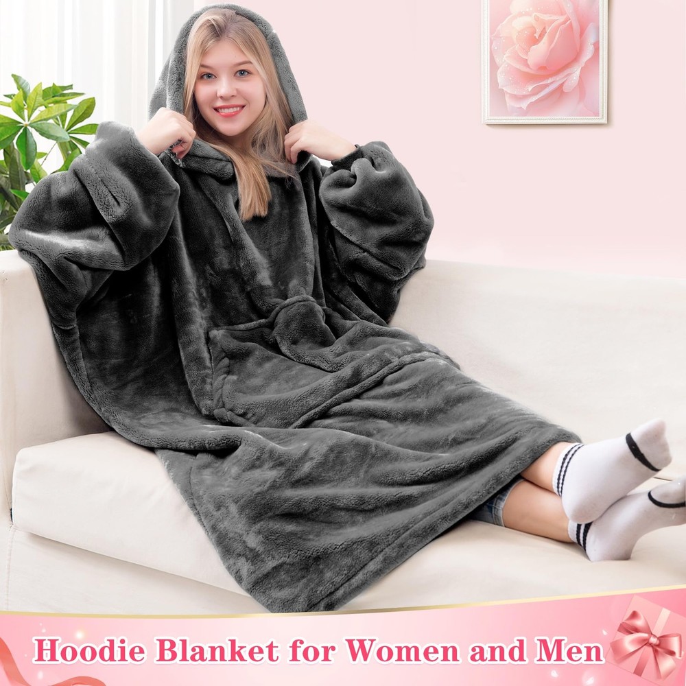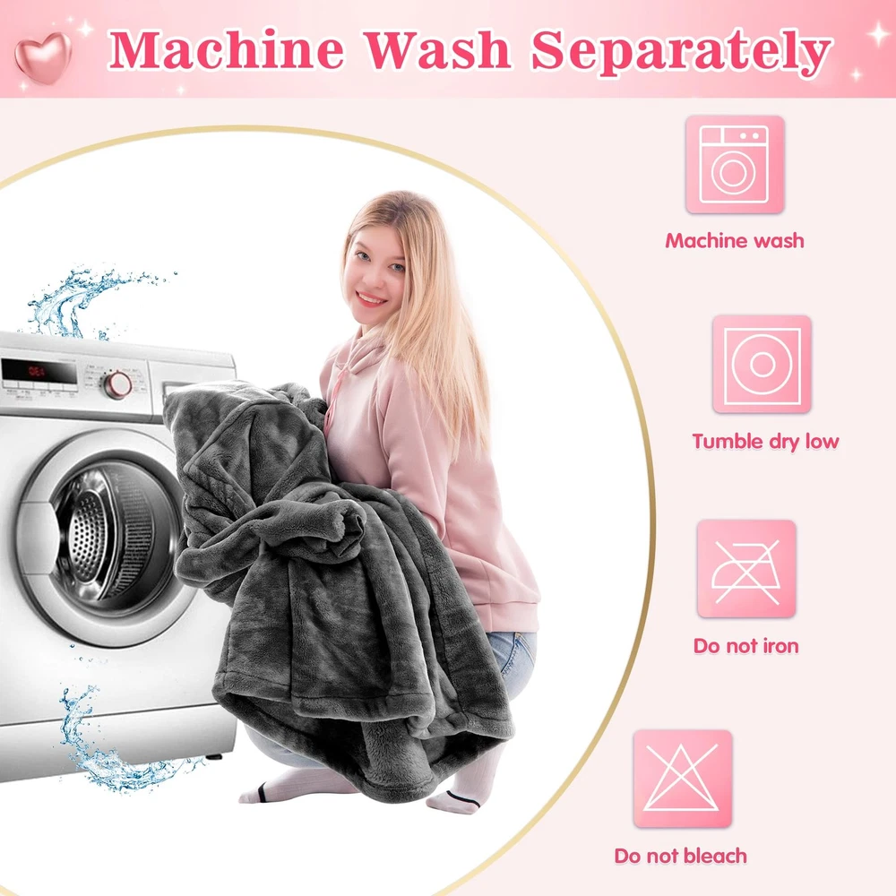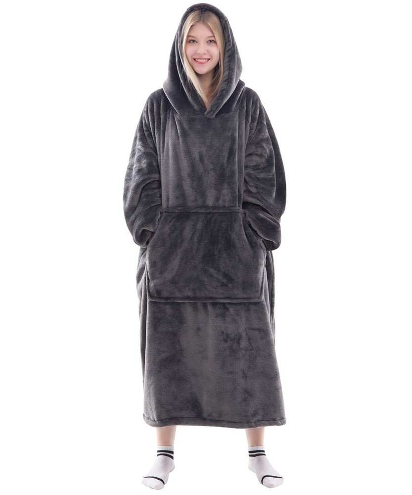 Package Included: 1 * Wearable Blanket This plush hoodie wearable blanket with a classic simple design that keeps you warm and cozy. Purpose: You can cover your entire body into this giant blanket. You can wear it for lounging around the house, or any camping or outdoor activities. FLUFFY HOODED BLANKET: This is a true oversized hoodie blanket for women and men. It is designed for customers looking for softness. Cozy and warm, a must have for enjoying happy hours. It is perfect for lounging at home, watching TV, gaming, reading a book, napping, or any camping or outdoor activities. MAXIMUM COMFORT: Blanket hoodie with sleeves cover shoulders, arms, allows you to move around, use your hands freely. The big plush hood keeps your head toasty warm and long enough to wrap your legs free to move without curling up that keep you warm from head to toe. INTIMATE DETAIL DESIGN: Cozy plush fabric for soft touch. A perfect size for women men. There is a big pocket to hide the TV remote, phone, snacks, and more with ease of access. You can pull your hands inside for extra warmth and take your warmth wherever you go. PERFECT GIFT: It’s the best gift for Christmas, birthday, Thanksgiving, Mother's Day, Father's Day and anyother special occasion. This blanket hoodie is the best present for wife, best gifts for husband, best gifts for mom, best gifts for dad, best gifts for girlfriend boyfriend teenagers and etc. EASY CARE: Sincerely recommend that you wash this giant blanket separately before you use it. Machine washable long wearable blanket in cold water, tumble dry on low heat, no ironing or expensive cleaning required! This oversized hoody blanket stays the same after every wash.