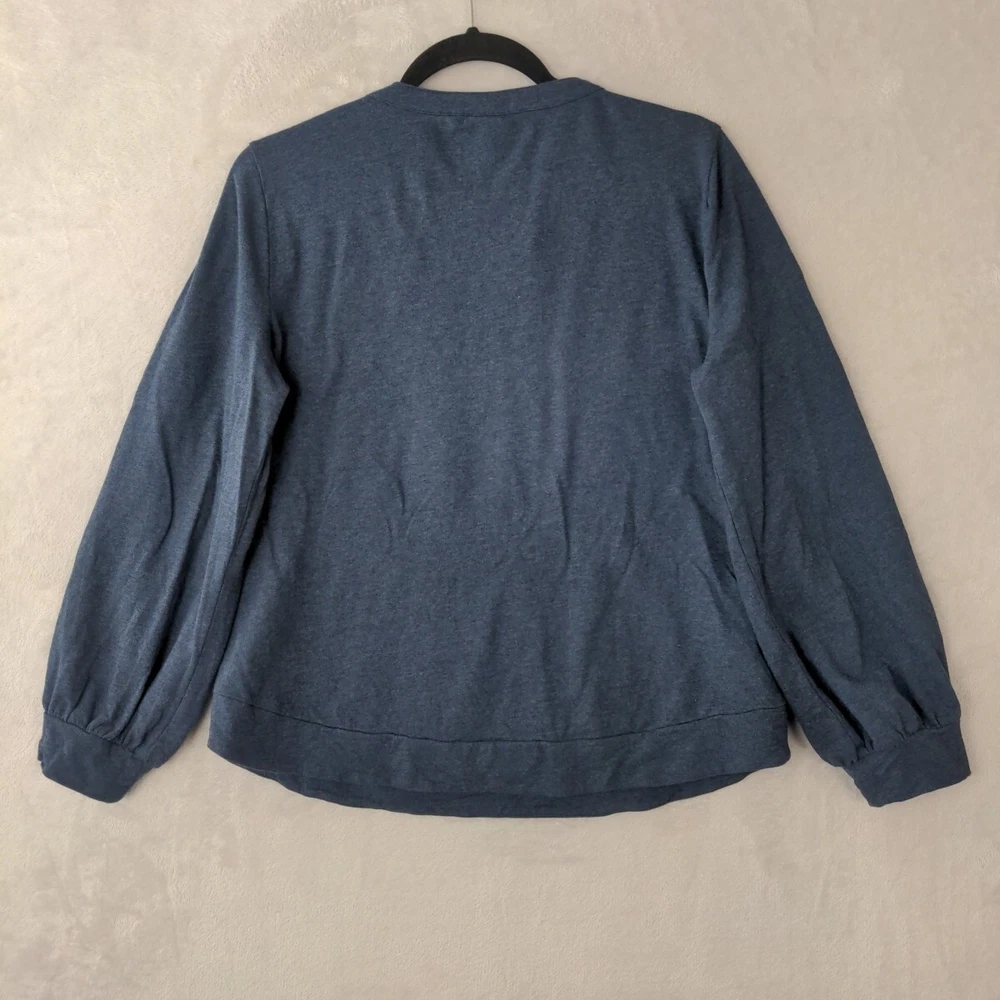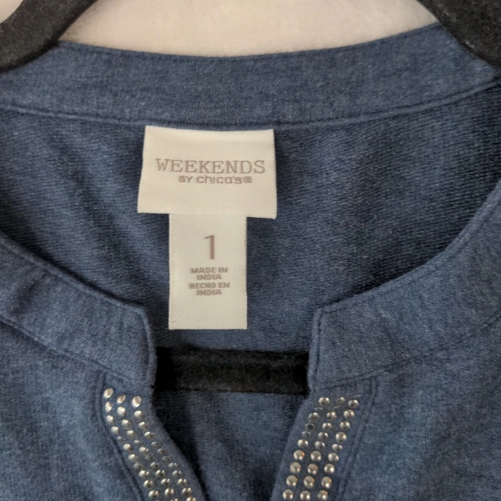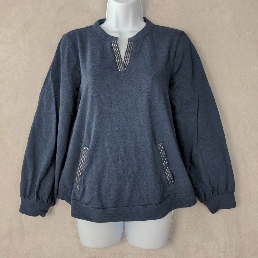 This top is so comfortable and stylish—the soft jersey knit feels amazing, and the metallic dots add just the right touch of flair. The pockets are a fun, functional detail, and the fit is perfect (true to size!). Minimal wear, looks brand new. Super fast shipping and great communication from the seller. Love it—would definitely buy again!