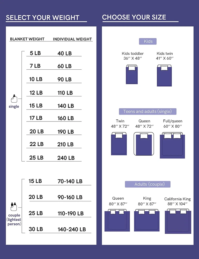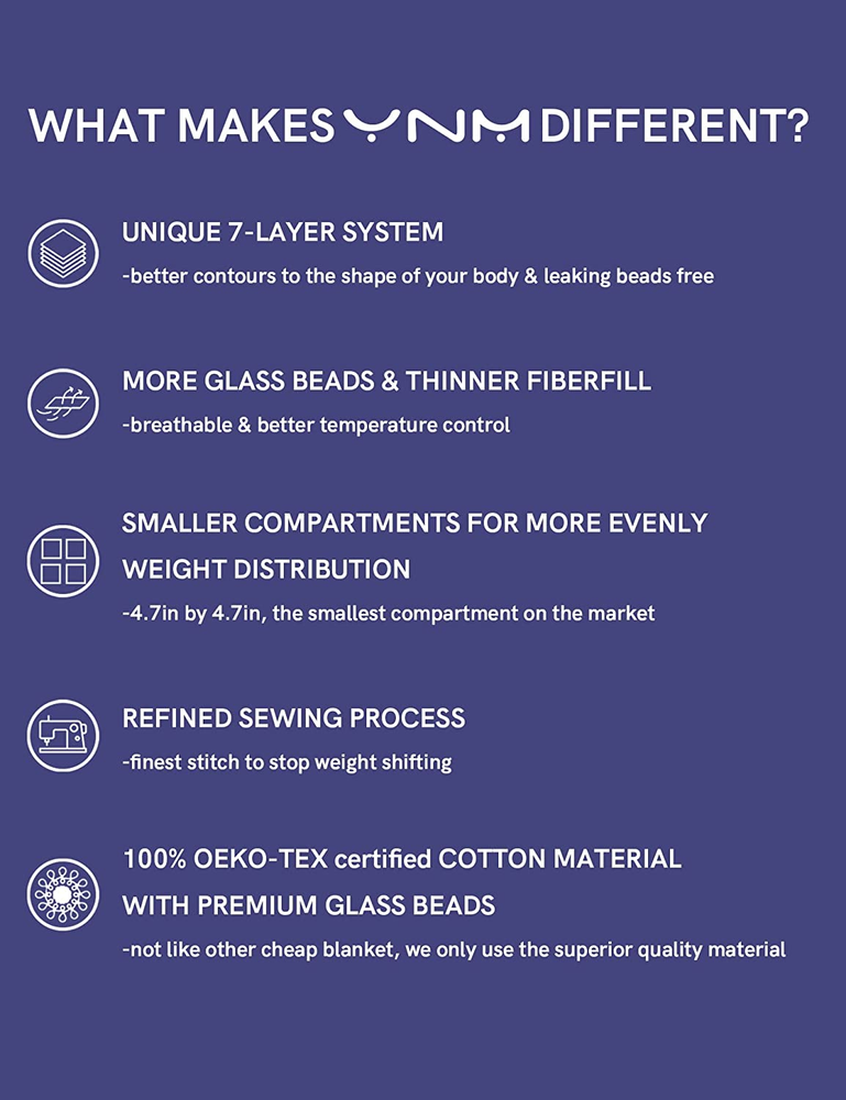 Store New Arrivals Add to Favorite View Feedback Contact Weighted Blanket,Heavy 100 Percent Oeko-Tex Certified Cotton Material, Bed Blanket for One Person of 240Lbs, Ideal for Queen/King Bed (60X80 Inches, 25 Pounds, Light Blue) Description Item model number qianlan25lbs Style Simple and Cozy Pattern Patchwork Country of Origin China Blanket Form Weighted Blanket Theme Plain Import Imported Unit Count 1.0 Count Batteries required No Product Dimensions 60"L x 41"W Material Cotton Age Range (Description) Adult Seasons All Item Weight 25 pounds Special Feature Breathable Fabric Warmth Description Lightweight Color Light Blue丨cotton丨original Recommended Uses For Product Napping, Sleeping Sport sleep Fabric Type 100 Percent Cotton Product Care Instructions Machine Wash Size 60 in x 80 in 25 lb 100 Percent Cotton Imported [Innovative Design] The 7-layer system design adapts to the curve of your body for optimal comfort and the 4.7x4.7-inch smaller sections allow for more equitable weight distribution. It includes more glass beads and less fiberfill for enhanced temperature regulation. In addition, a three-dimensional lock bead stitching method prevents leaking of beads. It has the finest stitching (0.25mm per stitch) to avoid movement of weight between compartments. [Unique Sleeping Experience] YnM provides a natural means of calming the body for a good night's sleep. It is a wonderful sensory blanket for adults and children to help them relax and feel at ease. Great gifts for your loved ones. [Sizing Guide] To choose a size for 1 adult, take 10% of your body weight, then add 1 lb, Please select a weighted blanket measuring 80x87 inches or 88x104 inches for sharing. [Easy Care] Machine washable in a gentle setting. Tumble dry on a low setting or line dry. Use a mild detergent and avoid bleach. If you use YnM weighted blanket with a duvet cover, then you can just wash the light weight duvet cover instead of washing the heavy inner weighted blanket. [Reminder] Weighted blankets are not meant to hang off the edge of your bed. This concentrates weight into the areas where it is needed most. On you! So a weighted blanket is much smaller than an ordinary blanket. Product Description YNM provides premium-grade products that help relax your body to fall asleep faster and sleep better SNUG AS A HUG The video showcases the product in use. The video guides you through product setup. The video compares multiple products. The video shows the product being unpacked. Wrap yourself in good vibes. Simmer down and breathe easy while nestled in our soothing weighted blanket. cotton duvets available popular cooling weighted blankets from YNM 2.0 VS 3.0 2.0 VS 3.0 knitted weighted blanket from YNM Weighted blankets are usually smaller than regular size bed blankets and smaller than your mattresses If you want the look of weighted blanket hanging off the edge of your bed, choose the blanket size which is bigger than your matterss Only 80" x 87" and 88" x 104" are meant for sharing use YNM RELAXING PRODUCTS Add to Cart Add to Cart Add to Cart Add to Cart Customer Reviews 4.6 out of 5 stars 47,989 4.5 out of 5 stars 8,093 4.3 out of 5 stars 988 4.5 out of 5 stars 8,093 4.5 out of 5 stars 12,122 4.3 out of 5 stars 2,260 4.4 out of 5 stars 700 Price — $89.90 $ 89 . 90 — — $27.90 $ 27 . 90 $49.99 $ 49 . 99 $44.99 $ 44 . 99 Material cotton bamboo & velvet velvet bamboo Cotton/Bamboo/Linen bamboo polyester Weighted? ✔ ✔ ✔ ✔ ✘ ✘ ✘ Four seasons use? ✔ ✔ ✔ ✔ ✔ ✔ ✔ Hand made? ✘ ✘ ✔ ✘ ✘ ✘ ✔ Cooling? ✘ ✔ ✘ ✔ ✔ ✔ ✘ ABOUT US We offer the best prices around on high quality products. Our E-store includes media such as books, movies, music and games while offering electronics, toys, sporting apparel, clothing, tools, general home, garden items and more. SHIPPING We are always working hard to ensure your package arrives as soon as possible. Please understand that some factors like weather, high postal traffic, and the performance of shipping companies are outside of our control. We offer free shipping to the lower 48 states and ship within 2 business days of payment, usually sooner. We do not accept P.O. Boxes. Please provide a physical address. For shipping outside of the continental USA, we only use eBay's Global Shipping Program.The item is shipped to KY and then sent to the rest of the world. International customers are responsible for all duties and taxes. Continue to check out in order to calculate costs for shipping the item to your country. Messages regarding eBay's Global Shipping Program MUST be directed at eBay EXCLUSIVELY. RETURNS We offer a 30-Day Return Policy on items which you are not completely satisfied with. You have the option for a full-refund or an exchange of the item. No returns are available on items shipped outside of the USA. PAYMENT We accept PayPal. CONTACT US This page content is yet to come Please ad us to your favorite seller and visit again later Thank You CUSTOMER SATISFACTION We try our very best to make sure every customer is completely satisfied. If there's a problem, message us! We're happy to help.