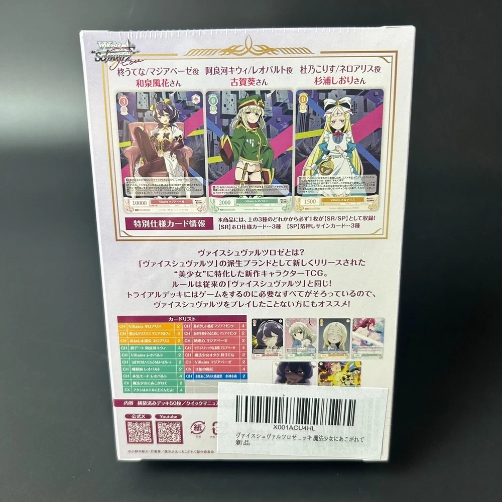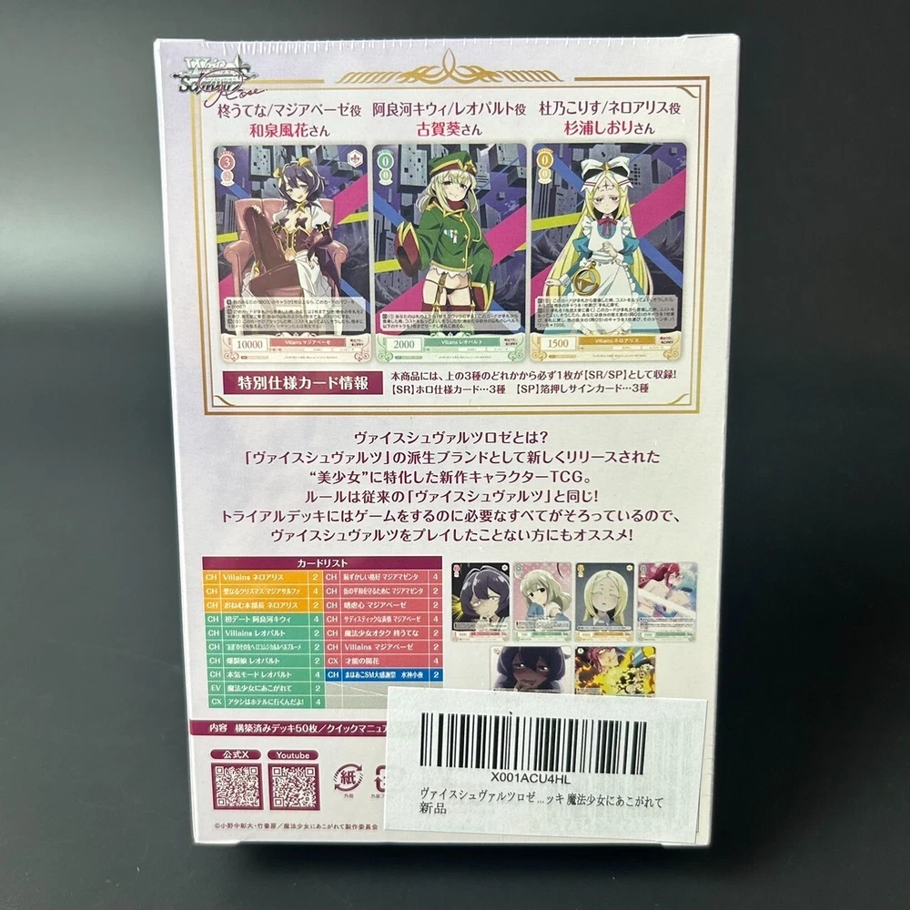 Free eBay listing template designed by dewiso.com Welcome to izu-shop.japan !! About the product ------------------------------------- Please look carefully at the photos listed. -Weiss Schwarz Rose Gushing Over Magical Girls Trial Deck Japanese Sealed New <Release date> 2025.04.25 <Content> -Includes a pre-constructed deck of 50 cards (deck contents are fixed), -a quick manual, -deck guidebook, -play mat <Information> -What is "Weiss Schwarz Rose"? This is a new character card game that focuses on "beautiful girls" and is being released as a spin-off brand of Bushiroad's character card game "Weiss Schwarz," which has over 150 titles. The rules are the same as the original "Weiss Schwarz," so it's an easy card game to start with, especially for those who have played "Weiss Schwarz." "Longing for a Magical Girl" joins the new TCG "Weiss Schwarz Rose"! Includes many famous scenes! You can play with the cards from the booster pack "Longing for a Magical Girl" that will be released at the same time! Return Policy We offer a standard free 60 days refund or exchange policy. Item must be returned in original condition in order to receive a full refund. Shipping Packing uses boxes or envelopes. We use a lot of cushioning materials and carefully pack the products so that they are not subjected to shocks and loads as much as possible. We provide a valid tracking number for all orders. We strive to ship items quickly within handling time. Contact If you have any questions or issue, we are at your service. You can email us anytime through ebay messages. If there are any Japanese products you want or are interested in, Please feel free to ask. Thank you for viewing this product. Please see the attached photos for the appearance and condition of this item. Also, if you have any questions, feel free to ask. I look forward to doing business with you. Plaese buy it !! [Payments] We accept PayPal and all major Debit / Credit Cards. We can only ship your item after your payment clears. Please check your address before paying bacause we can only ship to addresses that are entered before placing the order. We cannot change an address after the order has already been placed. [Customs Duty] Import duties, taxes, and charges are not included in the item price or shipping cost. These charges are the buyer's responsibility. Please check with your country's customs office to determine what these additional costs will be prior to bidding or buying. We will reply to your question or invoice within 3 days. We can't not reply gifts or unreasonable requests such as declared amount. About Our Store I am a Japanese seller who sells Japanese products. Until now, we have sold many Japanese items to buyers all over the world through eBay.On eBay, we have received high praise from many buyers and are active as top class sellers. We can sell you many types of Japanese items such as CD, Blu-ray, DVD, Card Game, Toy hobby, Anime goods, Books, Game etc. We will safely and securely deliver high-quality and valuable cards from Japan to your country in careful packaging and with a tracking number . We look forward to your purchase.