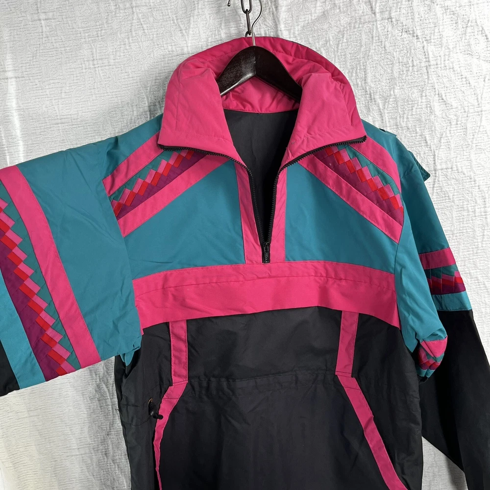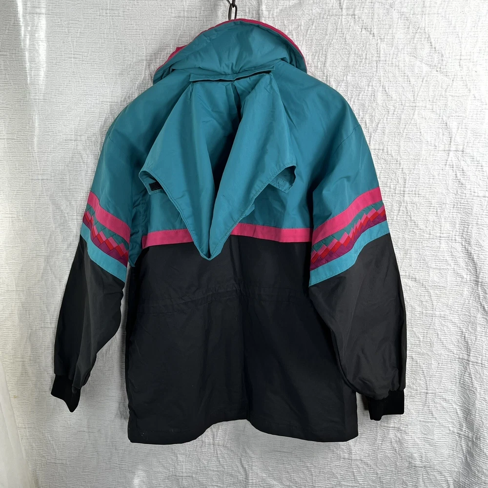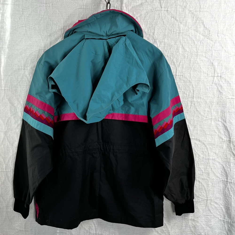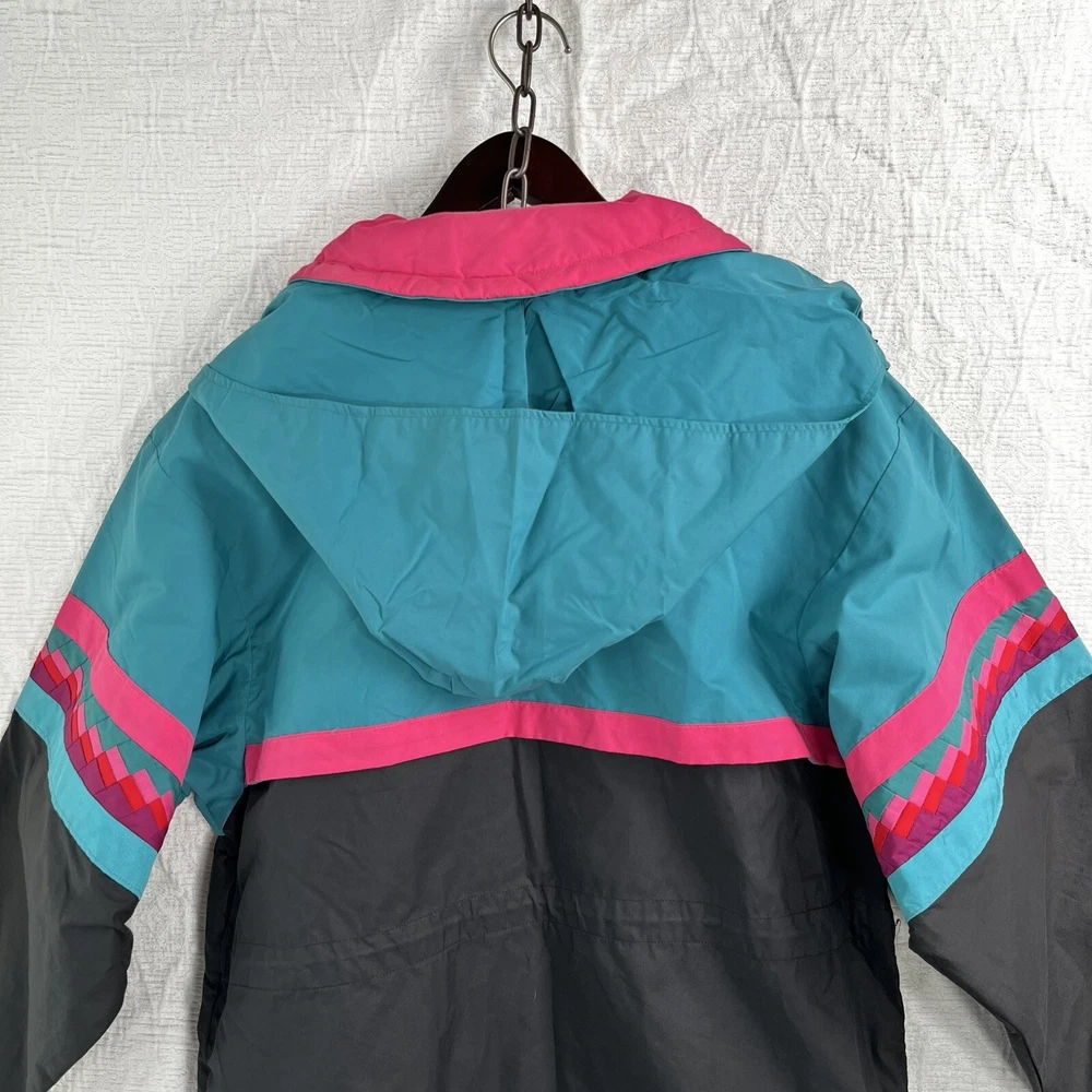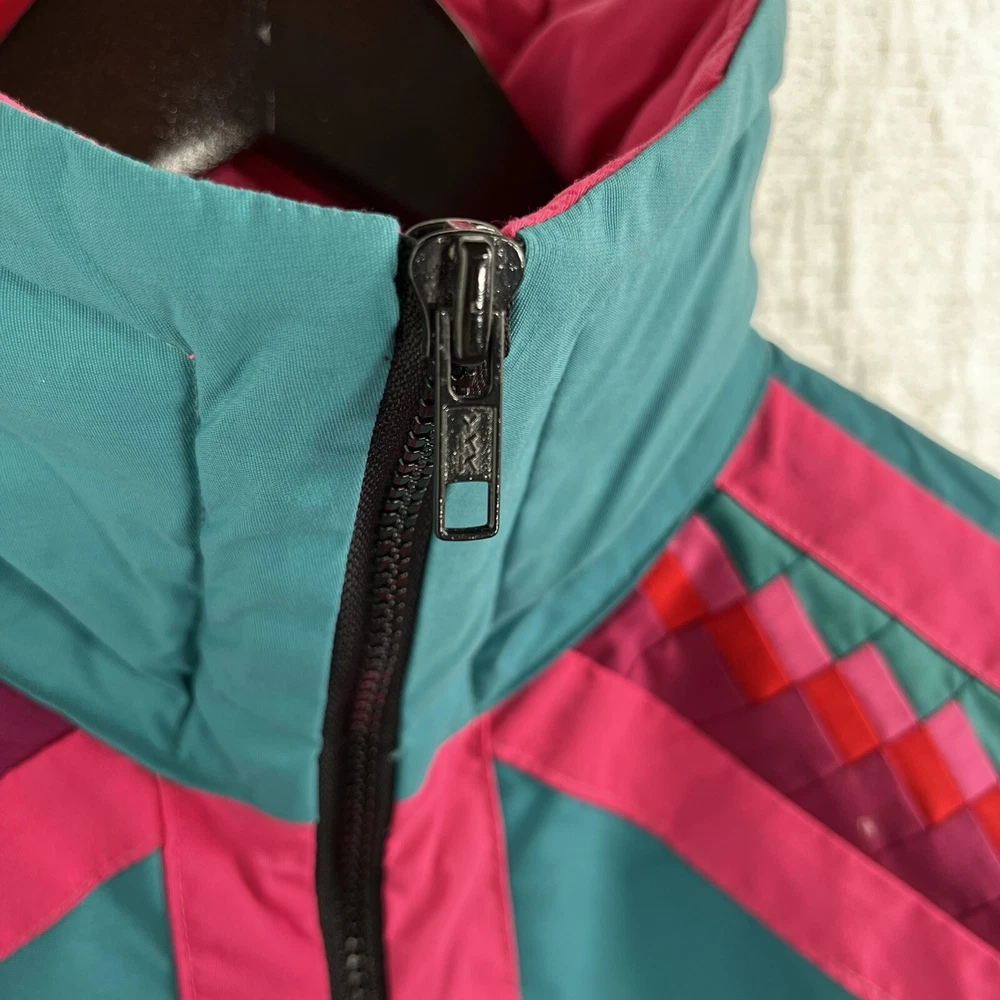 Wellspring Design Vintage Geometric Quilted Coat hand sewn by Phyllis Wells in Bozeman Montana size M chest 24” length 31” removable hood really good used condition no flaws found super late 80s early 90s ski culture x grandma corps quilting club.