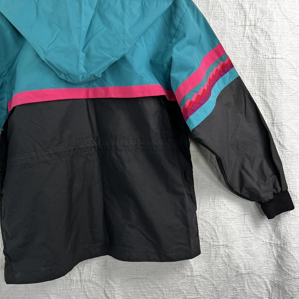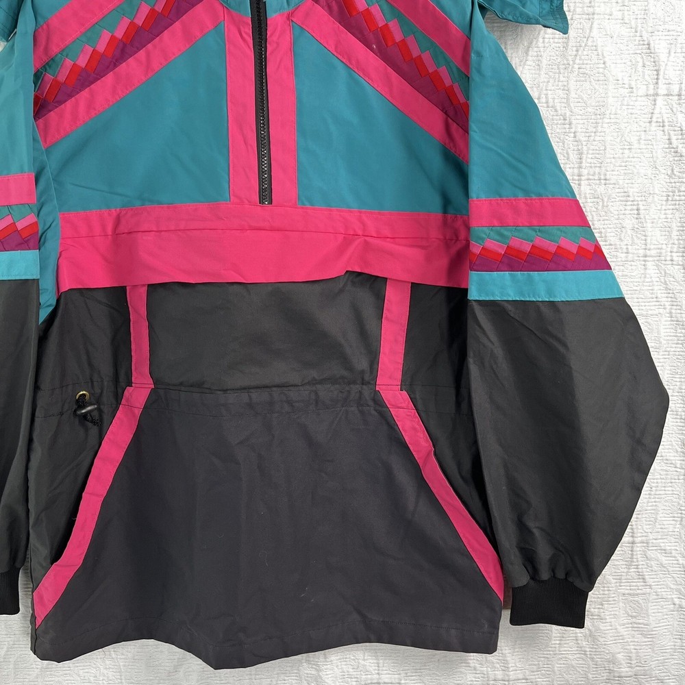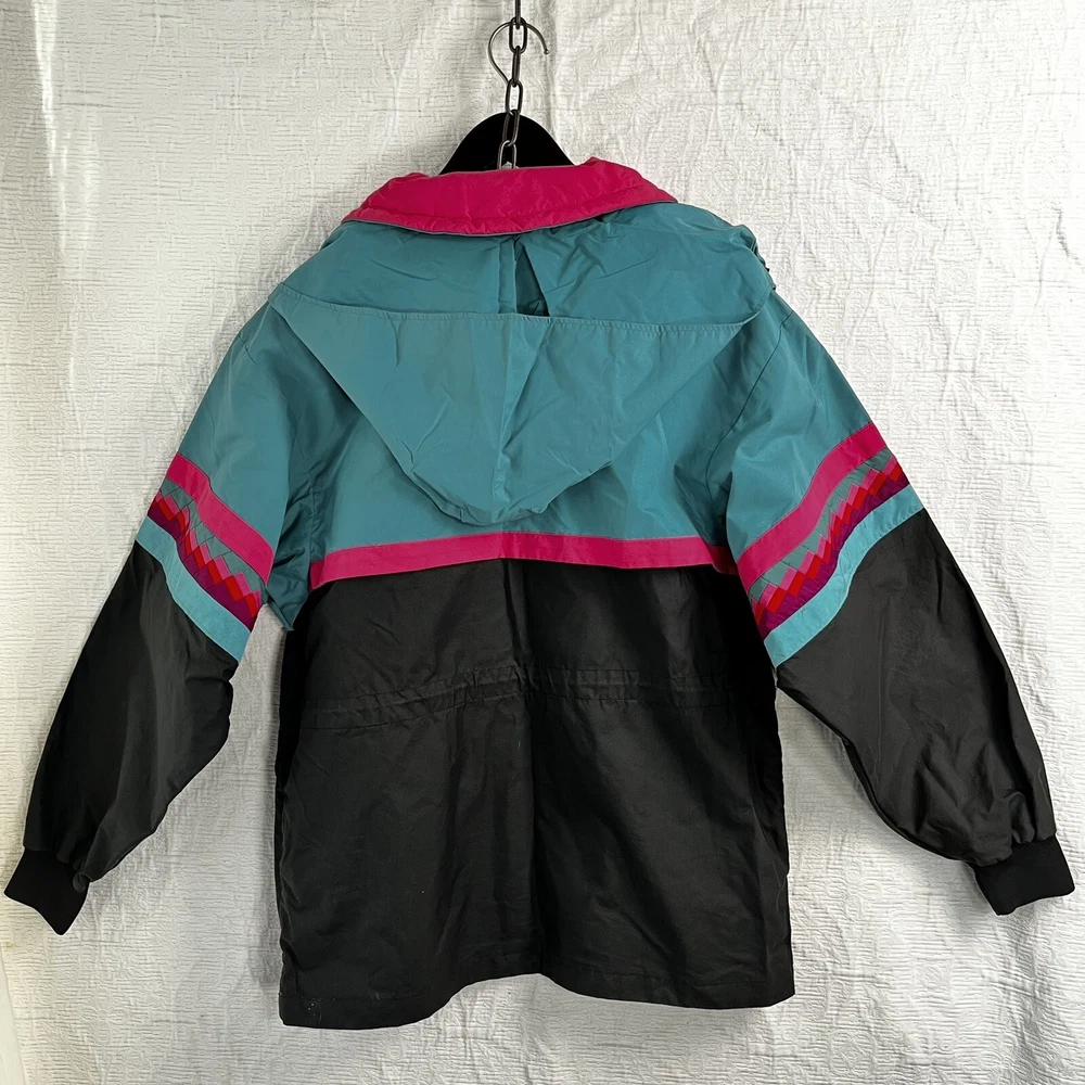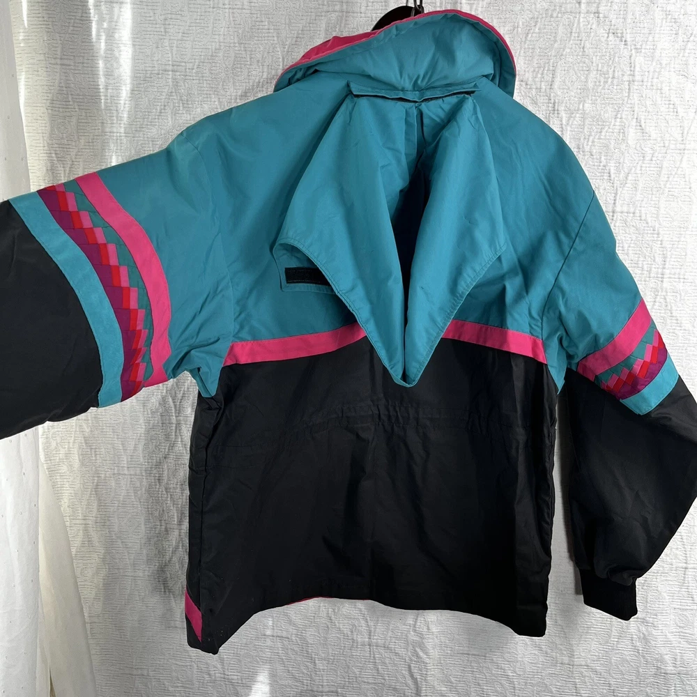 Wellspring Design Vintage Geometric Quilted Coat hand sewn by Phyllis Wells in Bozeman Montana size M chest 24” length 31” removable hood really good used condition no flaws found super late 80s early 90s ski culture x grandma corps quilting club.