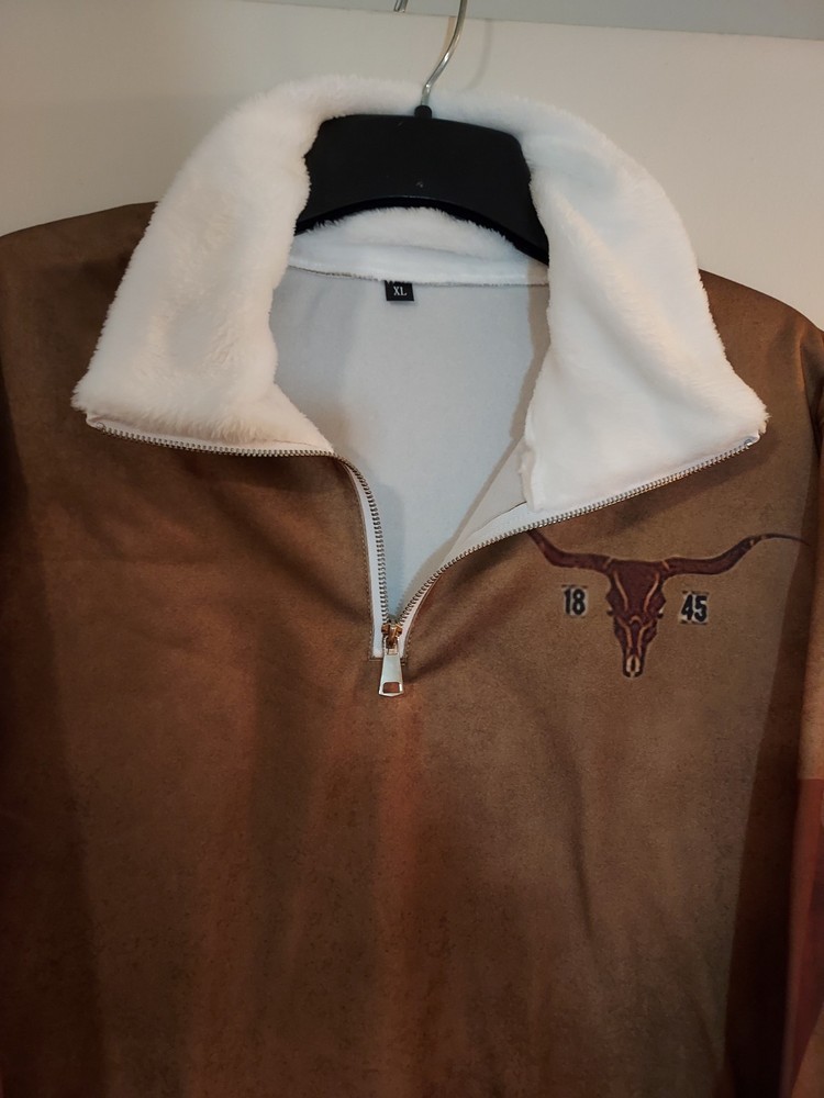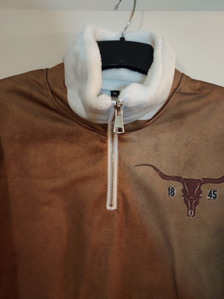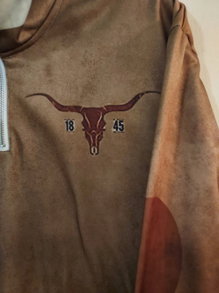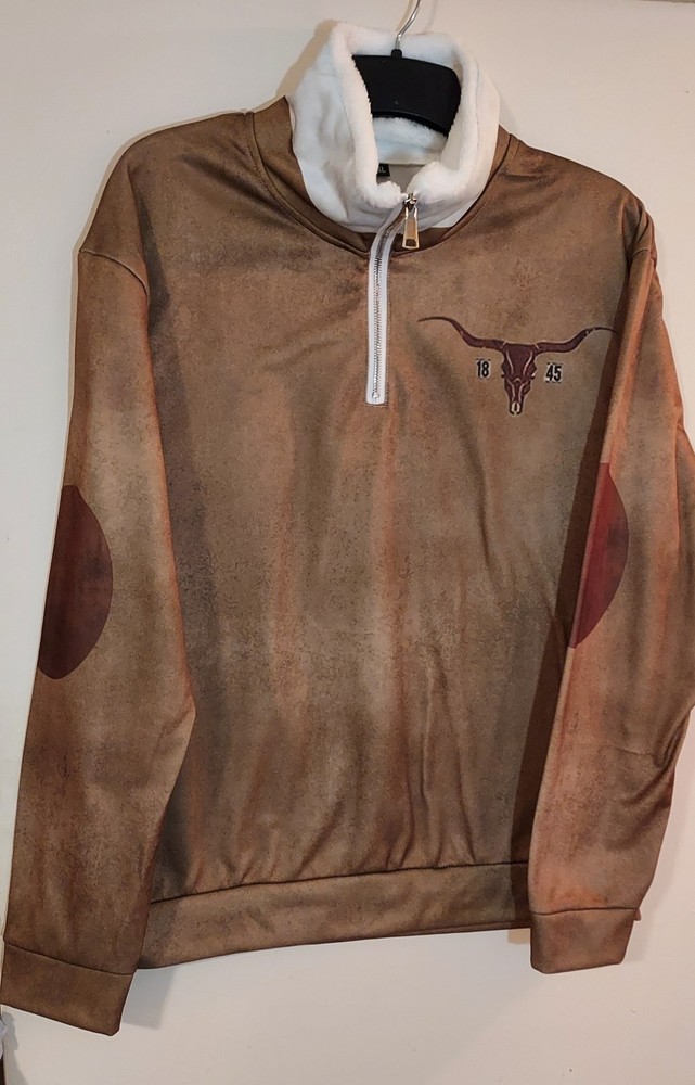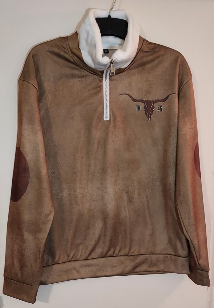 *Measurements* Pit To Pit: 24 inches Shoulder To Hem (Length): 27 inches Sleeve Length: 26 inches Get ready to ride in style with this cozy Western Sweatshirt. Featuring a brown and white solid pattern with a longhorn steer cowboy logo, this pullover is perfect for any outdoor activity. Made from 100% polyester, this sweatshirt is machine washable and features a hooded neckline with a 1/4 zip closure. The long sleeve sweatshirt is perfect for walking or hiking in the fall or winter seasons. With a regular fit and size type, this sweatshirt is breathable and has a Western, Cowboy, and Outdoor theme. Accented with a zipper and logo, this sweatshirt is a must-have for any cowboy's wardrobe.
