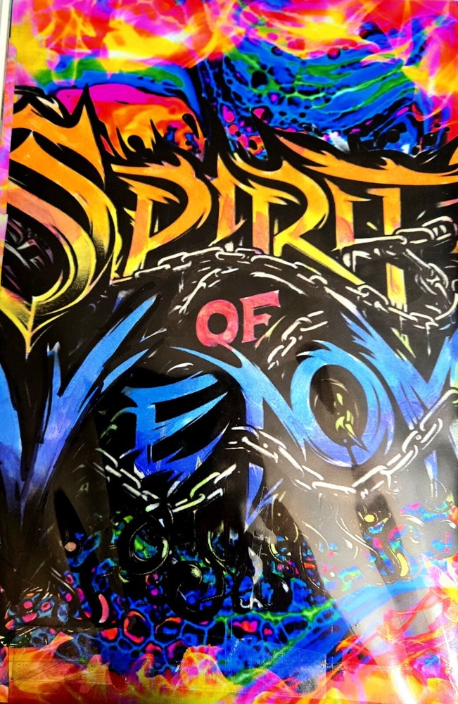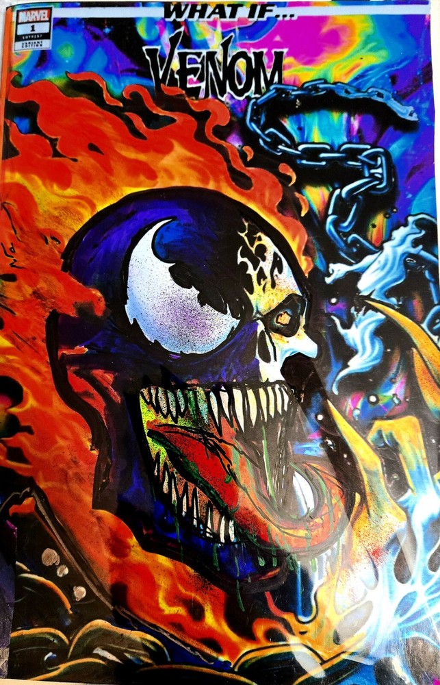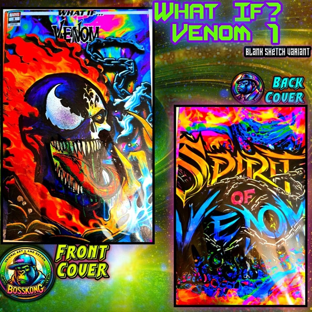 What If? Venom #1 – Custom BossKong Cover Art – One-of-a-Kind Graffiti Style Variant Up for grabs is a jaw-dropping custom comic book featuring What If? Venom #1, with both the front and back cover hand-illustrated by the renowned underground artist BossKong. This unique piece showcases a hyper-stylized fusion of graffiti, airbrush, and street art influences, delivering an electrifying reinterpretation of the iconic Marvel character. Front Cover Description: The cover explodes with BossKong's signature graffiti-toon style, featuring Venom in a terrifying fusion with Ghost Rider elements. Venom's symbiote skull is engulfed in raging flames, with oversized, razor-sharp teeth and his signature sinister grin dripping with eerie intensity. The bold, psychedelic background adds an extra dimension of chaos and energy, making this piece a standout in any collection. Back Cover Description: The back cover continues the high-octane theme with the title "Spirit of Venom" written in bold, stylized graffiti font. Chains snake through the letters, entangled in the symbiotic darkness, while the neon-like background pulses with high-contrast hues and intricate details. The artwork flows seamlessly from the front, making this a true masterpiece for Venom and Ghost Rider fans alike. Item Details: Title: What If? Venom #1 Artist: BossKong Condition: Near Mint (Comic preserved in protective sleeve) Medium: Mixed media on official Marvel comic Signed: No (Artist known for signature-free style) Ships: Bagged and boarded, secure packaging for collectors Don't miss your chance to own this one-of-a-kind collectible, perfect for Venom fans, comic enthusiasts, and street art aesthetics!
