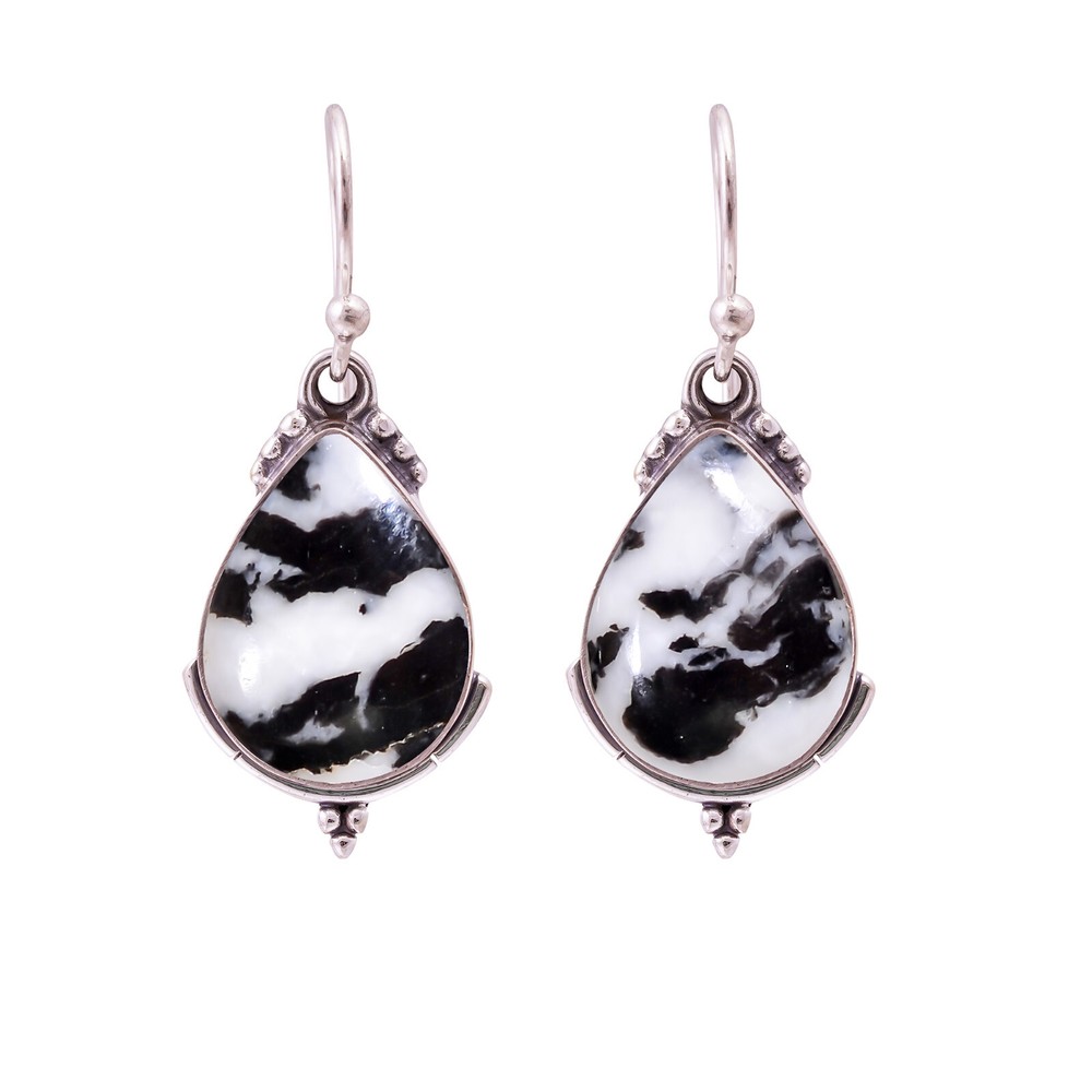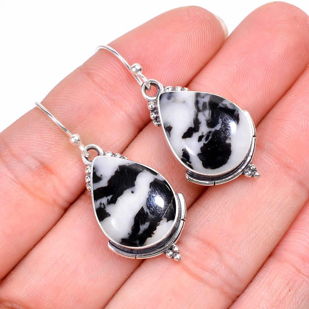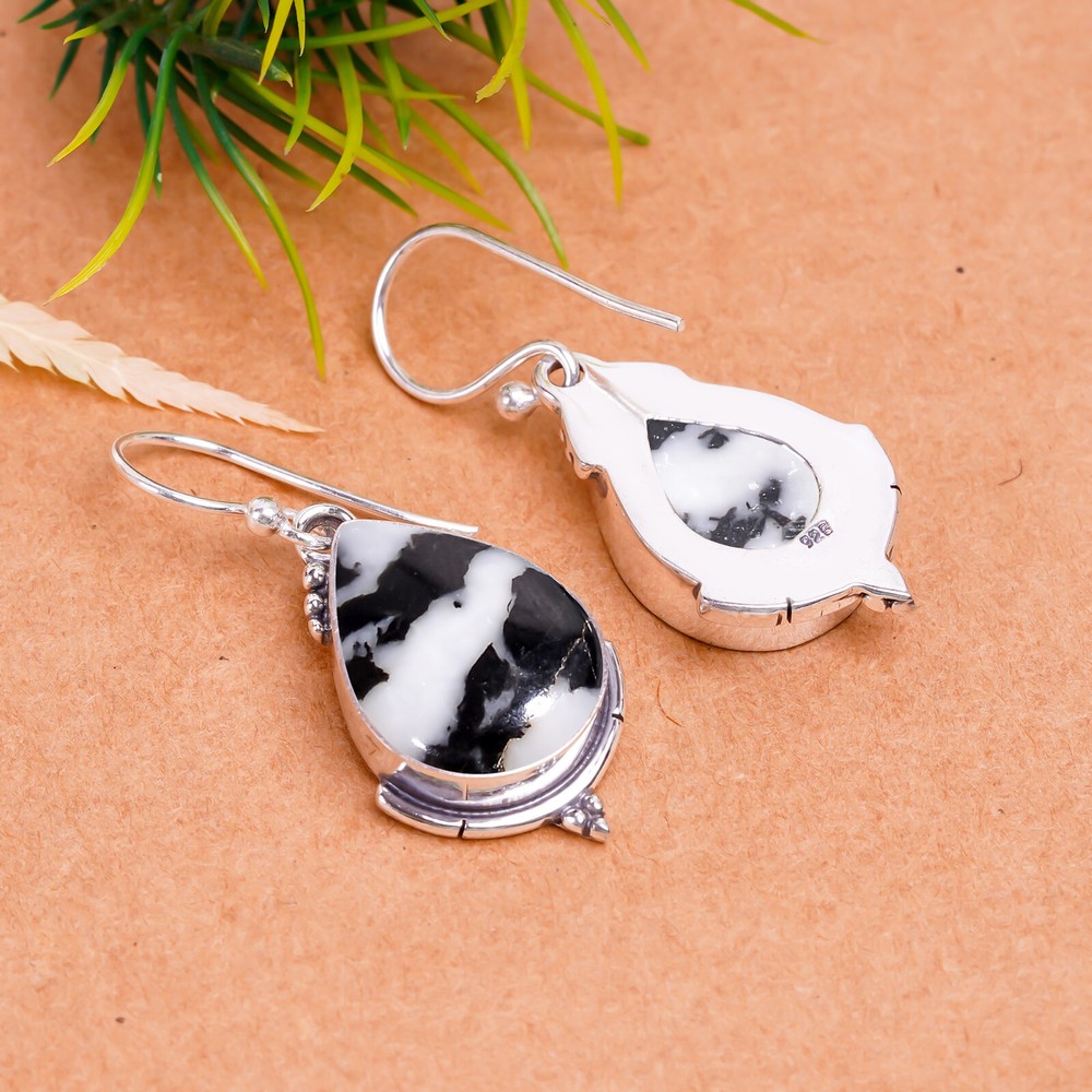 Note: Due to the natural formation of this gemstone. Slight variation in design and color are to be expected. Get this exotic and trendy 925 Sterling Silver Earrings studded with Turquoise that will provide you a classy look. Flaunt your style and fashion with this stunning ornament. Handmade Earrings Gemstone : Turquoise Stone Color : White & Black Stone Shape : Pear Stone Size: 18x13 MM Metal Purity : 925 Sterling Silver Length : 1.60" Width: 0.63 Weight : 42.75 Carat *Benefits Of Wearing Silver As a metal, silver has significant health benefits that have been used across cultures for centuries. Silver has a proven track record as a powerful antimicrobial agent fighting infections and aiding in cold and flu prevention, wound healing, and more. Silver also helps with internal heat regulation and circulation.