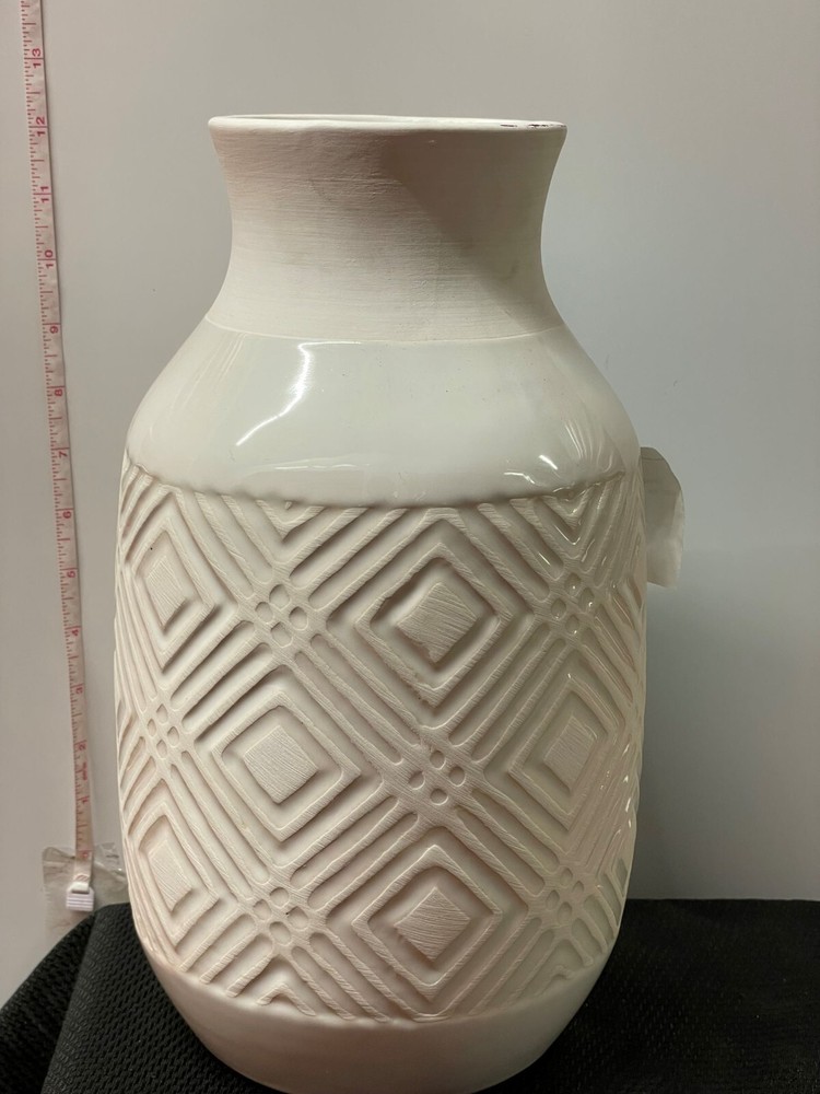 Add style to any room w this beautiful vase. Color: White Etched Diamond Design Size: 7.5in x 7.5in x 13in Material: Ceramic Brand: Pier 1 Imports...