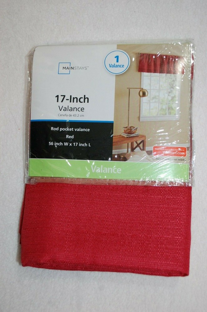 Window Valance Size: 17 inches long, 56 inches wide Brand: Mainstays Material: 100% polyester Red window valance, woven type fabric, rod pocket - quantity 1...