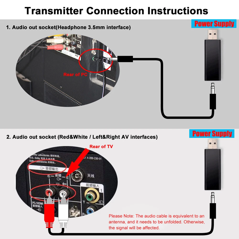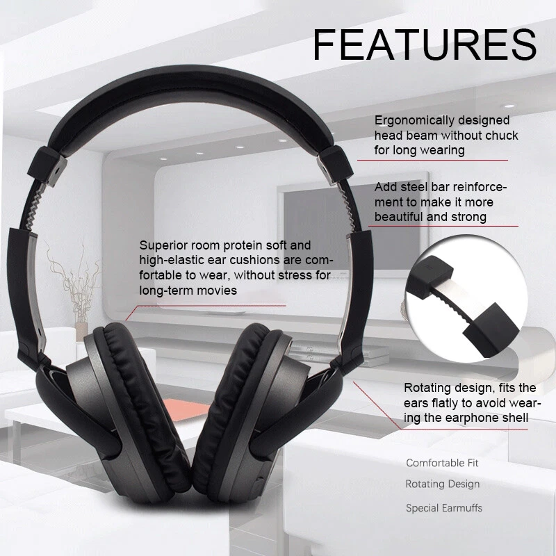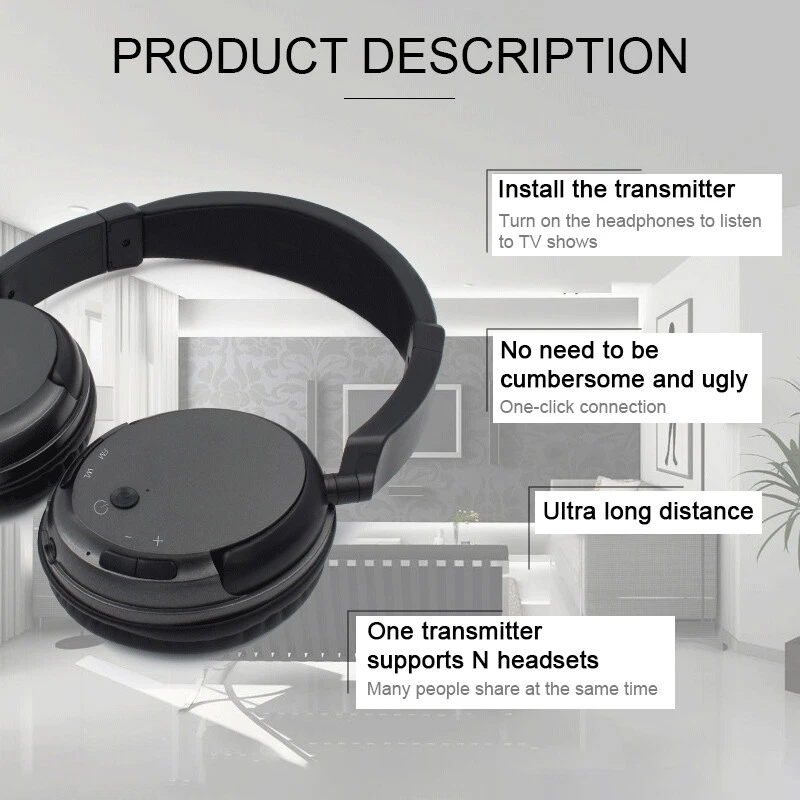 Overview: The transmission distance of this headphone is up to 30 meters, quite wider than other wireless technologies. It is a headset developed for TV, which has fast transmission speed and solves the problem of unsynchronized sound and picture. High-quality sound with intelligent noise cancellation, it brings you vivid and shocking sound, lets you enjoy cinema sound effect at home. With a 3.5mm audio cable and an RCA audio adapter, it also supports wired connection, widely compatible with 3.5mm and RCA audio devices. It also supports FM Radio mode. With a built-in battery in the headphone, it can serve you for a long time. This headphone has an adjustable headband and ultra-soft sponge over-ear pads, comfortable for long time wearing, suitable for TV-watching. Features: * The transmission distance of this headphone is up to 30 meters, quite wider than other wireless technologies. * High-quality sound with intelligent noise cancellation, it brings you vivid and shocking sound, lets you enjoy cinema sound effect at home. * With a 3.5mm audio cable and an RCA audio adapter, it also supports wired connection, widely compatible with 3.5mm and RCA audio devices, such as TV, PC, Phones, etc. * It also supports FM Radio mode, which is convenient for travelling. You can wear it enjoy music, TV shows, movies without disturbing your little ones studying or sleeping. * This headphone has an adjustable headband and ultra-soft sponge over-ear pads, comfortable for long time wearing, suitable for watching TV. Specification: Model Number: KST-900ST Reception Mode: FM Frequency Range: 88-108MHz Distortion: 1% Frequency Response Range: 20Hz-20KHz Impedance: 32Ω Sensitivity: 100dB Speaker Size: Dia. 40mm Headphone battery: 3.7V/180mAh(included) Audio Input port: 3.5 mm earphone port Charging port: Micro USB port Color: Black Headphone Weight: Approx. 138g / 4.97oz Package Size: Approx. 22 * 19.8 * 5cm / 8.7 * 7.8 * 1.97in Package Weight: Approx. 300g / 10.6oz Package List: 1 * Headphone 1 * Transmitter with 3.5mm Audio Cable 1 * 3.5mm Audio Cable 1 * RCA Audio Adapter 1 * Micro USB Charging Cables 1 * User Manual (English)