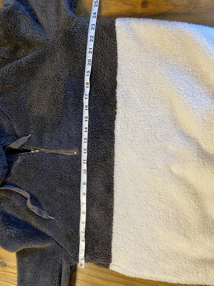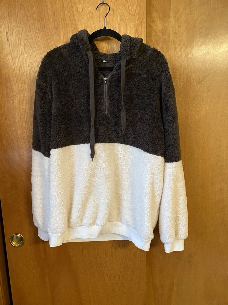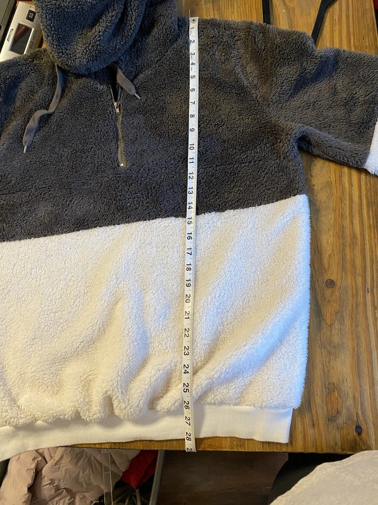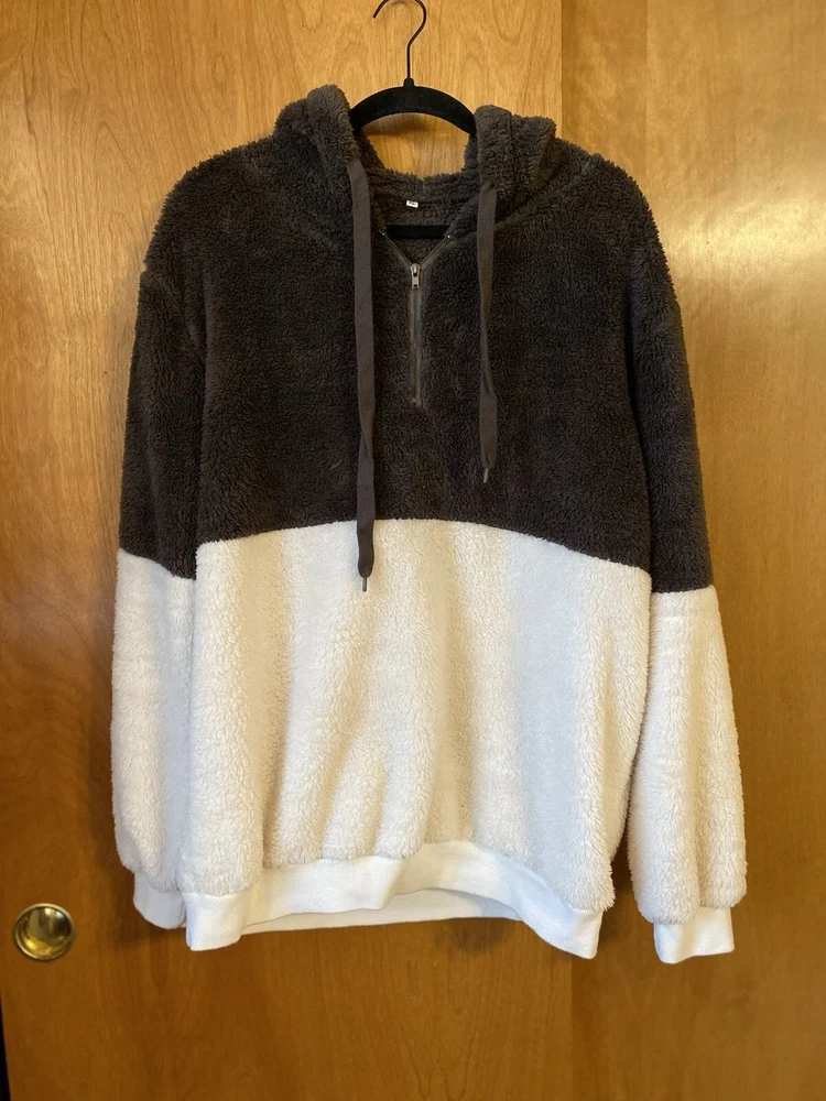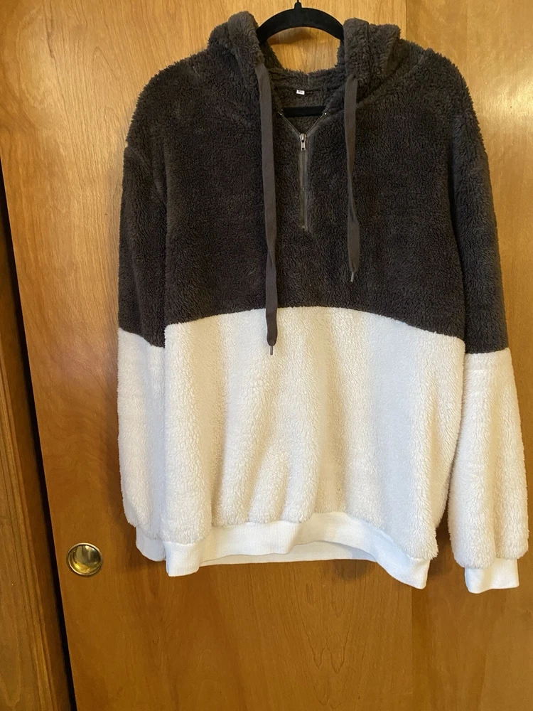 Stay warm and stylish with this woman's hoodie in size XL. The colorblock pattern in gray and white adds a touch of outdoor and classic theme to your travel, activewear, or casual outfit. The long sleeves and pullover closure make it easy to wear, while the 1/4 zip and faux sherpa fleece fabric provide lightweight warmth and comfort. This hoodie is machine washable and features stretch for added comfort. Perfect for gym and training, walking, running, and jogging in fall, winter, and spring. The hoodie also has accents of zipper and is suitable for regular fit. There is quite a bit of stretch to it.