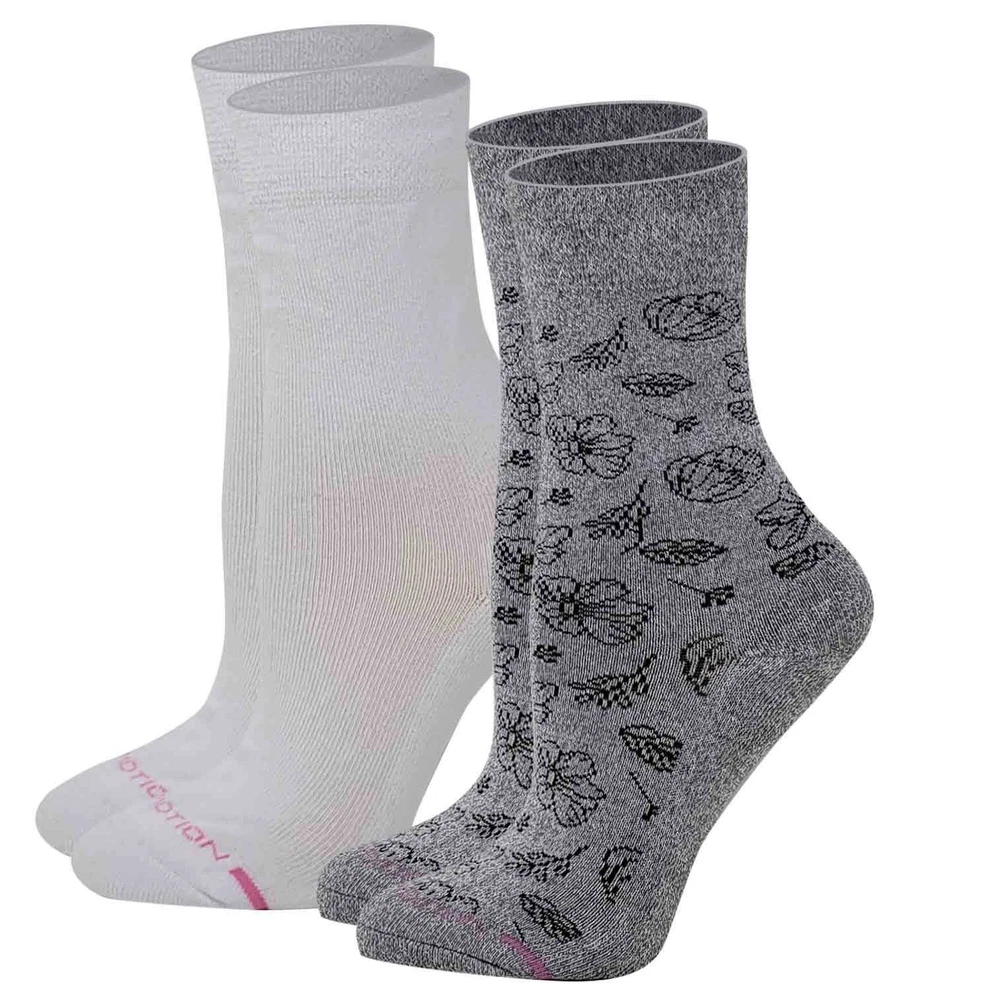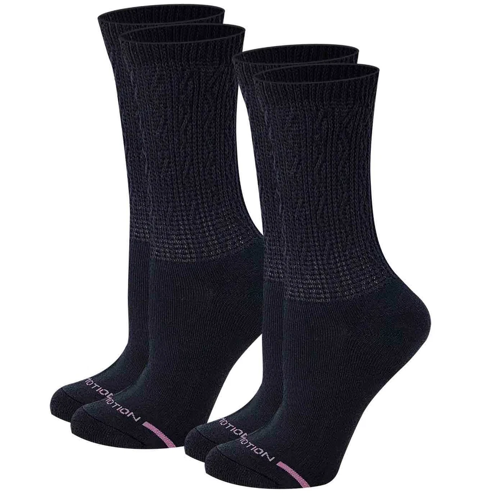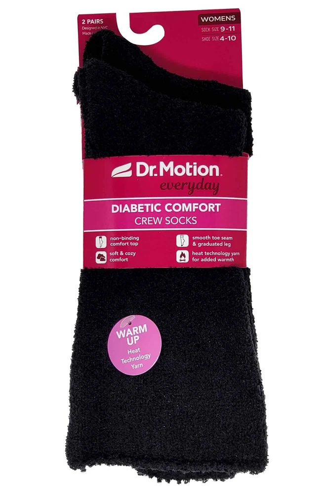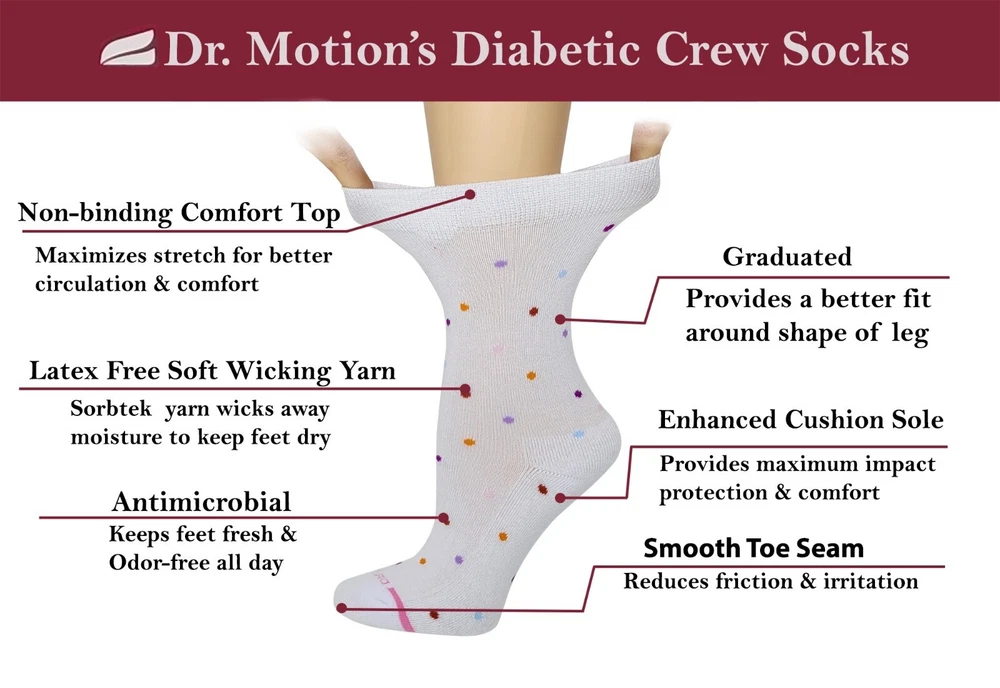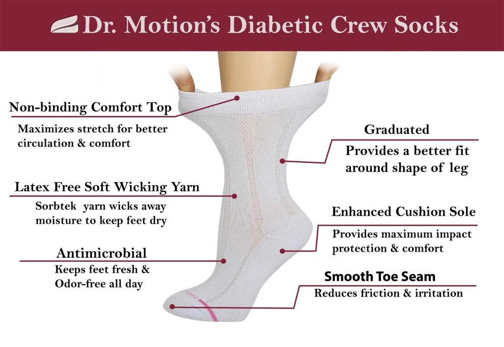 Dr Motion Super Cozy Crew Diabetic Socks for women offer diabetics the ultimate in foot care. Crafted with Non-binding Lycra and a graduated cuff for unrestricted circulation and maximum stretch, these socks are designed to provide a better fit around the leg and help maintain an ideal temperature for feet. Added cushion provides maximum impact protection and comfort, while the Sorbtek yarn blend wicks away moisture to keep feet dry. Last, but not least, the smooth toe seam reduces friction and irritation. Gender: Female Smooth toe seam reduces friction & irritation Pack: 2 ( Two ) Sock size 9-11 ( Fit shoe size 4-10 ) Anti-microbial & anti-odor Contents: 51% Nylon | 42% Cotton | 6% Spandex | 1% Polyester Track Page Views With Auctiva's Counter