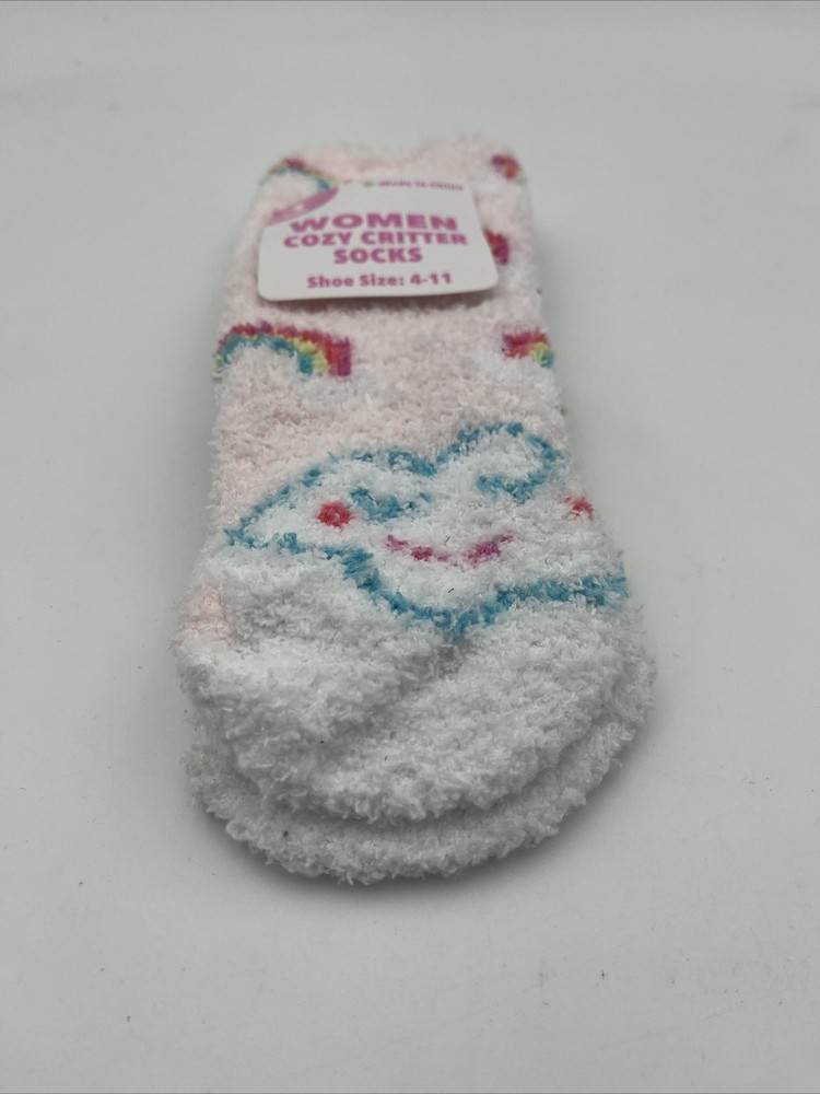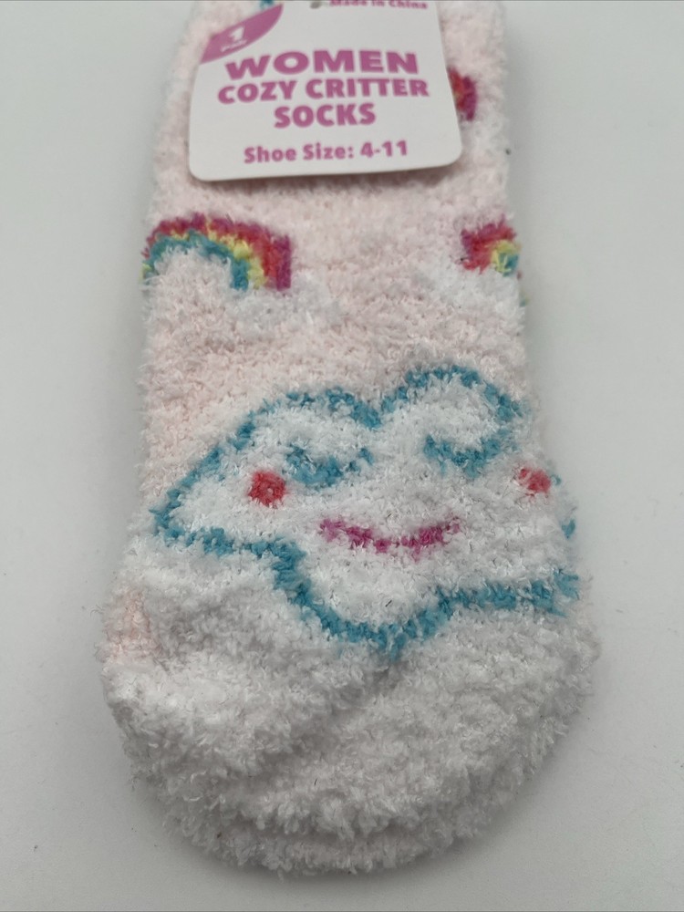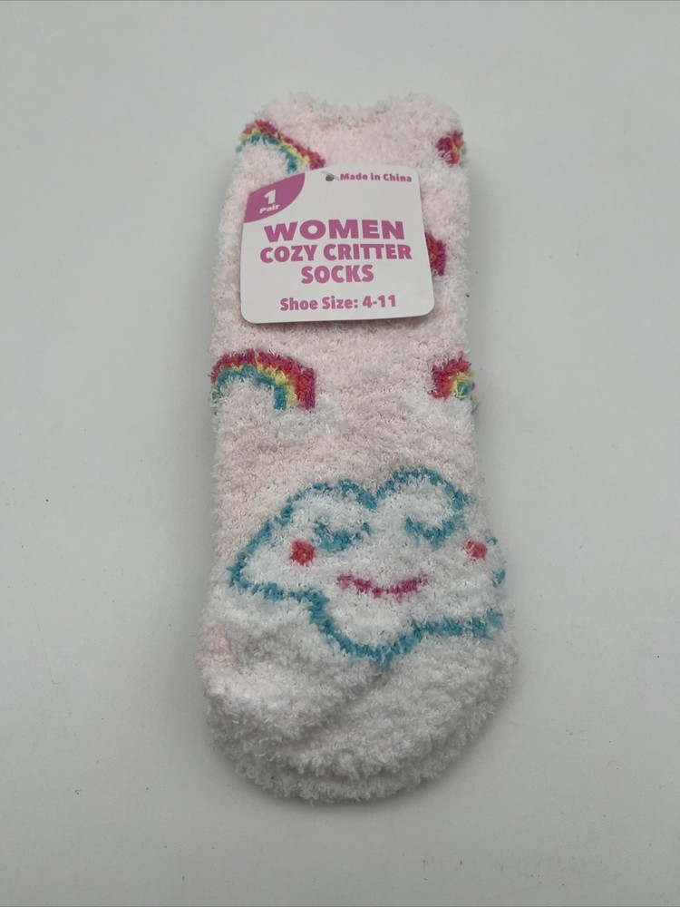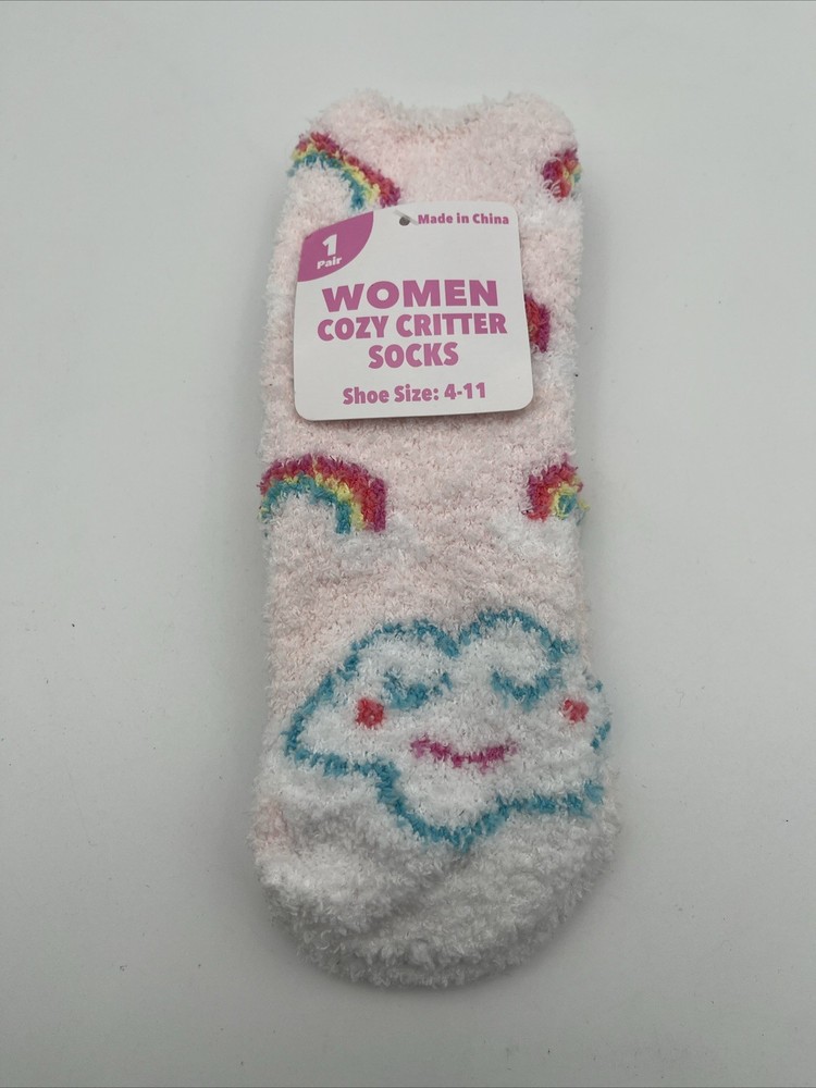 The Women Cozy Critter Socks in size 4-11 are a colorful and cozy addition to any woman's wardrobe. With a vibrant rainbow color and fuzzy design, these socks bring both style and comfort. Perfect for adding a pop of color to any outfit, these cozy critter socks are sure to keep your feet warm and stylish. Get one pair of these colorful socks to brighten up your sock collection and add some fun to your wardrobe.