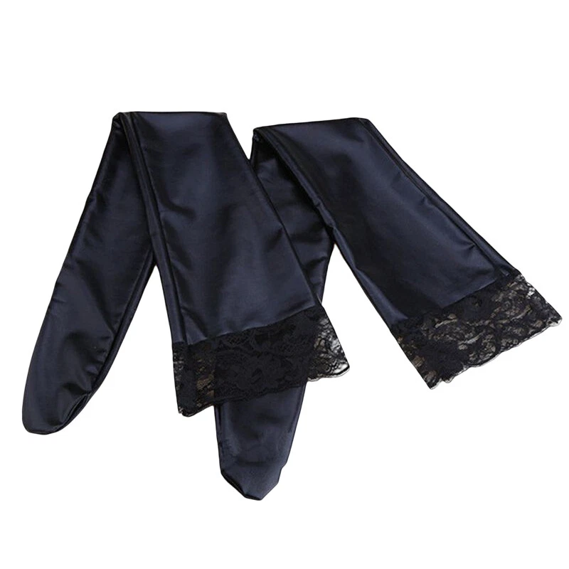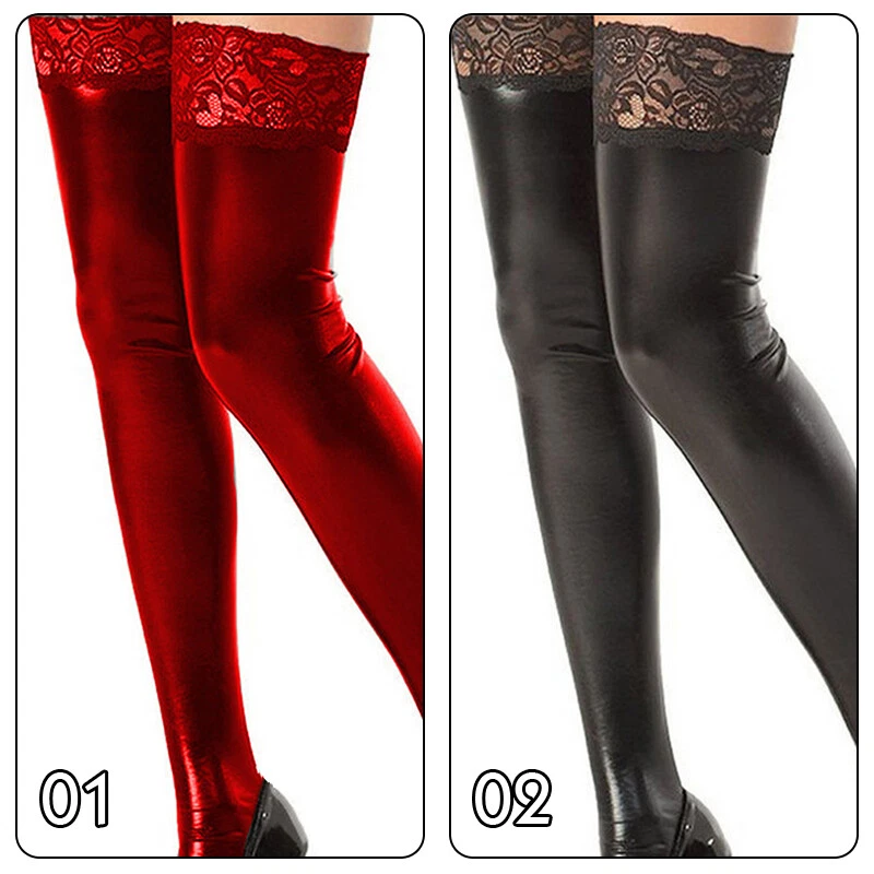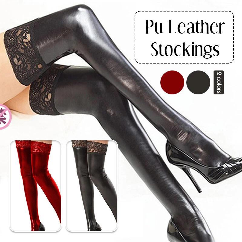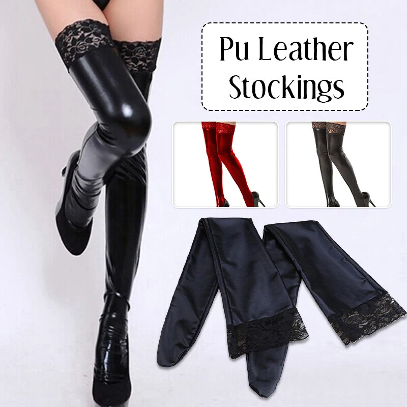 Material:faux leather Size:one sizehigh elasticfit most Sock leg circumference:38cm Height:80cm Weight:40KG-75KG Perfect for a gift