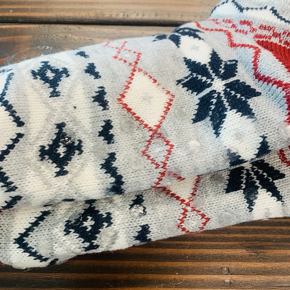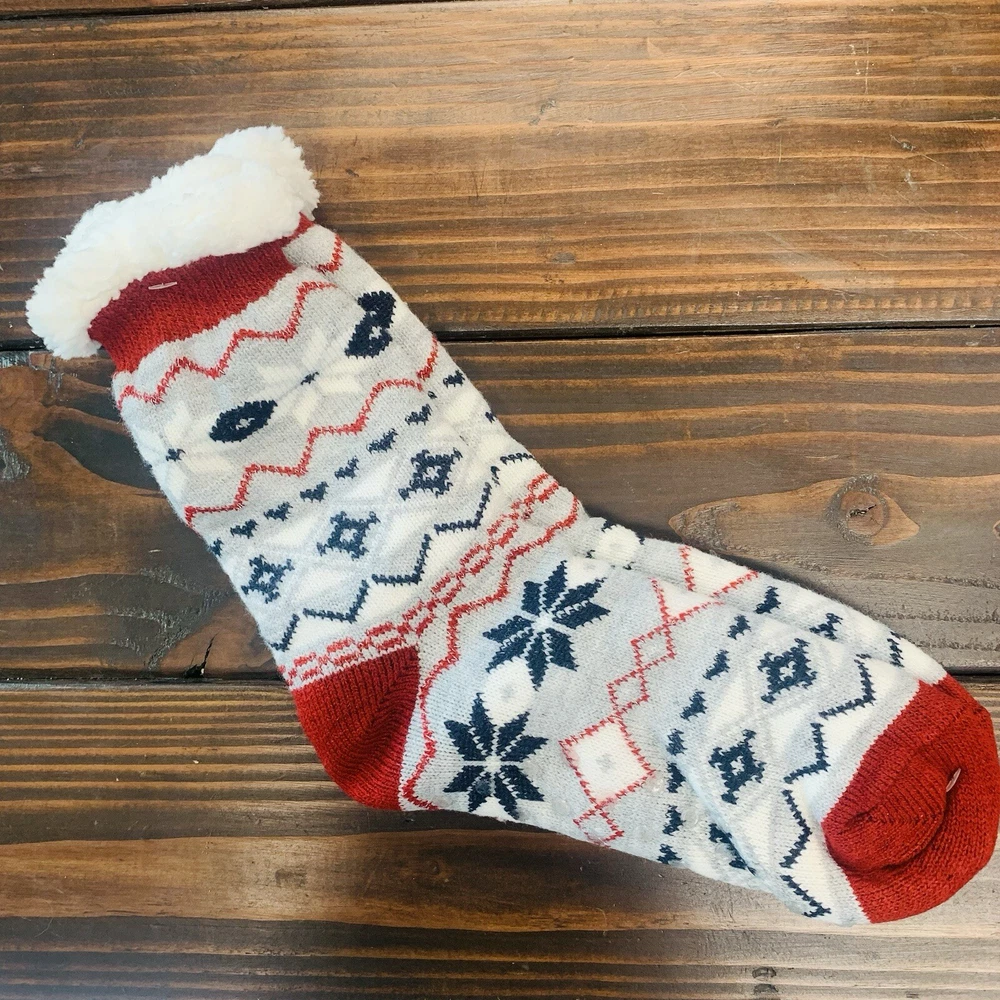Keep your feet warm and cozy with these Women's Winter Cozy Fuzzy Sherpa Fleece-lined Non-Skid Slipper Christmas Socks. Perfect for any occasion, these mid-calf socks feature a winter design and anti-slip properties, making them ideal for everyday wear, travel, and outdoor activities. Made from soft and super plush fleece material, these socks provide cushioning, and warmth, making them perfect for keeping warm at home. The thick and warm design makes them great for those chilly months. These socks come in a Nordic pattern and gray and red color, with a plush cuff for added comfort and style.