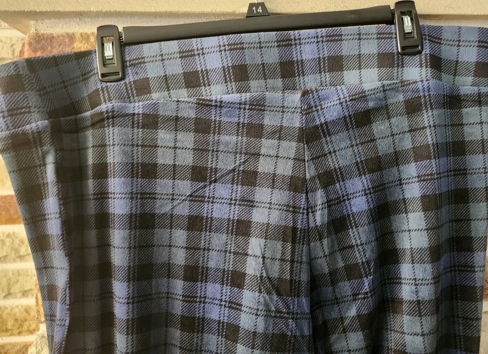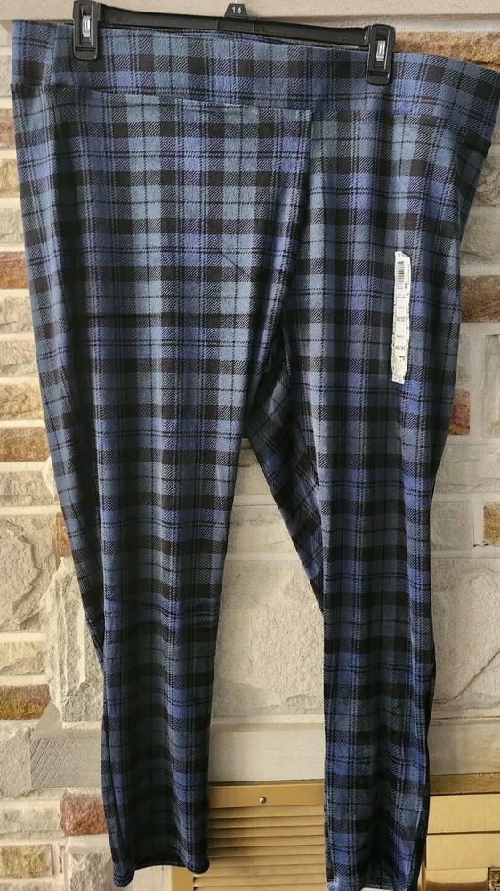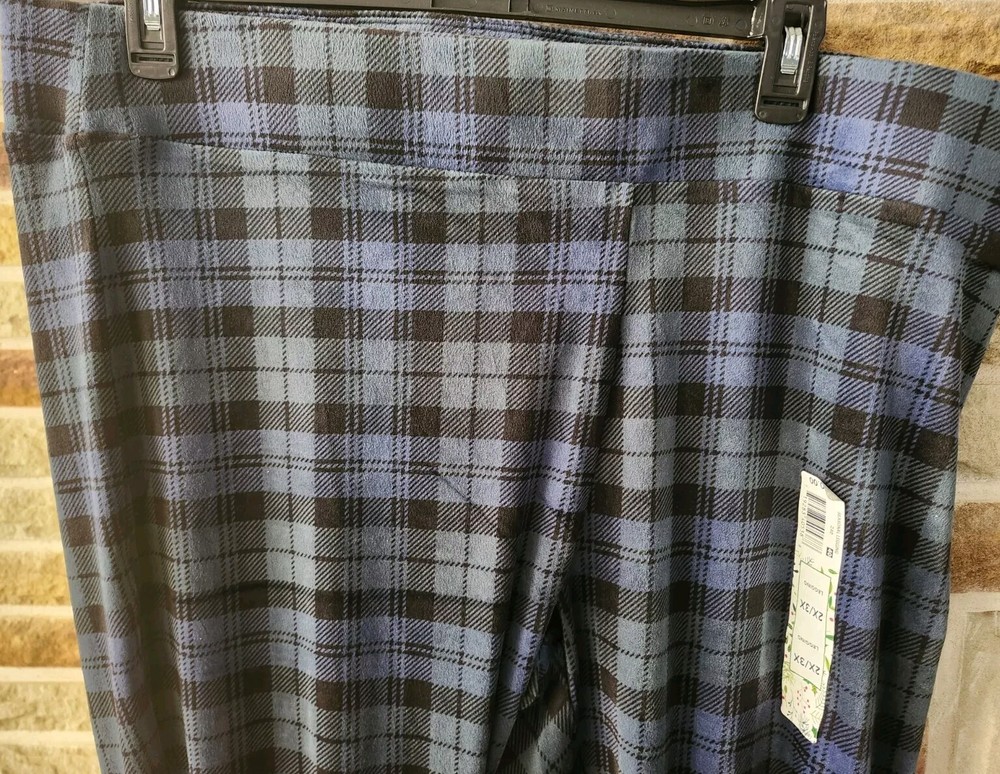 These Women's 2X/3X PAJAMA Leggings in Blue/Green plaid are designed for ultimate comfort and style. Made from 90% Polyester and 10% Spandex, they offer a cozy and soft feel, perfect for lounging or sleeping. The high rise fitted style and elastic waist provide a flattering fit, while the snowflake and pine tree theme adds a festive touch, making them ideal for the winter season. Machine washable for easy care, these leggings from the brand Tranquil and True are a must-have for any woman's wardrobe. New with Tags Waist 22.5 " Inseam 28"