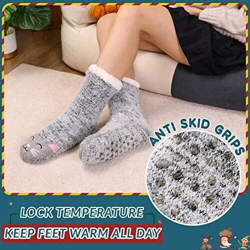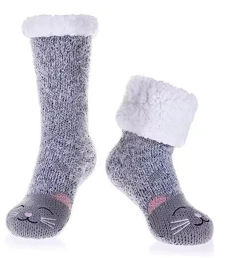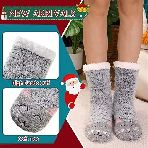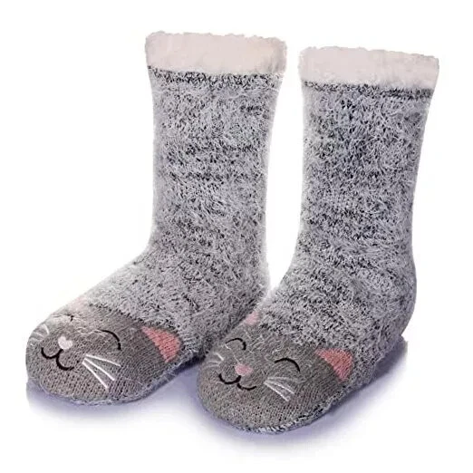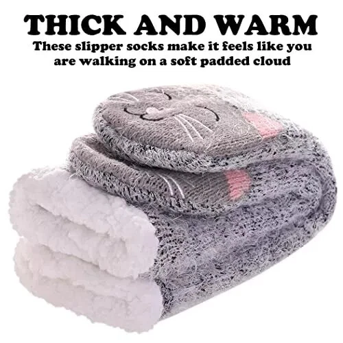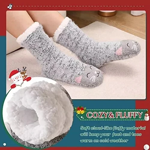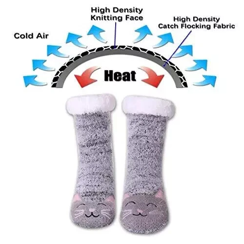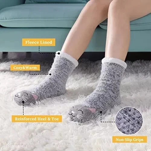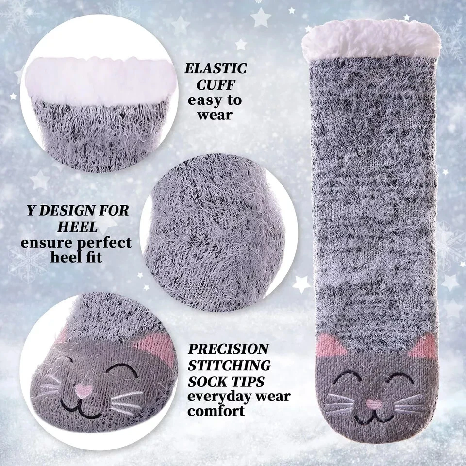 Women's Cat Slipper Socks With Grippers Cozy Fuzzy Soft Thick Winter Warm Soft cloud-like fluffy material will keep your feet and toes warm on cold weather! Fleece Lining is super soft and cozy. The soles have gripping rubber traction treads. 95% Polyester 5% Spandex Thank you for looking.