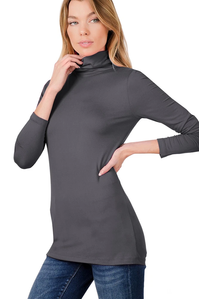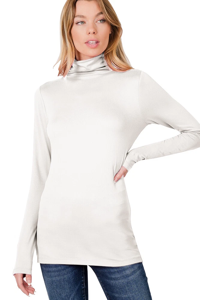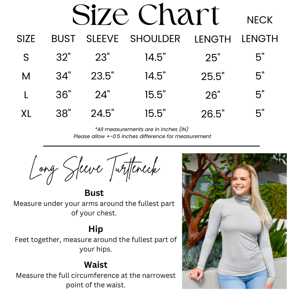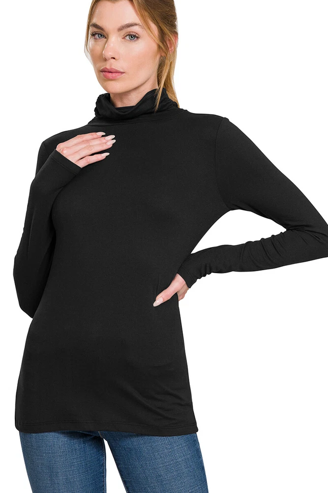 This Long Sleeve Turtle Neck Top is designed to keep you warm and comfortable. It features a classic turtle neck design made from a buttery soft, stretchy fabric for added comfort. Perfect for layering or for wearing on its own. Crafted from quality brushed microfiber fabric, this turtle neck top is designed to cocoon you in unparalleled comfort. Its buttery soft texture feels like a gentle embrace against your skin, making it the perfect choice for those seeking warmth and indulgence. The turtle neck design not only keeps you cozy but also adds a touch of elegance to your attire. Whether you're layering it under a blazer or wearing it solo, this top effortlessly elevates your fashion game while keeping you snug. Fabric: 90% Polyester | 10% Spandex | Brushed Microfiber Fabric Foldable Turtleneck Design for Subtle Style Stretchy | Buttery Soft | Comfortable | Falls to Mid Hip Great to keep you warm | Daily Wear | Long Sleeve