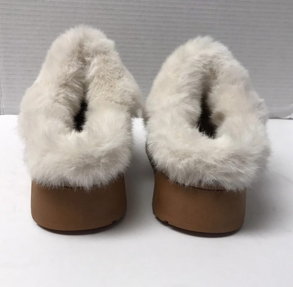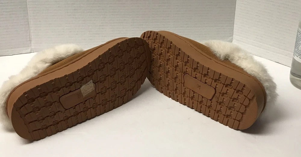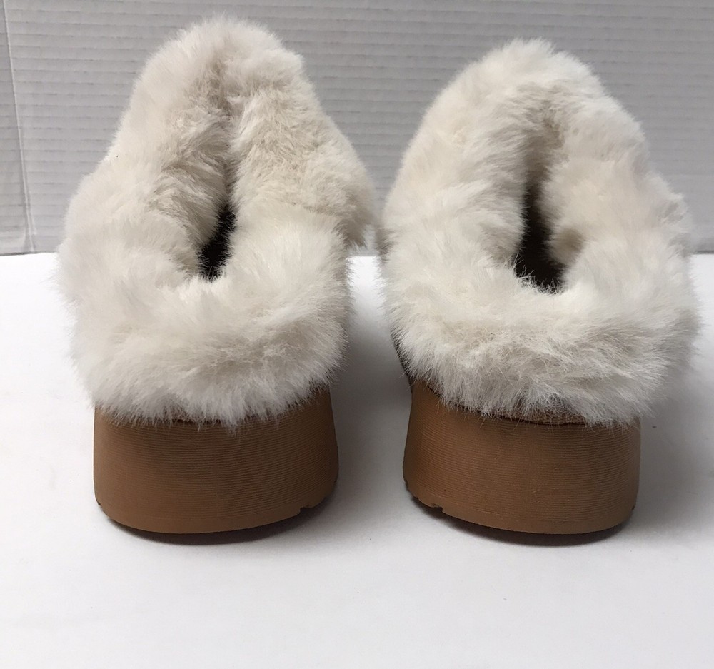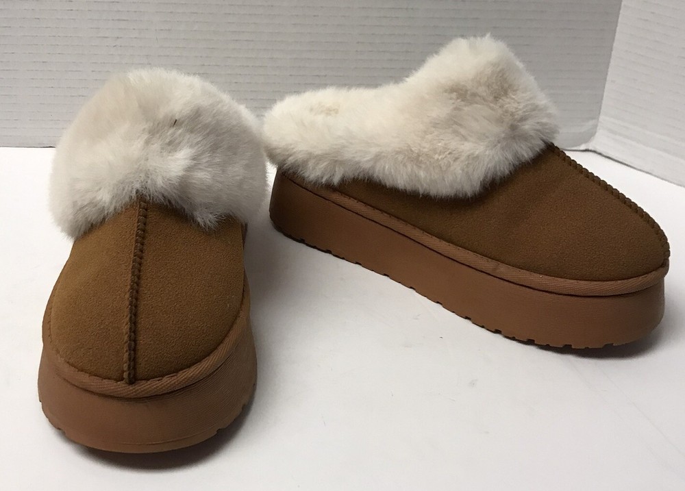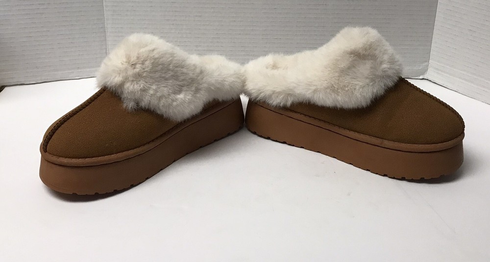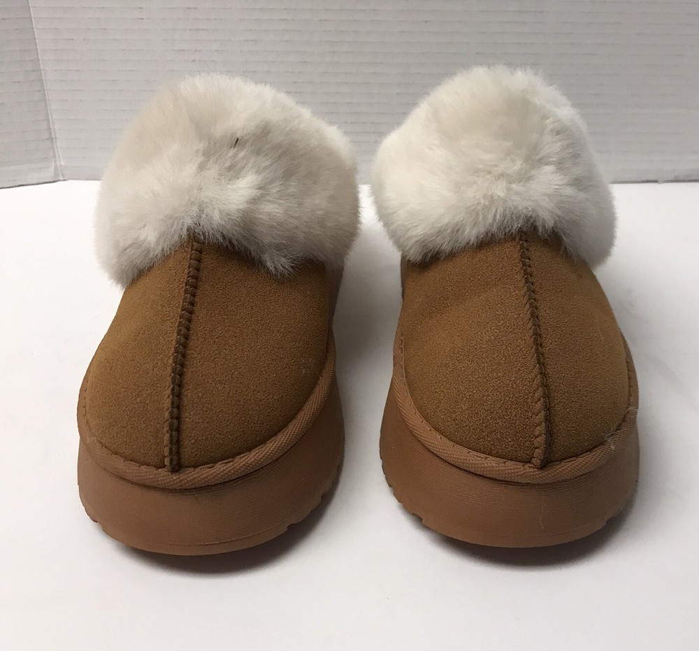 These women's slippers are a size 5.5 with a round toe shape and slip-on closure, perfect for casual wear during the winter season. The tan suede upper material is accented with faux fur trim for added warmth and style. The low heel height and rubber outsole provide comfort and traction. Lined with faux fur, these mules offer a cozy and fluffy feel, making them a great choice for keeping your feet warm during cold weather. Please see all pictures provided of this item for all details. Slippers are NEW without a box. Please ask all your questions about this item before purchasing to avoid unnecessary returns. Thank you very much.