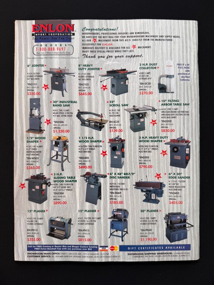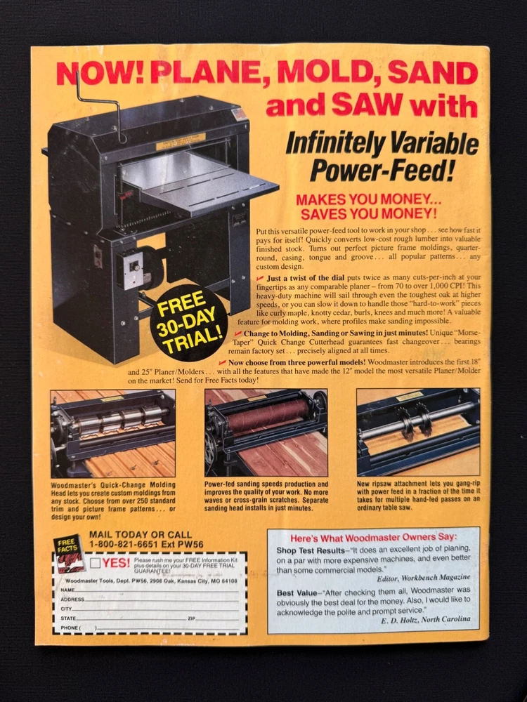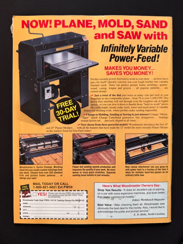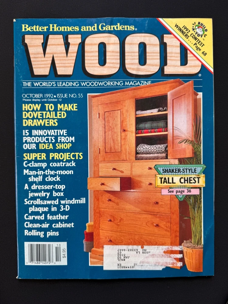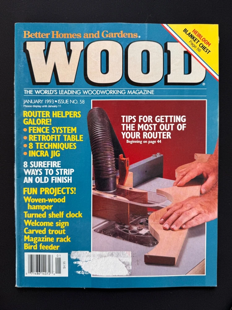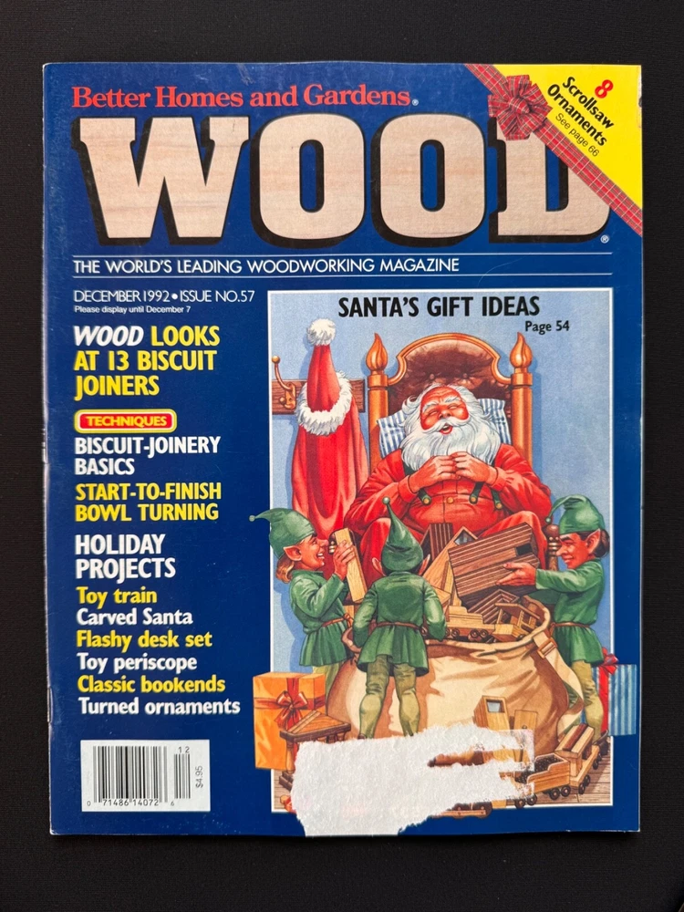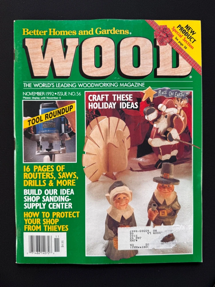 Welcome to my listing for WOOD Magazine – A Woodworker’s Essential! Each issue in this collection offers a treasure trove of woodworking inspiration, from detailed project plans and tool reviews to expert tips and tricks. Whether you're a seasoned craftsman or just beginning your woodworking journey, these magazines provide invaluable guidance to elevate your skills. Browse the drop-down menu above to select the issue that best suits your interests. Each option is detailed below with a description of its unique features and projects. 📚 Condition: All magazines are in very good to excellent condition , with minimal signs of handling consistent with their age. Some issues may have sticker residue or small areas of paper loss where previous address labels were removed, but this does not affect the readability or integrity of the magazines. Please see the photos for details. 📦 Packaging & Shipping: Each magazine will be bagged and boarded to protect it from moisture and bending, and carefully packaged for safe travels to your door. Combined shipping is available —just be sure to check out with all desired items together. Additional magazines ship for just $0.50 each! Thank you for browsing, and happy woodworking! 📖 Issue Descriptions WOOD Smart Shop Tips & Tricks (Volume 2) : Packed with 55 proven ideas to improve your woodworking skills. A must-have for shop enthusiasts! WOOD Magazine, October 1991 (Issue 46) : Features a stylish entertainment center project and tips for working with plywood and dado cutters. WOOD Magazine, November 1991 (Issue 47) – Products Guide : Discover 250 great woodworking products and tools for DIYers. WOOD Magazine, December 1991 (Issue 48) : Celebrate the holidays with stocking stuffers, Santa’s project parade, and mortise and tenon joinery. WOOD Magazine, January 1992 (Issue 49) : Includes step-by-step instructions for cabriole legs, along with sensational projects and classic woodworking techniques. WOOD Magazine, February 1992 (Issue 50) : Test 20 power mitersaws, learn chip carving from a pro, and explore a variety of creative projects. WOOD Magazine, June 1992 (Issue 52) : Build a supercomfy porch rocker, sharpen your carving tools, and enjoy summer project ideas. WOOD Magazine, August 1992 (Issue 53) : Includes plans for a punched-tin pie safe, school projects for woodworkers, and a variety of fun carving ideas. WOOD Magazine, September 1992 (Issue 54) : Take the tour of the idea shop, discover shop organization tips, and find inspiration for your next project. WOOD Magazine, October 1992 (Issue 55) : Build a shaker-style tall chest and explore creative woodworking projects from dovetailed drawers to rolling pins. WOOD Magazine, November 1992 (Issue 56) : Craft holiday-themed projects including charming pilgrim and Santa decorations. Includes a tool roundup! WOOD Magazine, December 1992 (Issue 57) : Get ready for the holidays with Santa’s project parade, biscuit-joinery techniques, and festive toy plans. WOOD Magazine, January 1993 (Issue 58) : Router tips galore, shop organization tricks, and project plans for woven hampers, magazine racks, and more. WOOD Magazine, February 1993 (Issue 59) : Features an elegant oak dining table project and articles on tablesaw safety, drying wood, and turning tools. Perfect for woodworking enthusiasts! WOOD Magazine, August 1993 (Issue 62) : Learn to make raised panels, explore summer project ideas, and build an oak-paneled desk. WOOD Magazine, September 1993 (Issue 63) : Features a mission-style tall clock project, clamp-storage ideas, epoxy finishes, and carving tips. WOOD Magazine, November 1993 (Issue 65) : Features a beautiful bow-front table project and a big 14-page tool-buyer’s guide. WOOD Magazine, February 1994 (Issue 68) : Learn to build a beautiful pine country cabinet and master dowel joints and transfer patterns. WOOD Magazine, May 2022 (Issue 281) : Features a floating-case accent table, buyer’s guide to benchtop CNCs, and plans for tabletop stands. WOOD Magazine, July 2024 (Issue 296) : Build a stunning veneer lamp, test benchtop router tables, and get plans for modular tool stands and more.